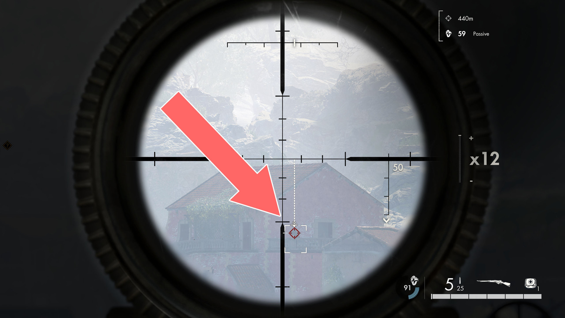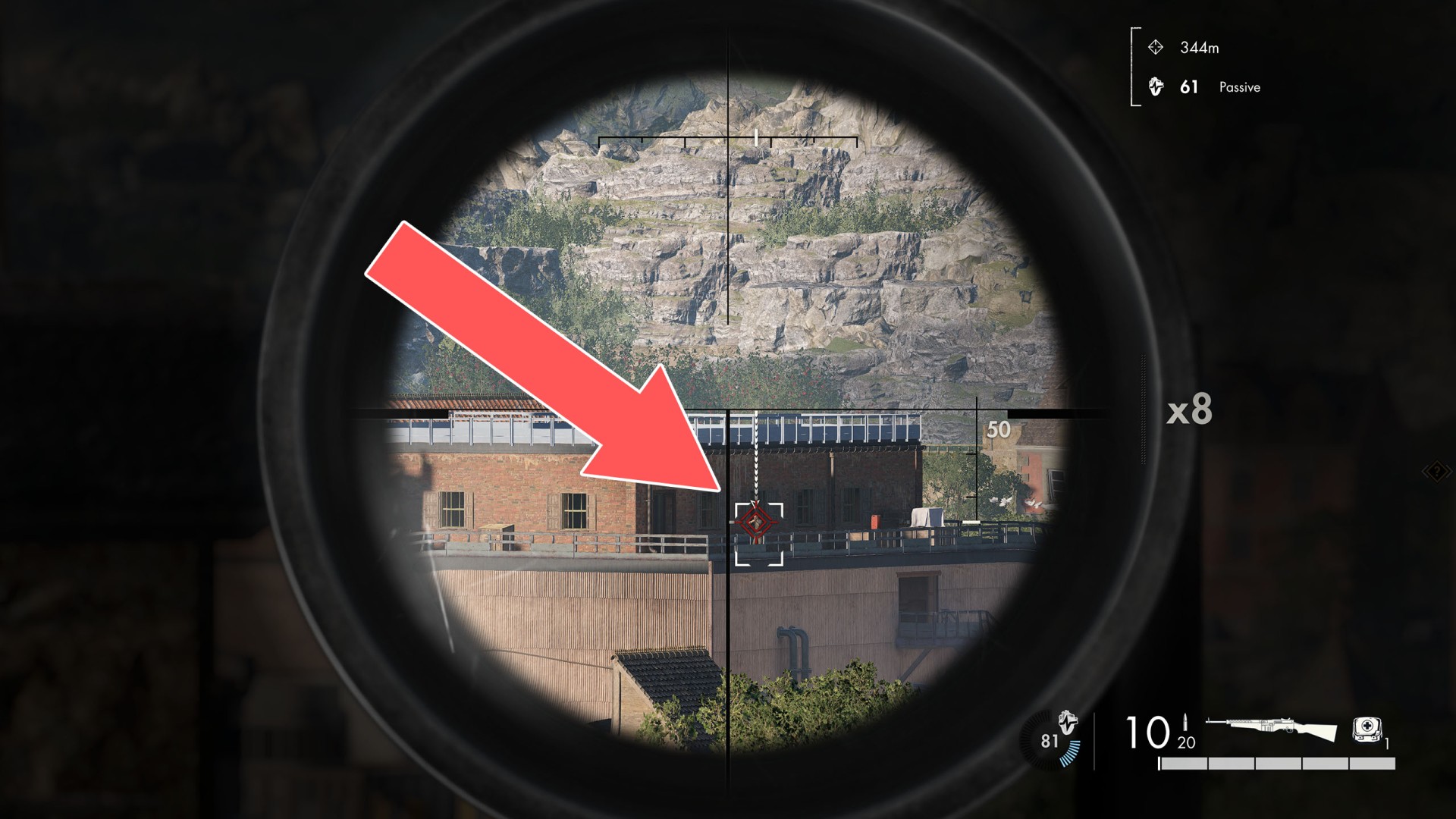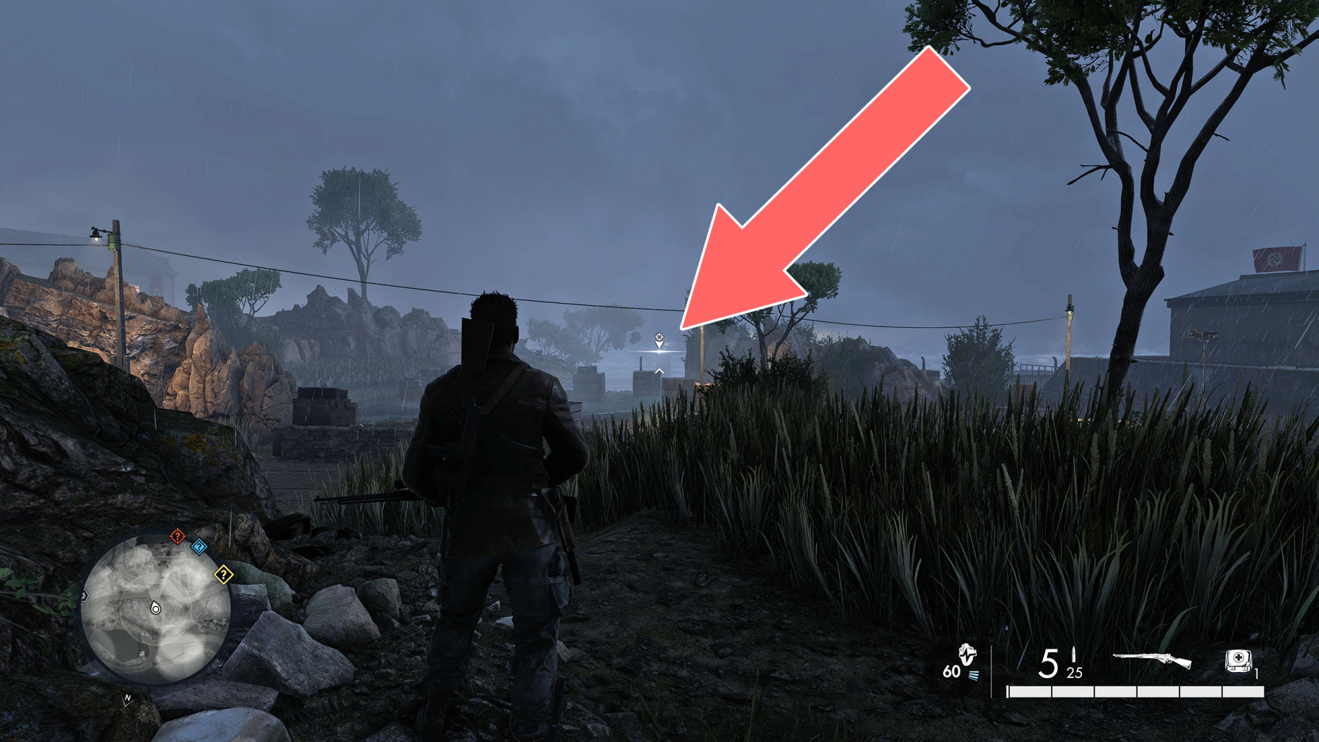 This shot is a bit more difficult because the target is hidden behind tree branches. The soldier is standing on the balcony of the bungalow.