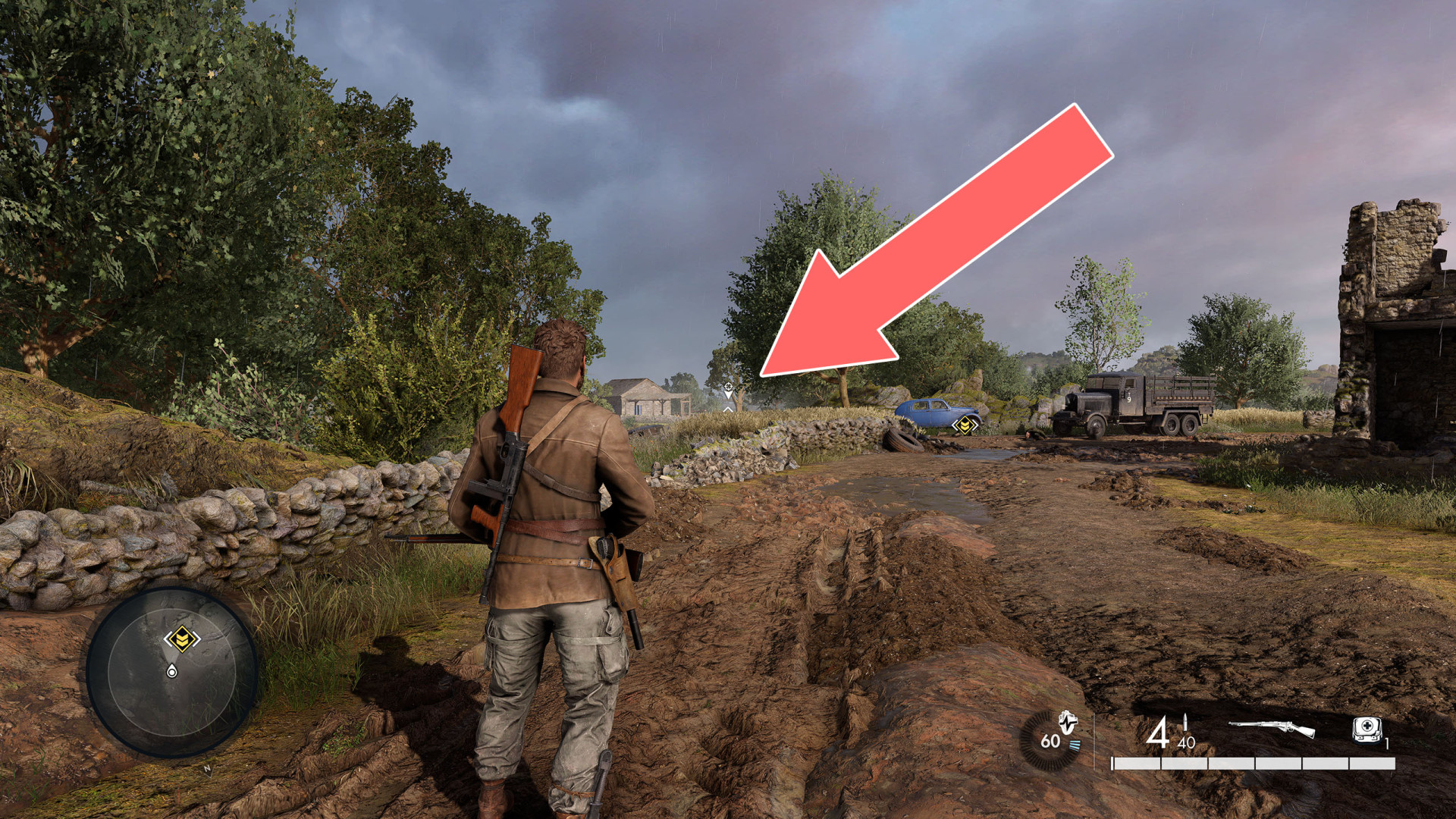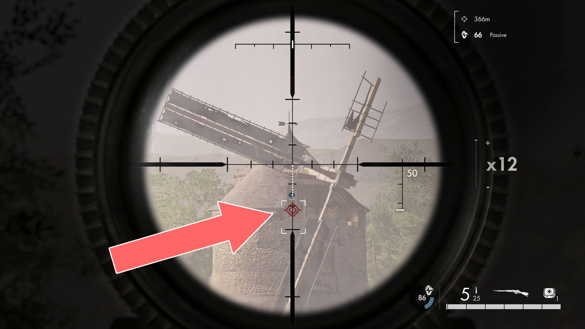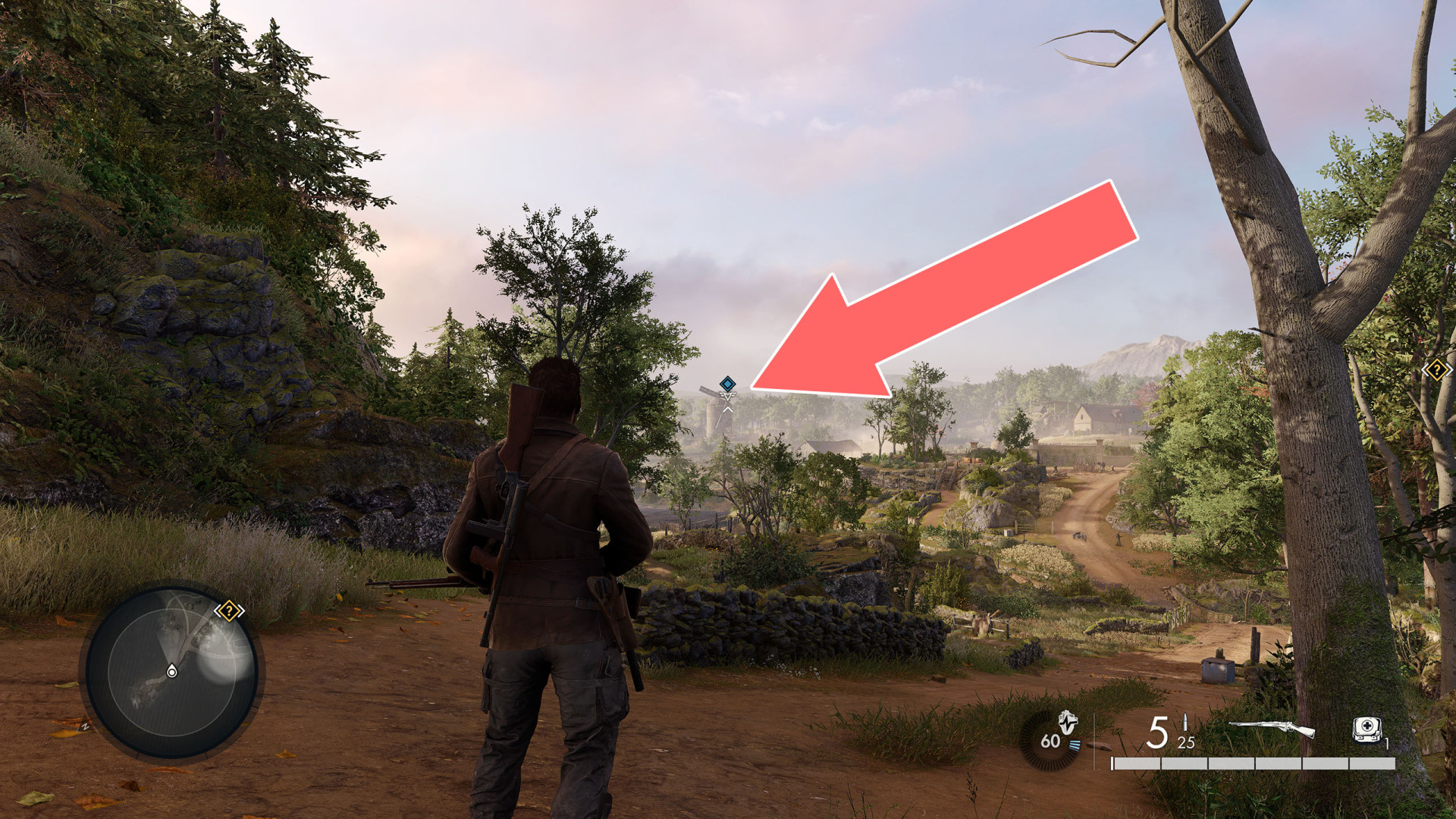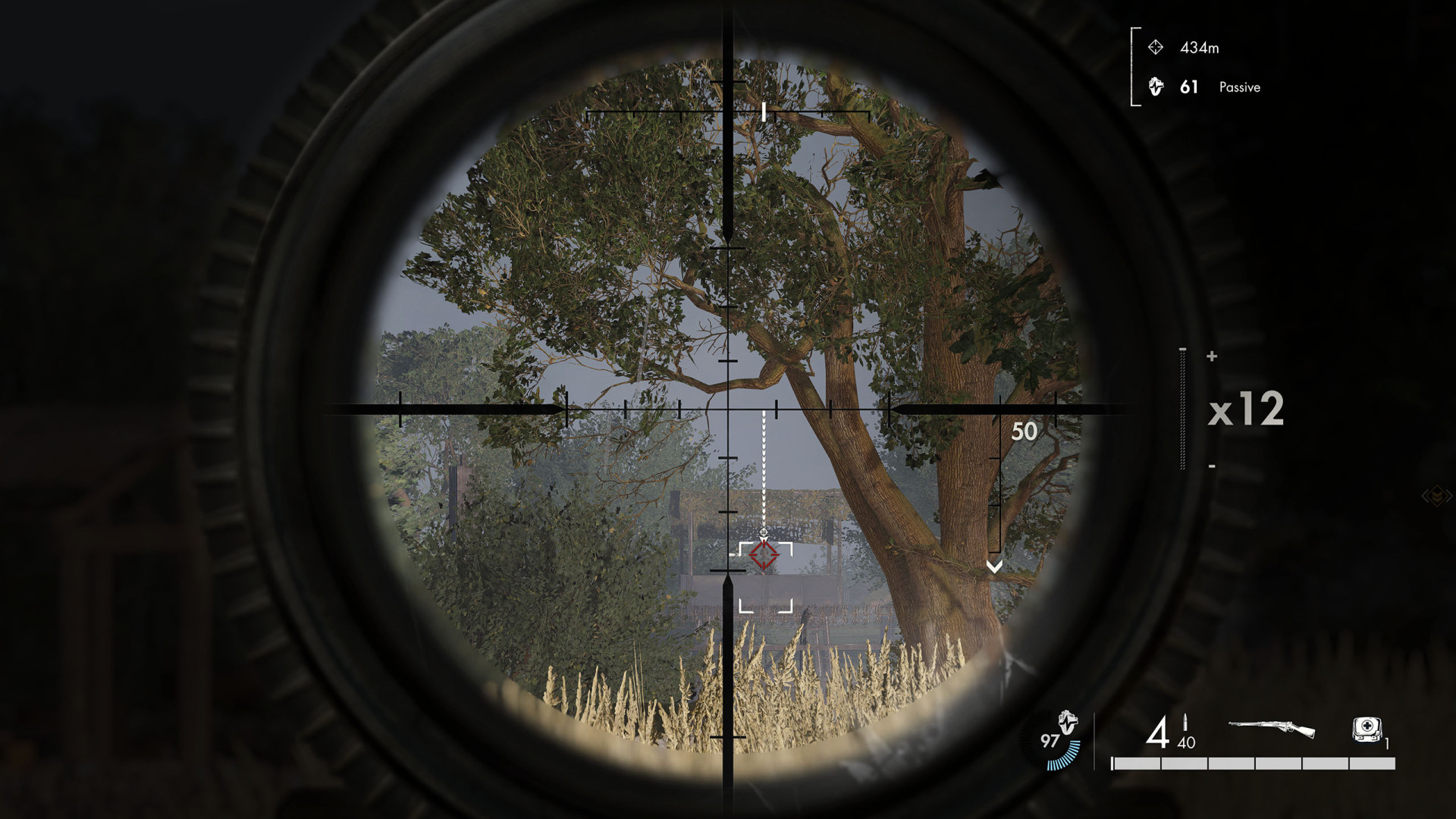This shot is a bit more difficult because the target is hidden behind tree branches. The soldier is standing on the balcony of the bungalow.