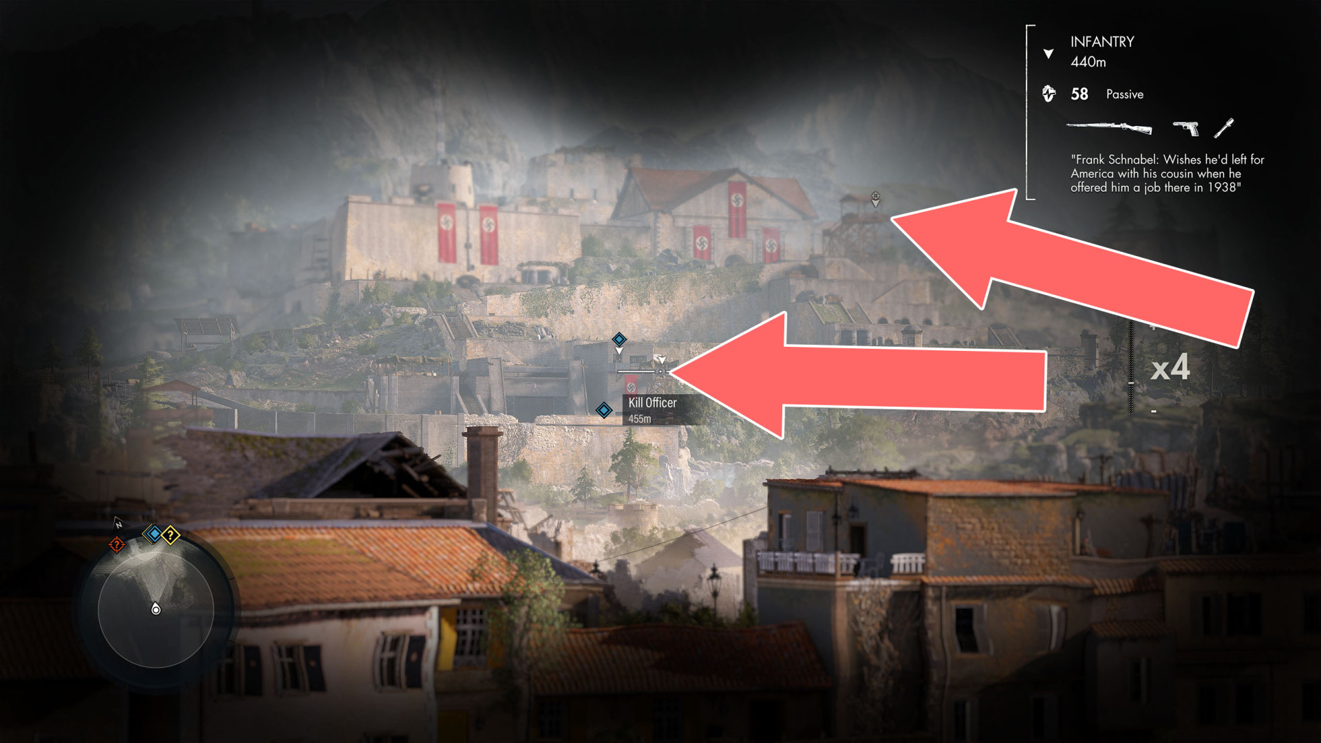 You can target a soldier on a watchtower standing where the officers you need to kill in a side mission are located, or a sniper standing much farther away on a watchtower on a hill.