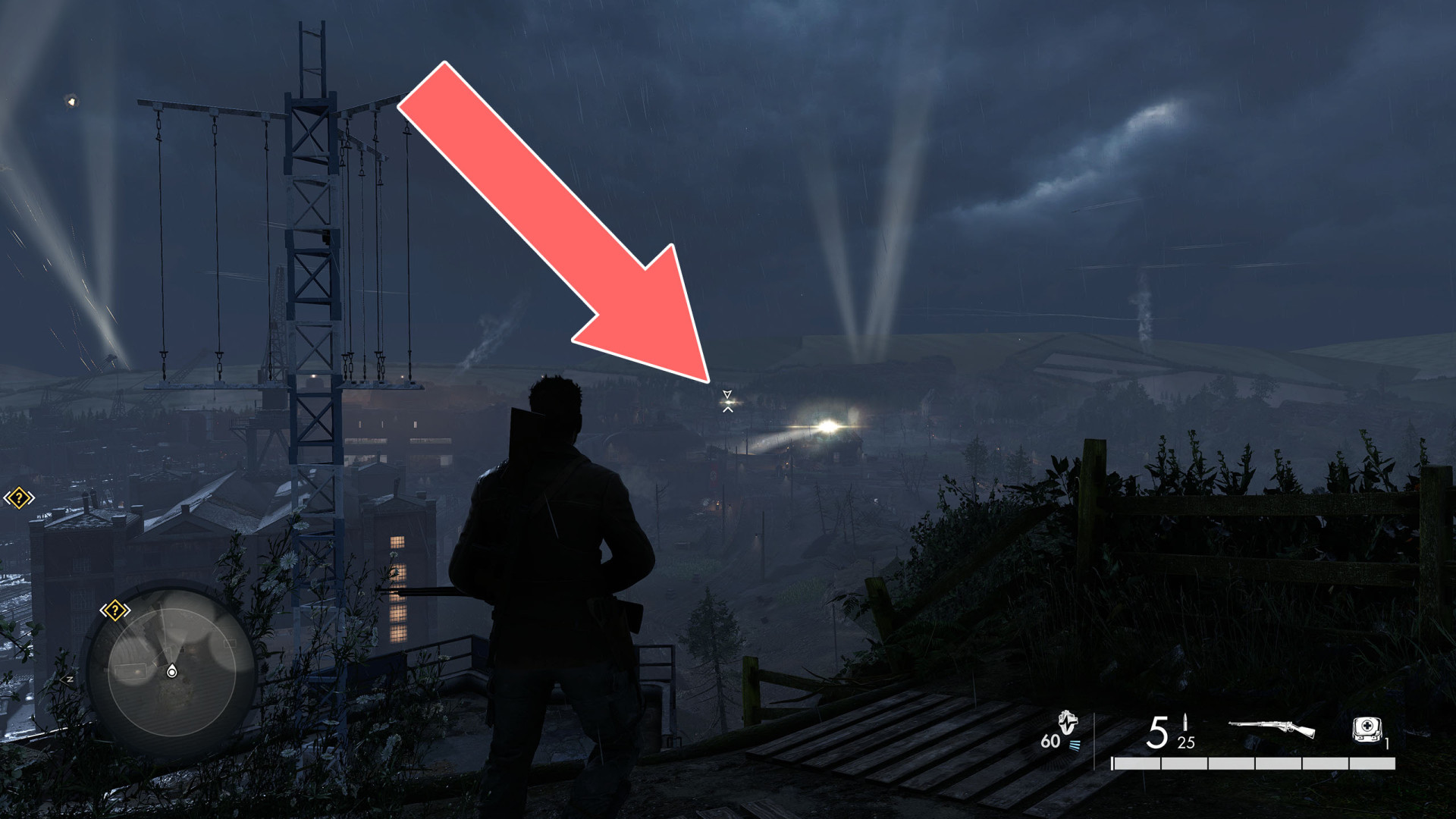 Look to the northeast and target the soldier located on the watchtower with a searchlight.