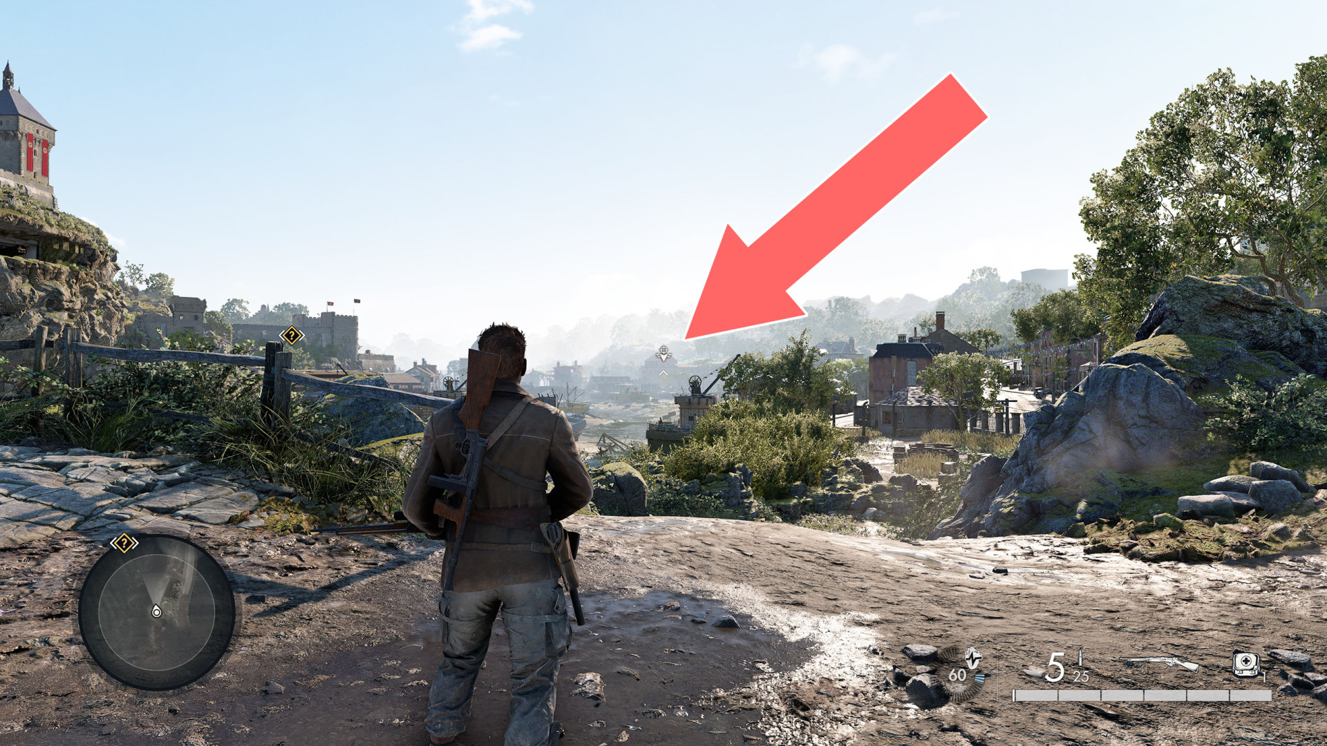 Look to the southwest. Your target is the soldier on the watchtower.