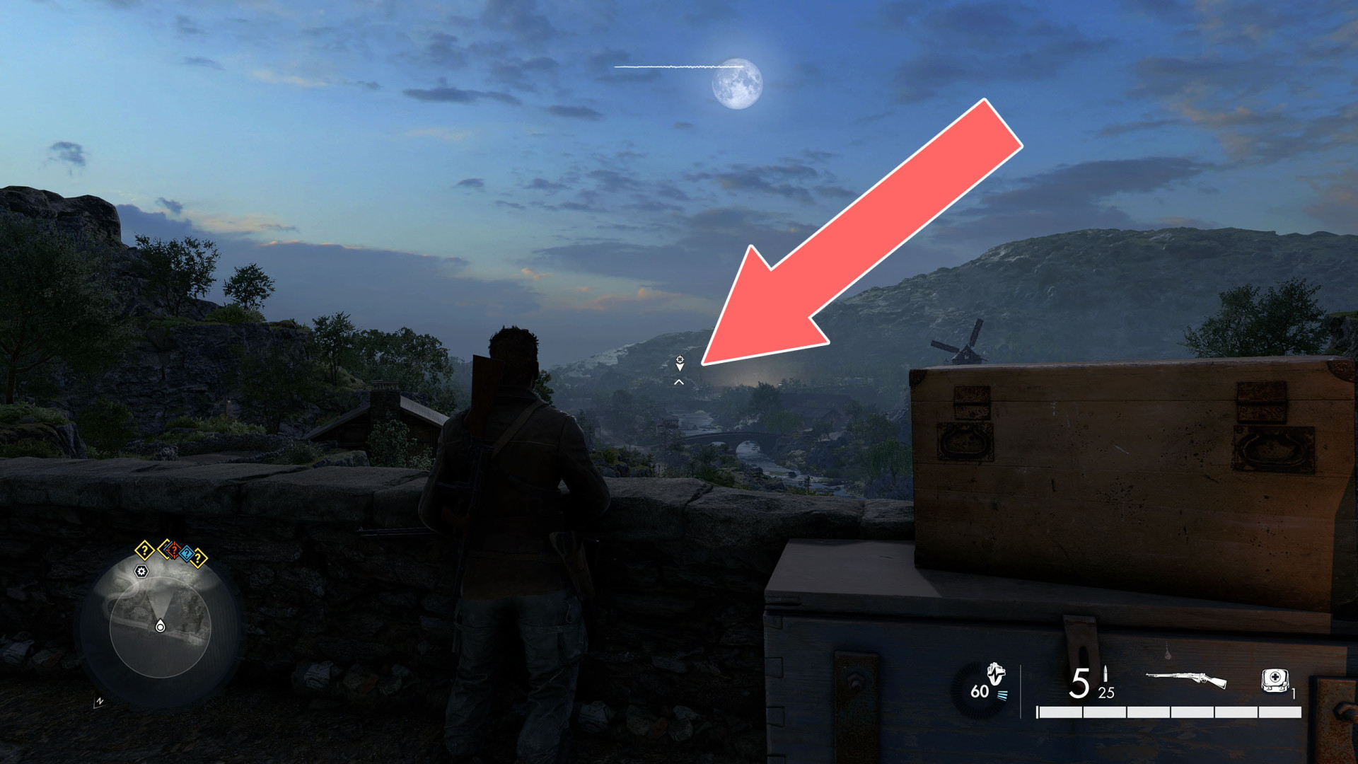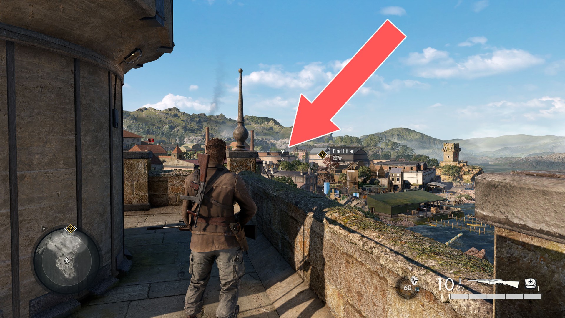 Your target is a soldier patrolling the roof of one of the buildings.