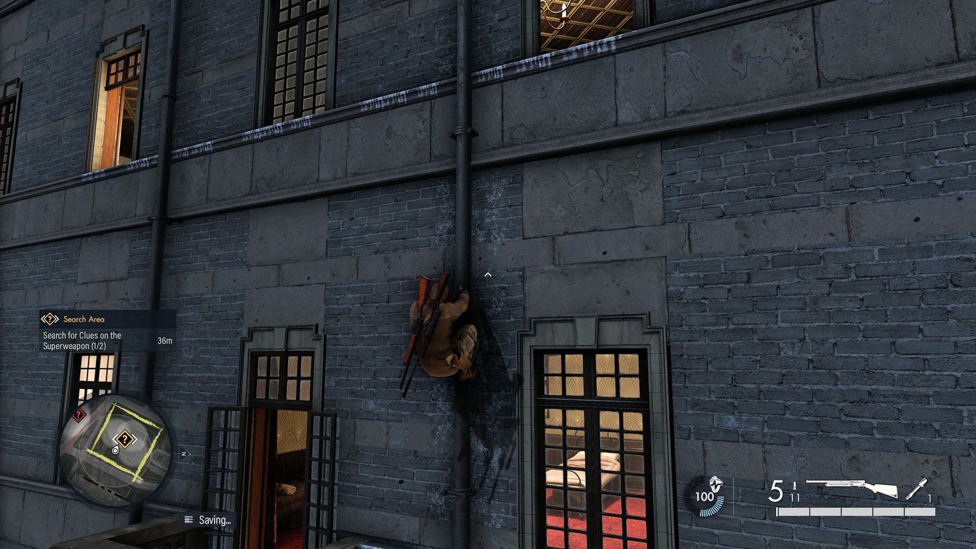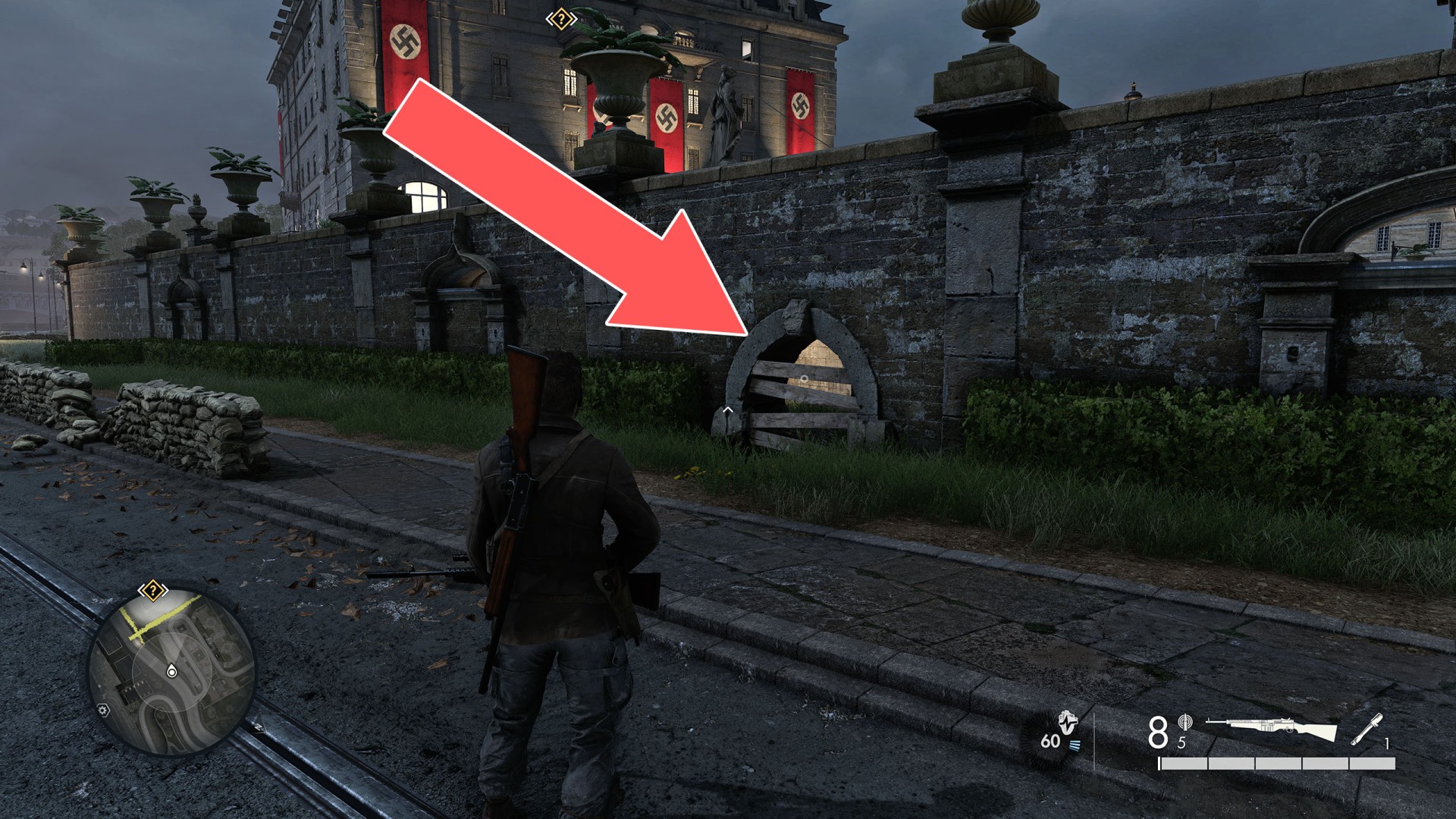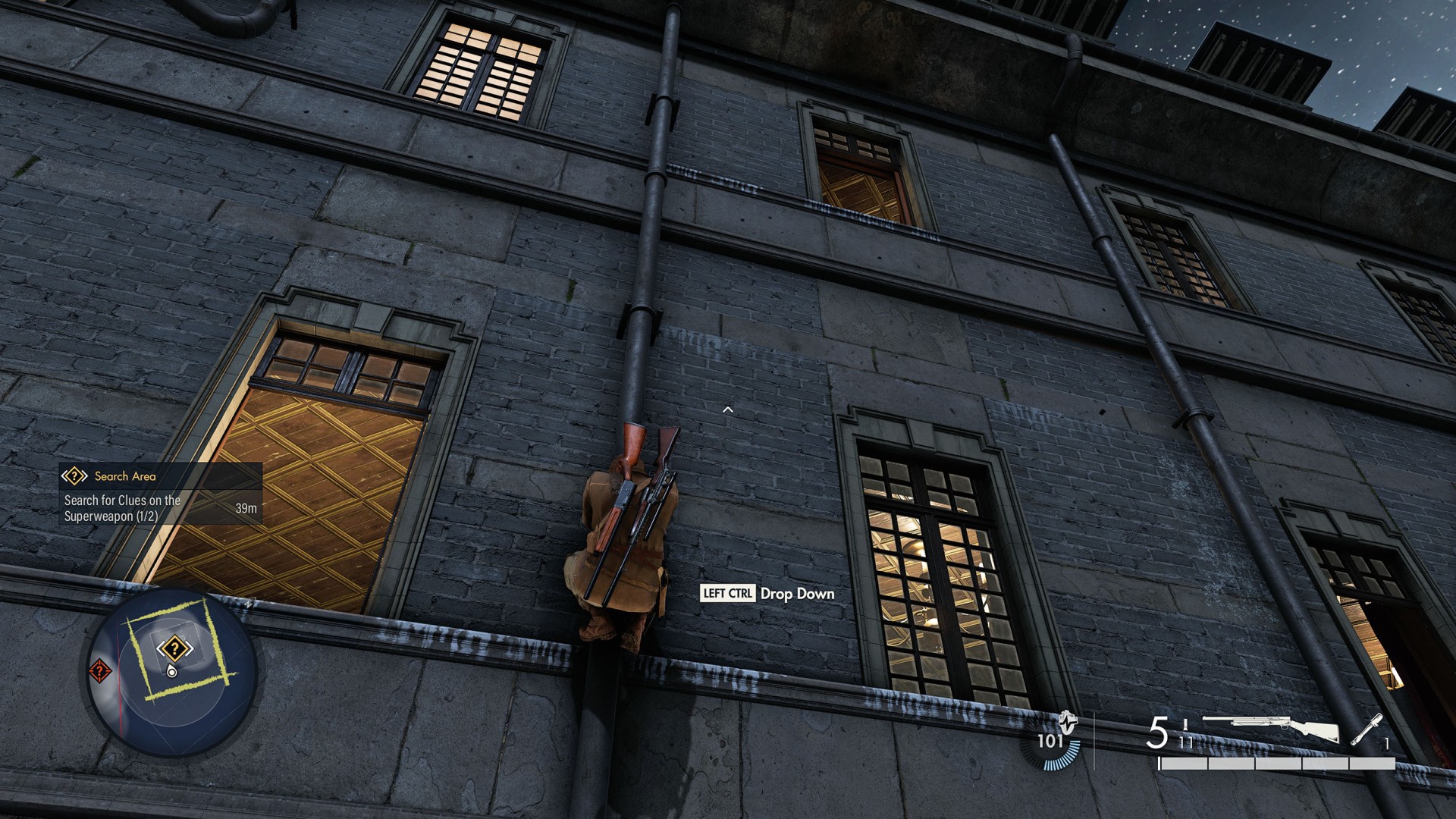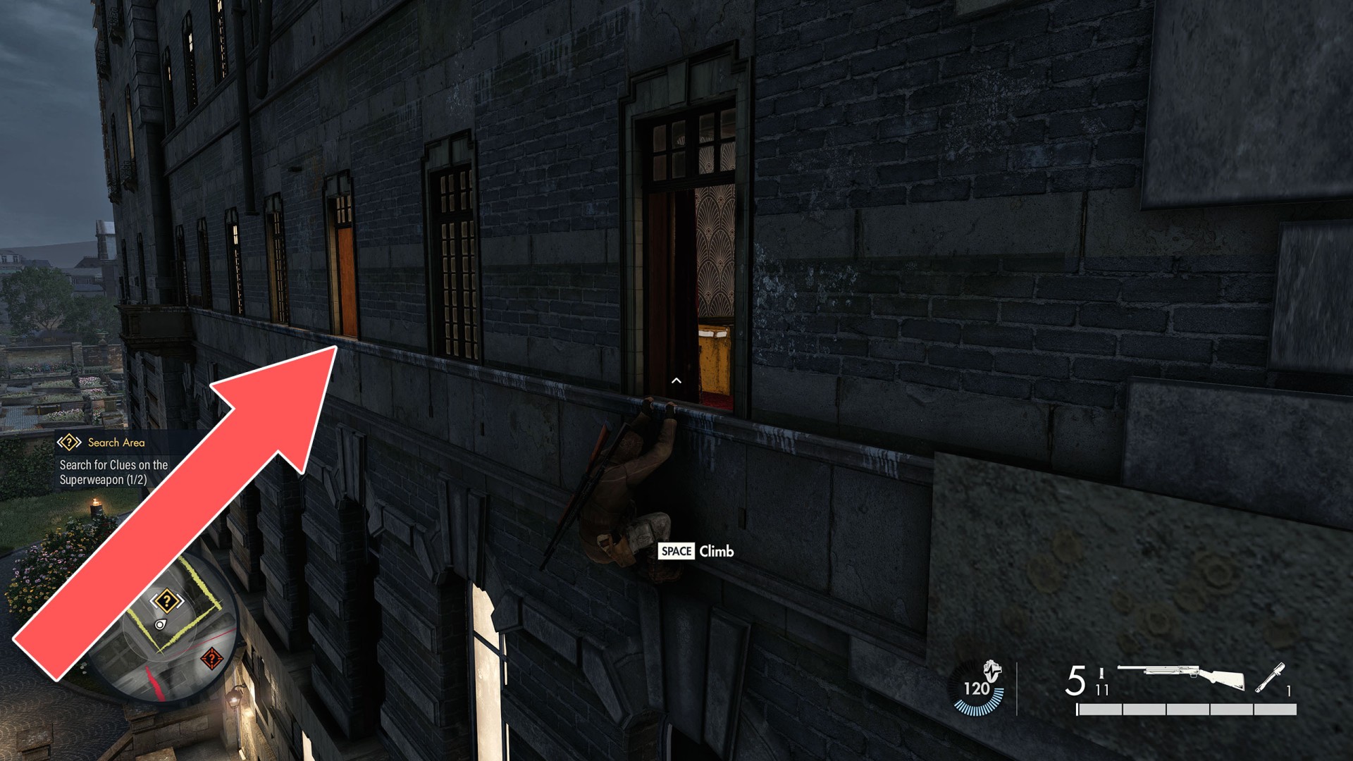 Show the mapClimb up the drainpipe of the gutter and enter through the open window located on the top floor.