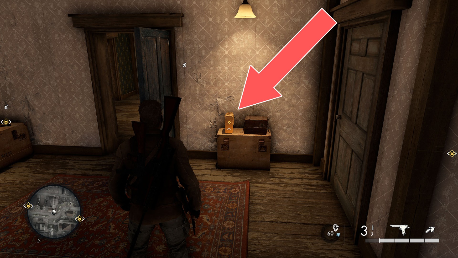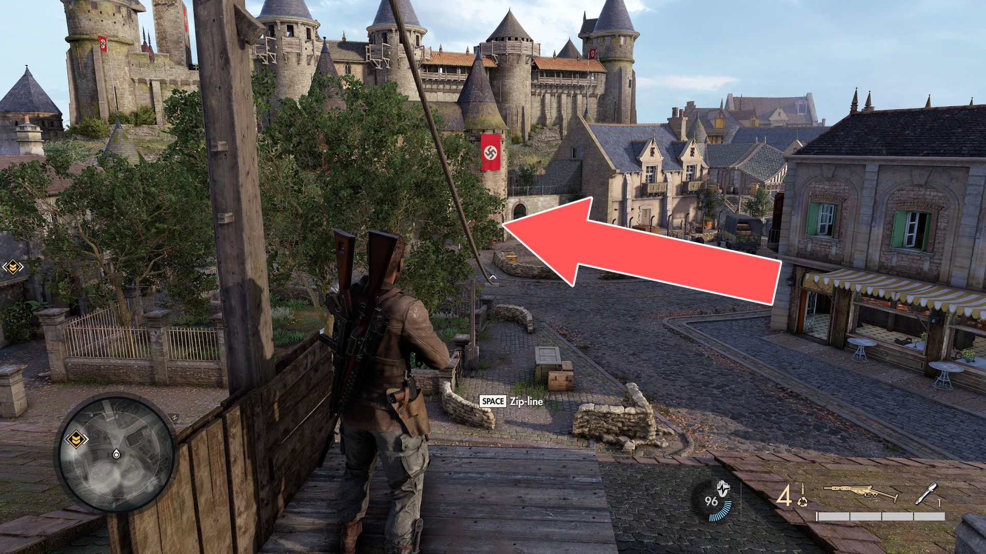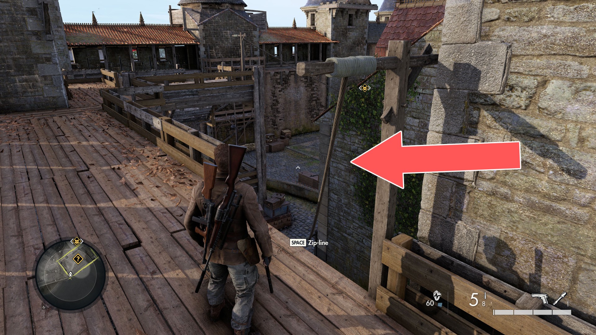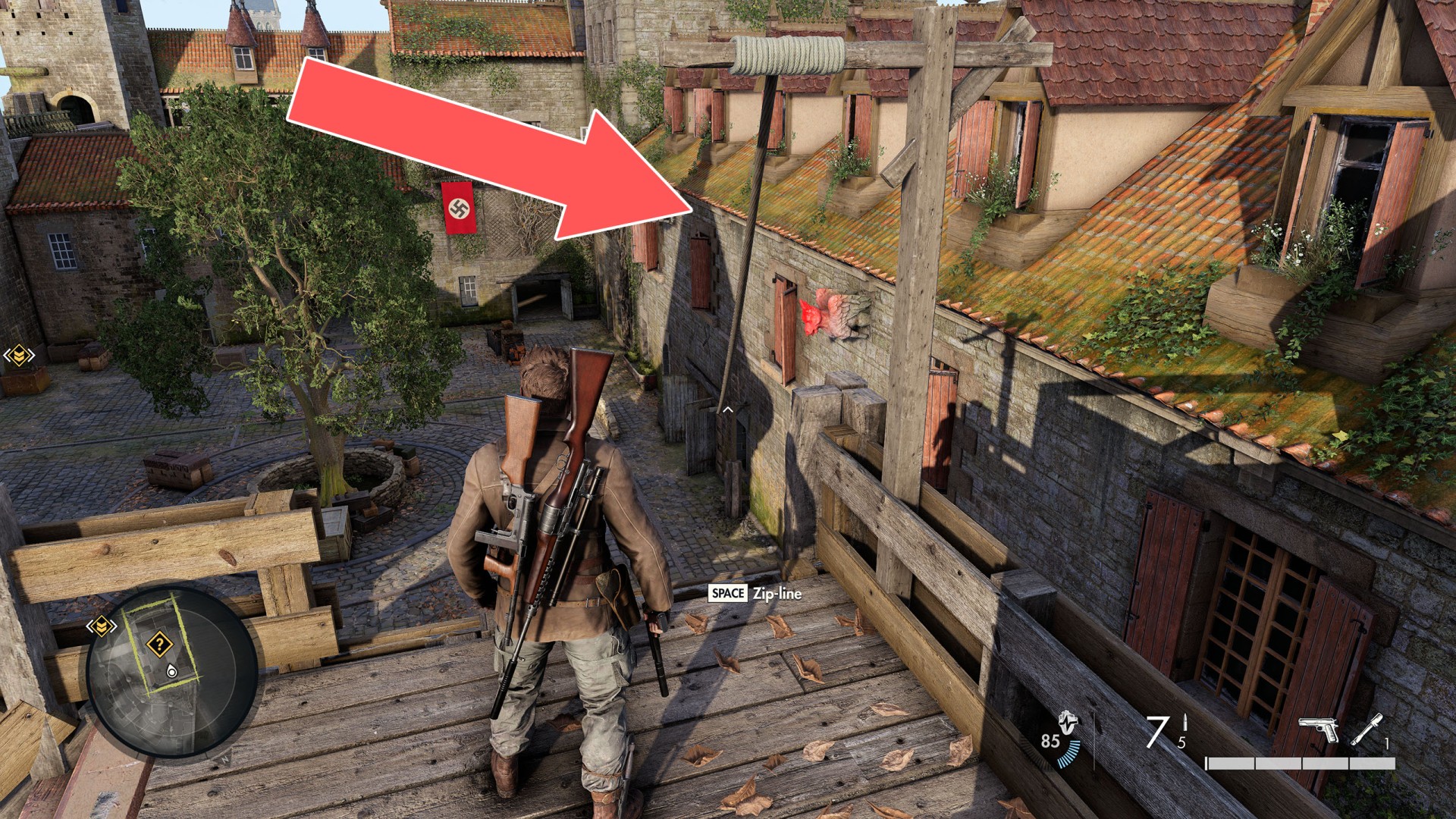 Show the mapClimb up the drainpipe of the gutter and enter through the open window located on the top floor.