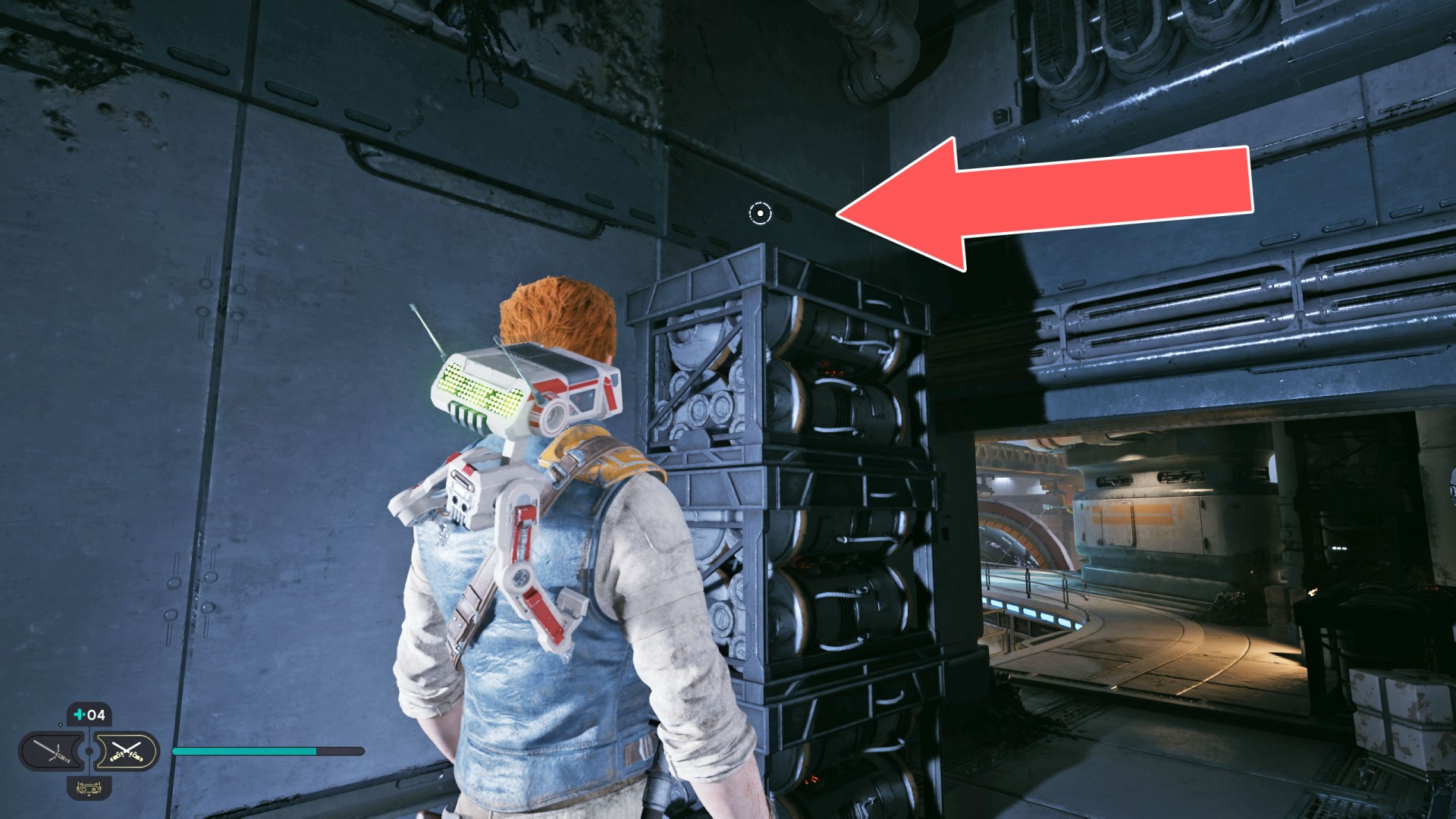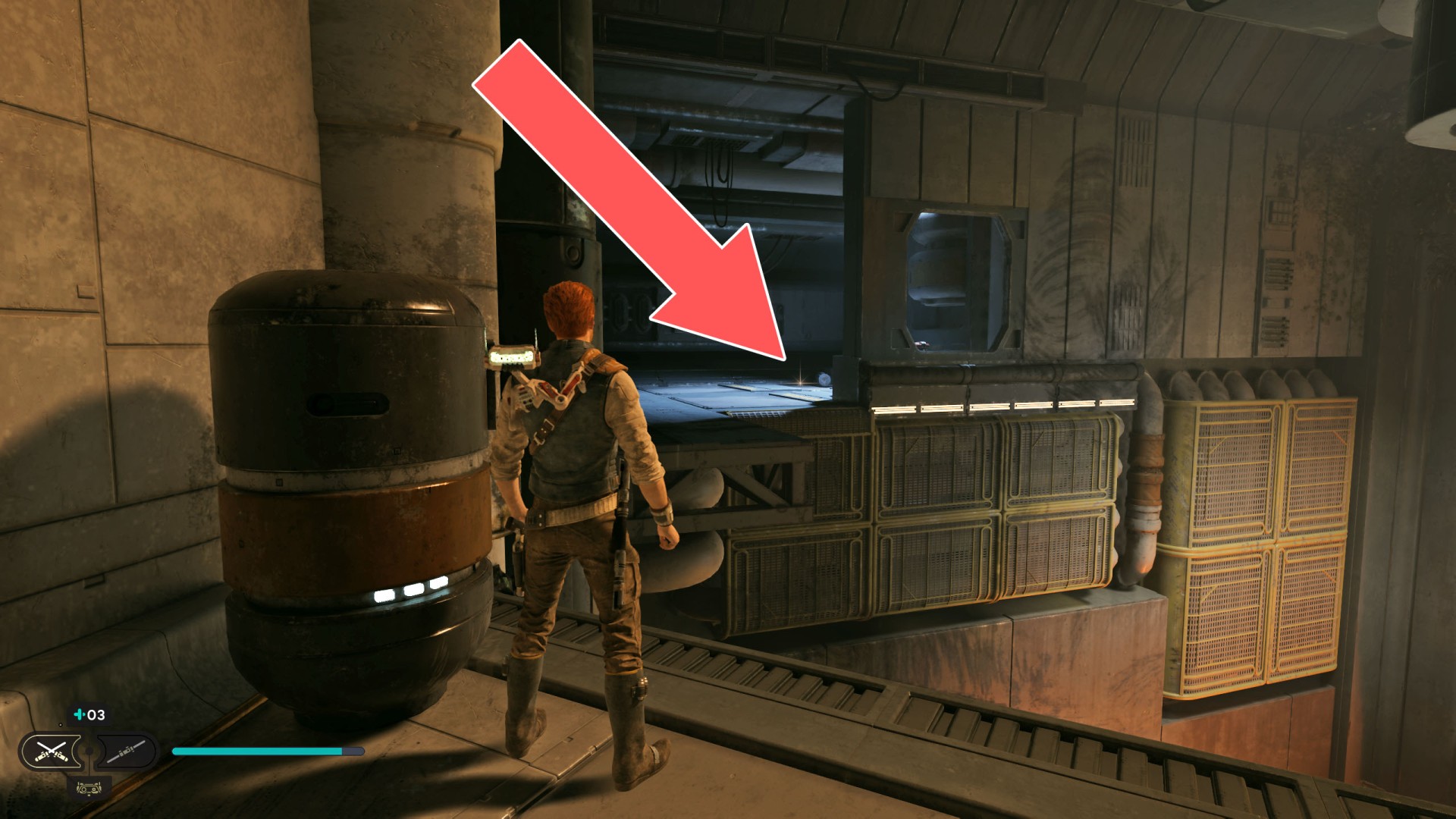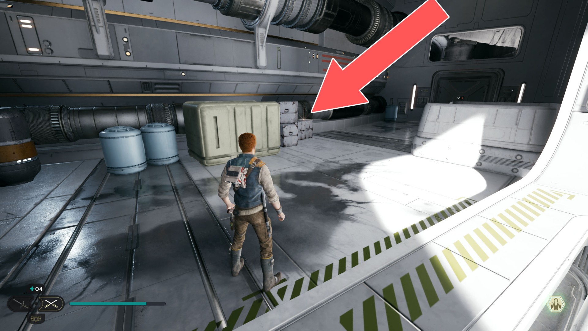 Show the mapDatadisc. The disk sits between the railing and the crates.