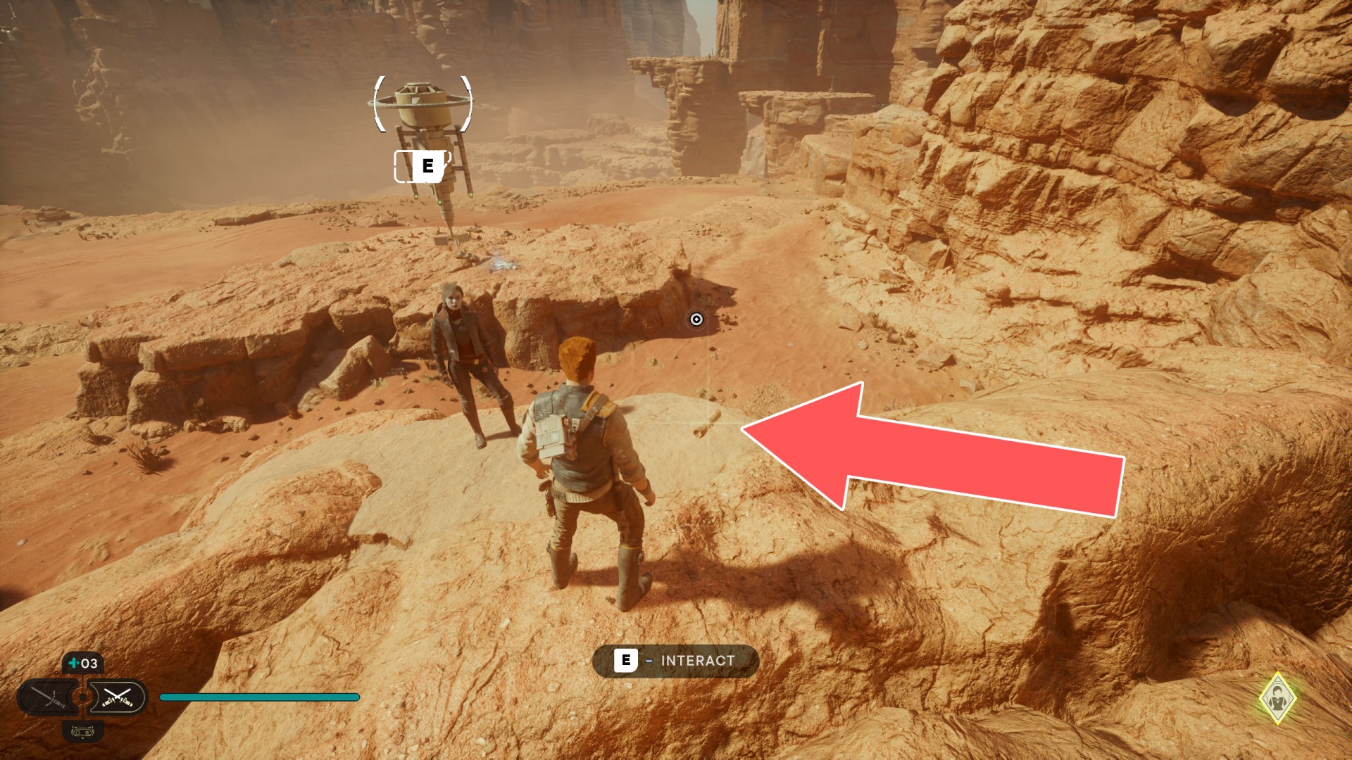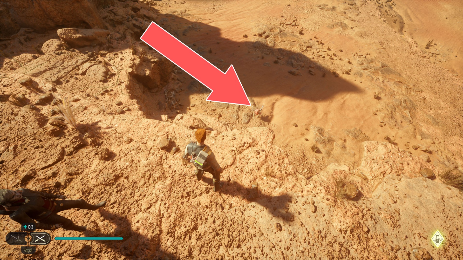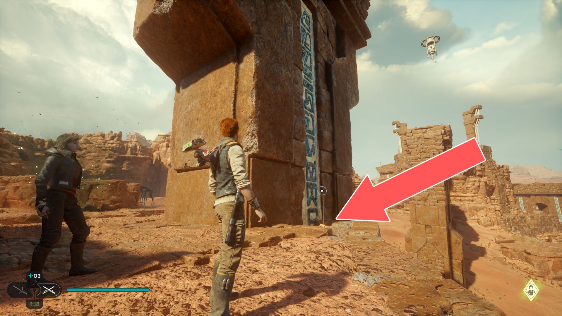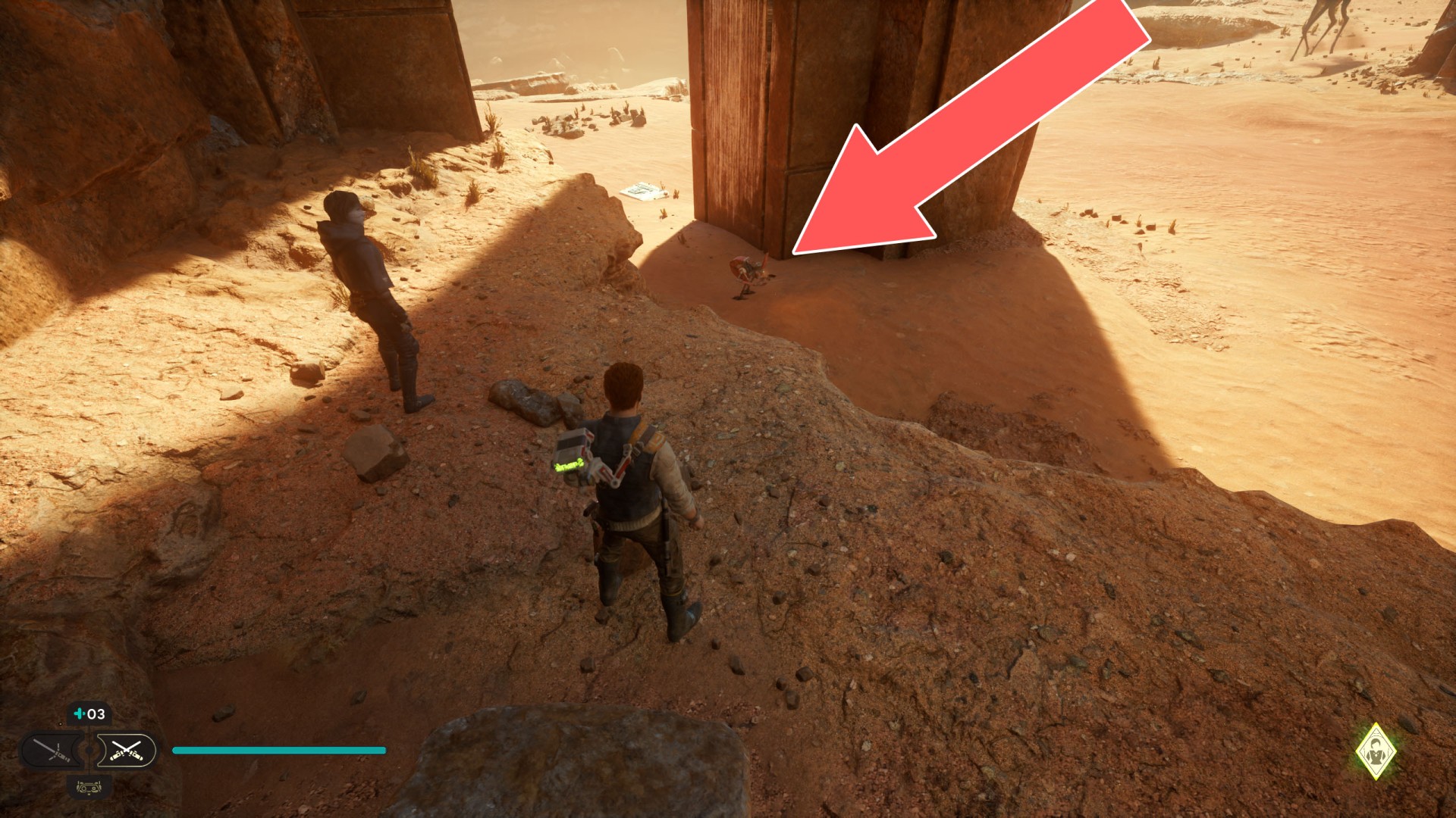 Show the mapJedha Scroll. Kill a scavenger droid and it will drop a scroll. Strong winds make this task harder, so a simple way is to use the "Dash" skill to get to the other side and immediately after landing you should throw a lightsaber towards the droid.