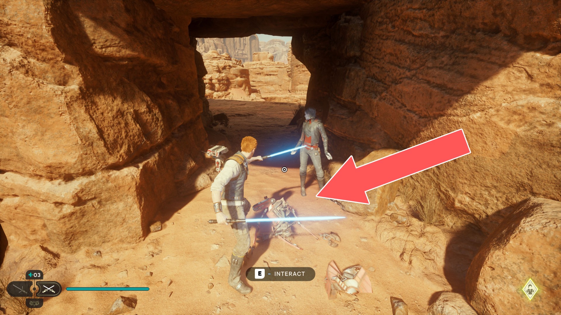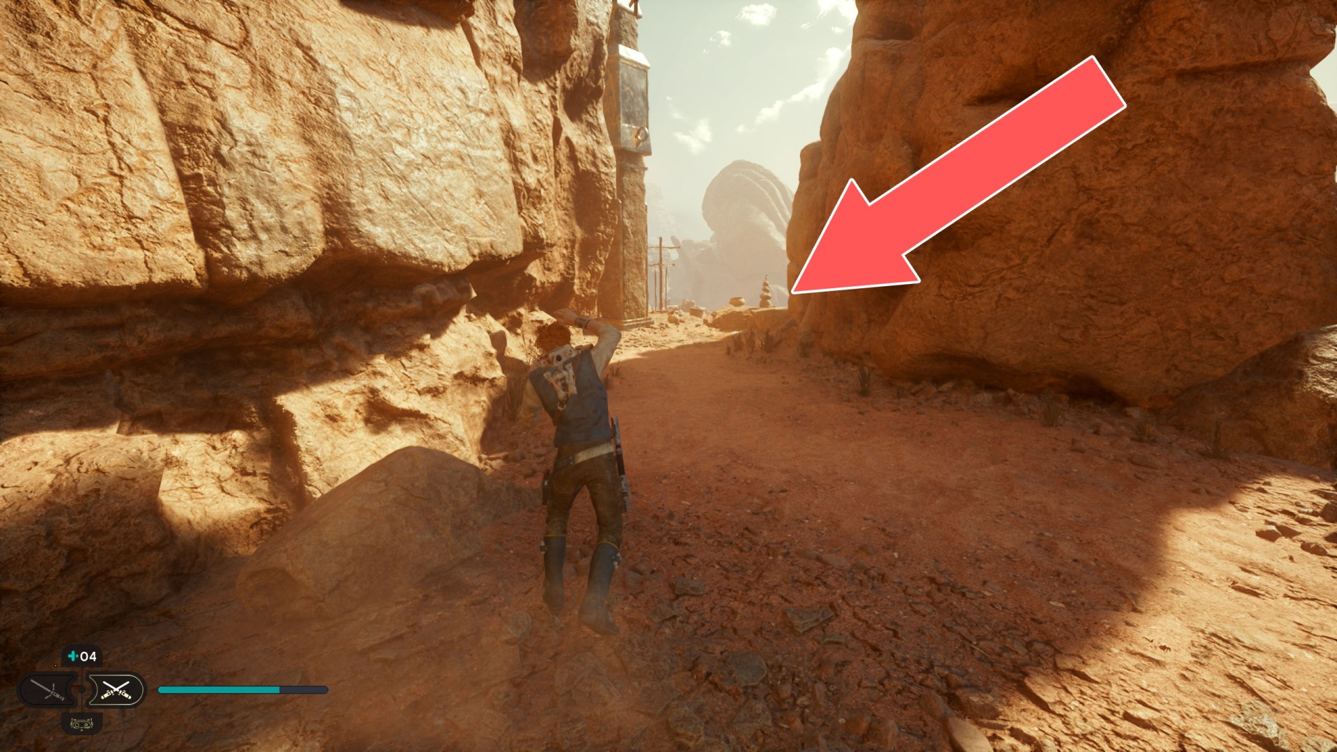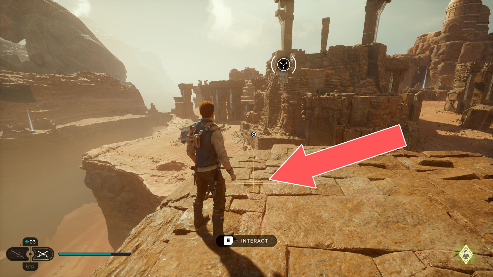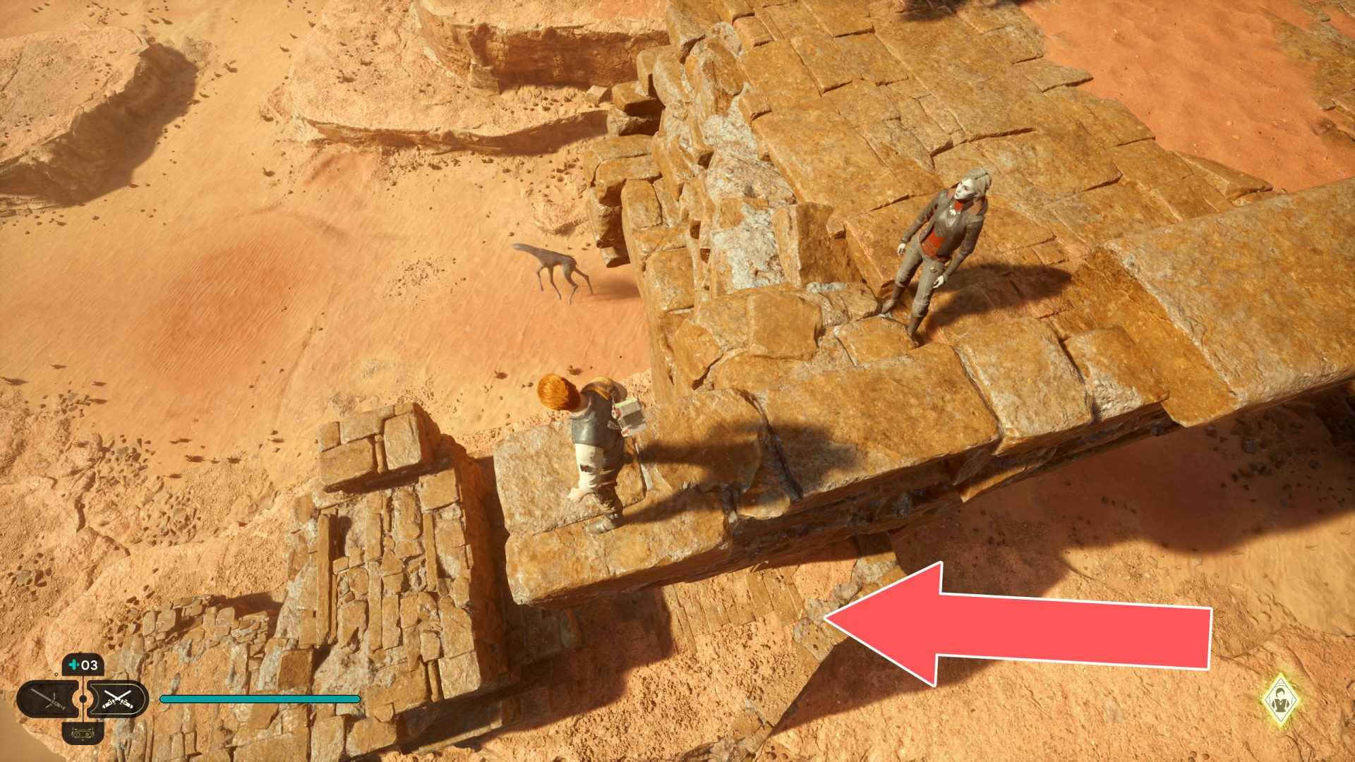 Show the mapJedha Scroll. Kill a scavenger droid and it will drop a scroll. Strong winds make this task harder, so a simple way is to use the "Dash" skill to get to the other side and immediately after landing you should throw a lightsaber towards the droid.