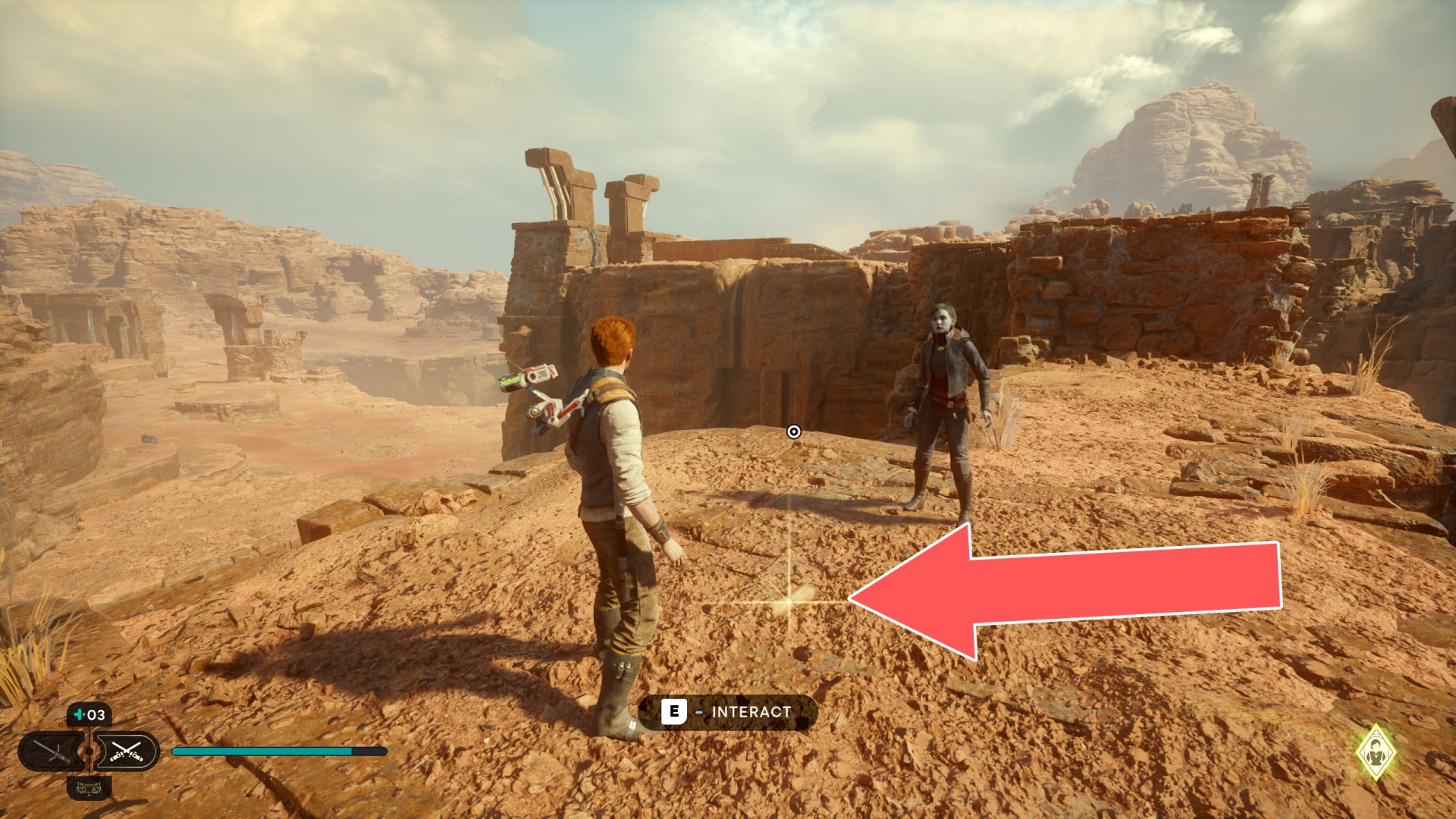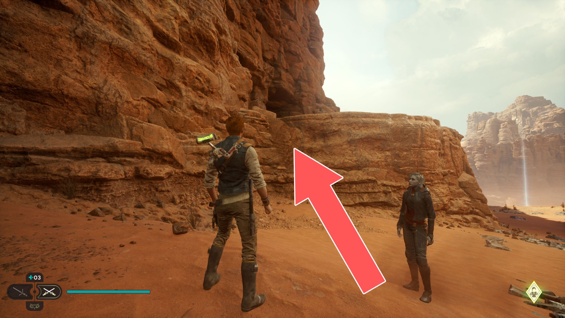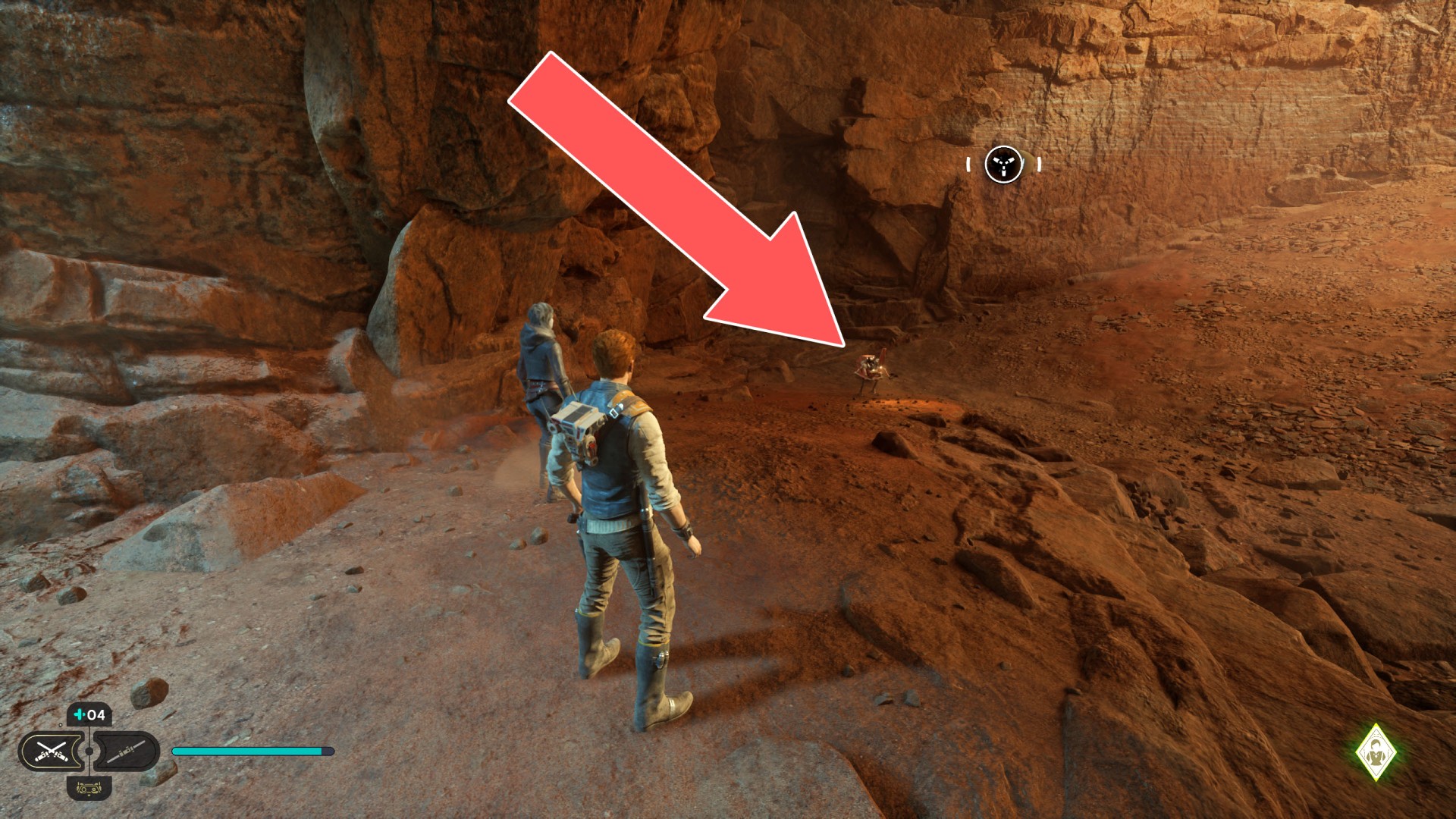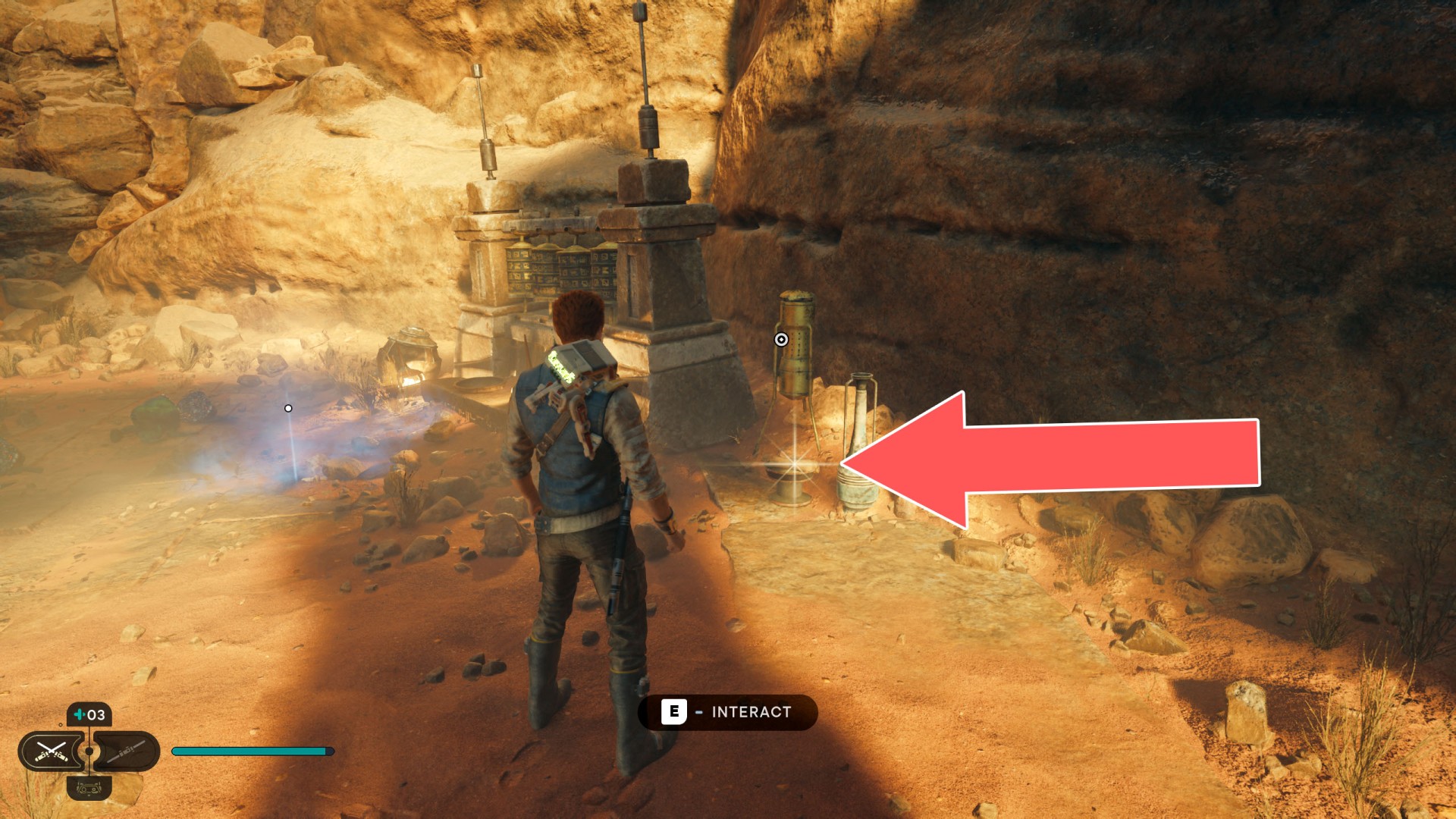 Show the mapJedha Scroll. Kill a scavenger droid and it will drop a scroll. Strong winds make this task harder, so a simple way is to use the "Dash" skill to get to the other side and immediately after landing you should throw a lightsaber towards the droid.
