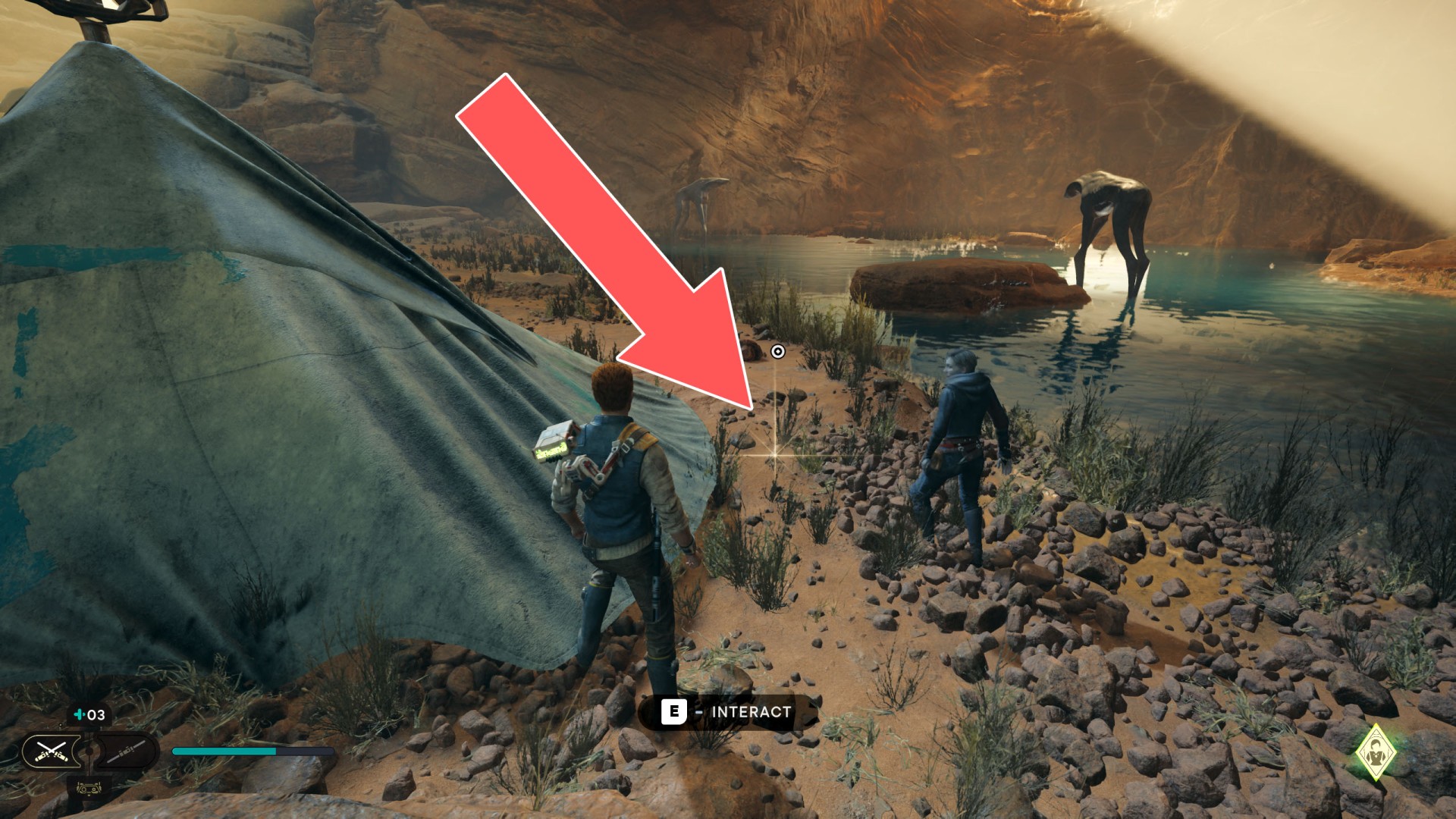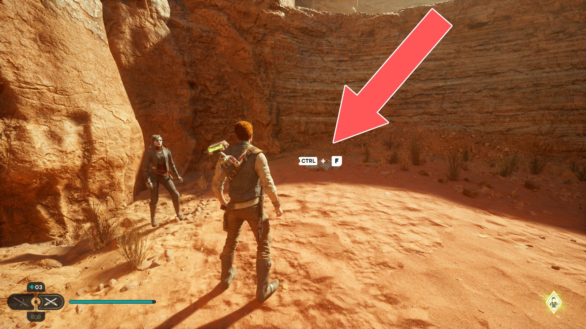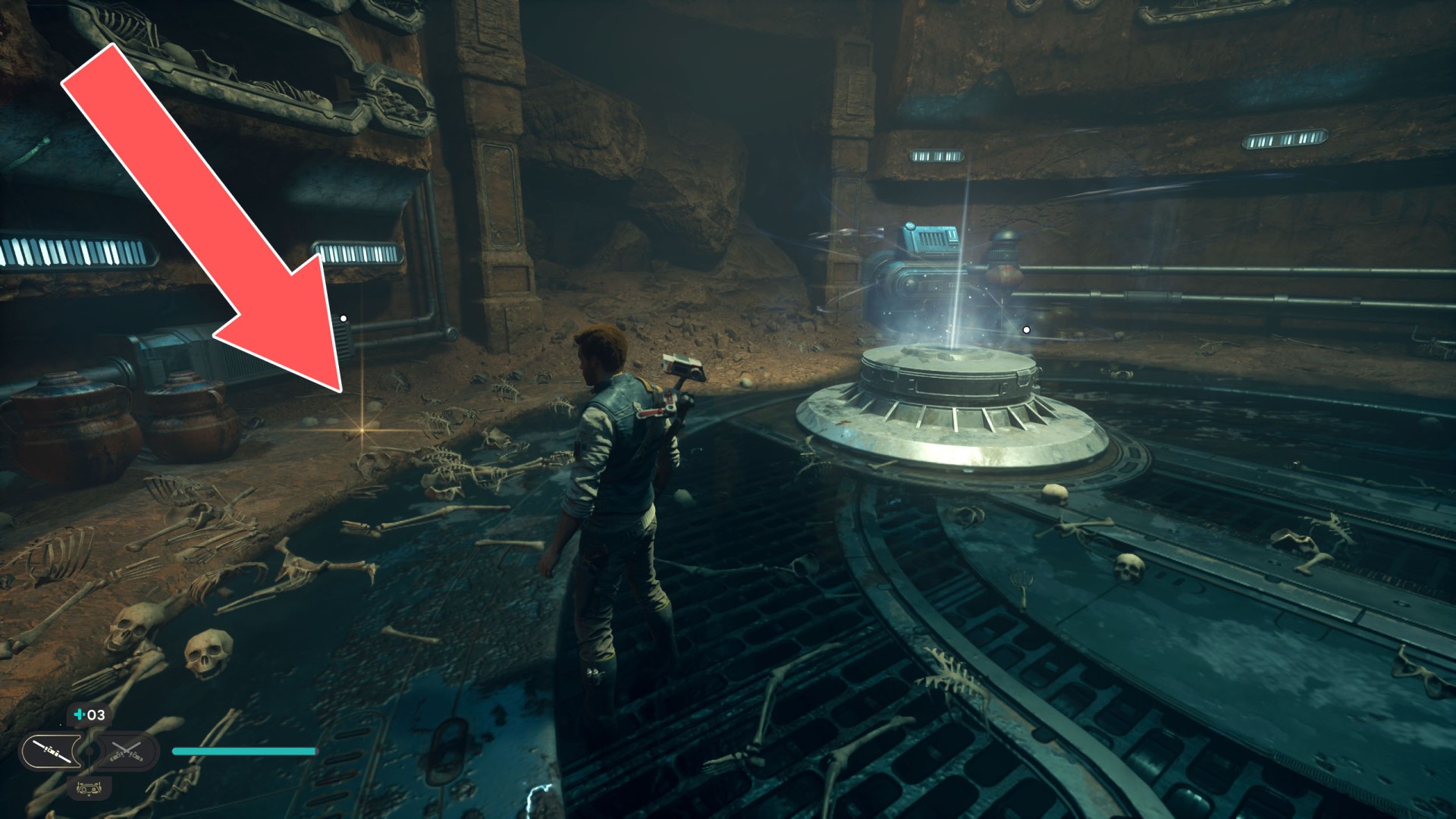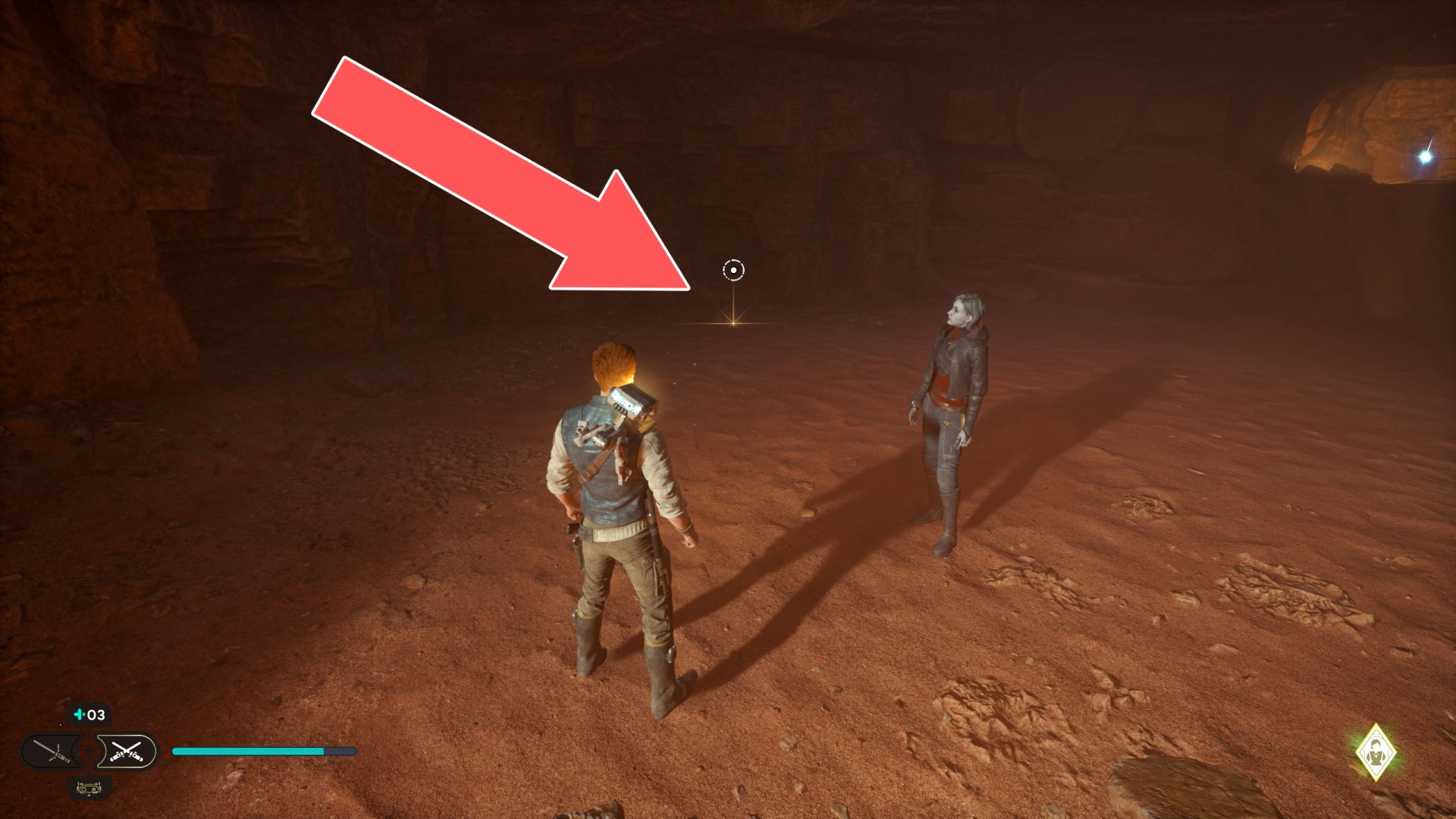 Show the mapJedha Scroll. Kill a scavenger droid and it will drop a scroll. Strong winds make this task harder, so a simple way is to use the "Dash" skill to get to the other side and immediately after landing you should throw a lightsaber towards the droid.