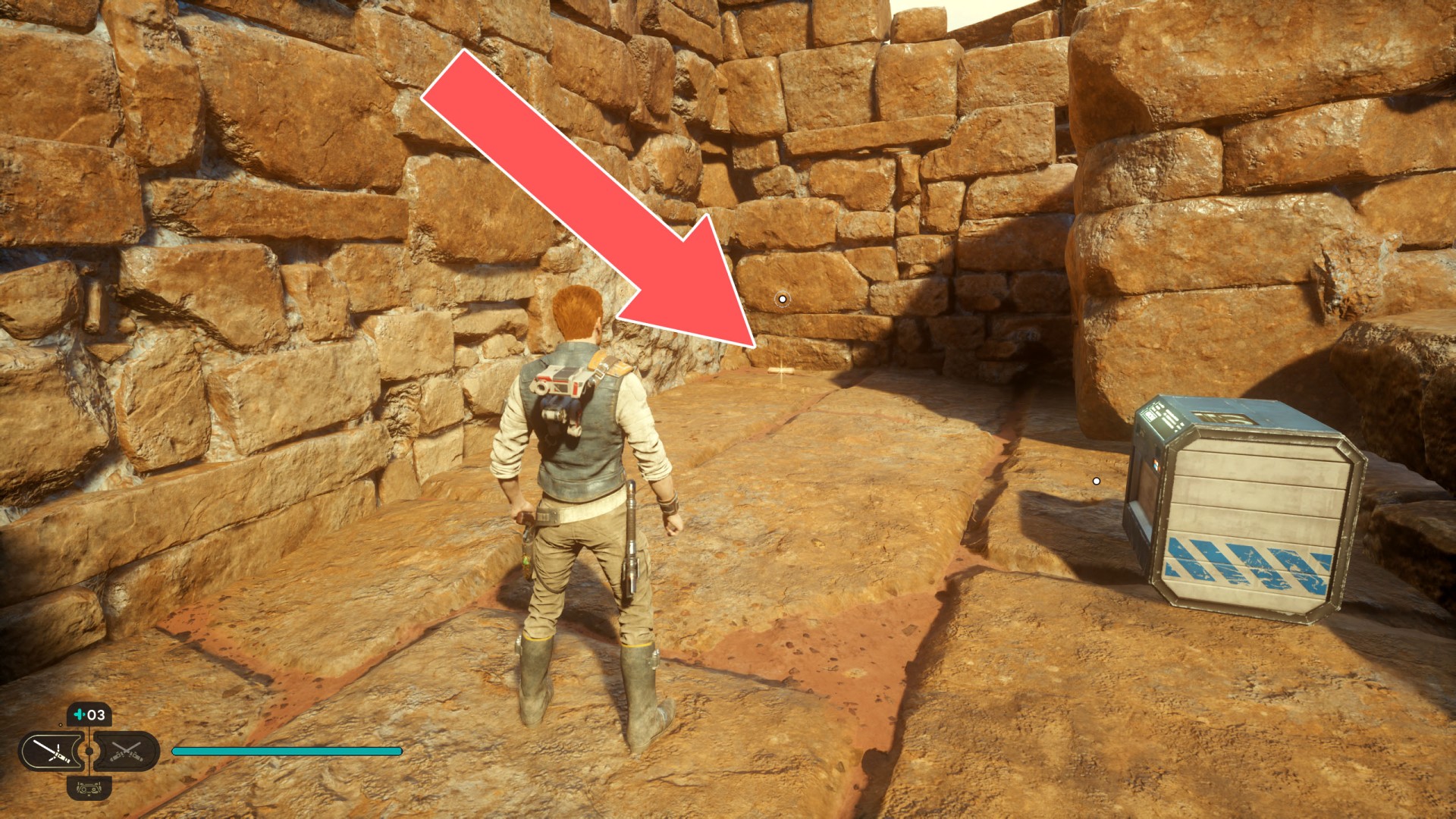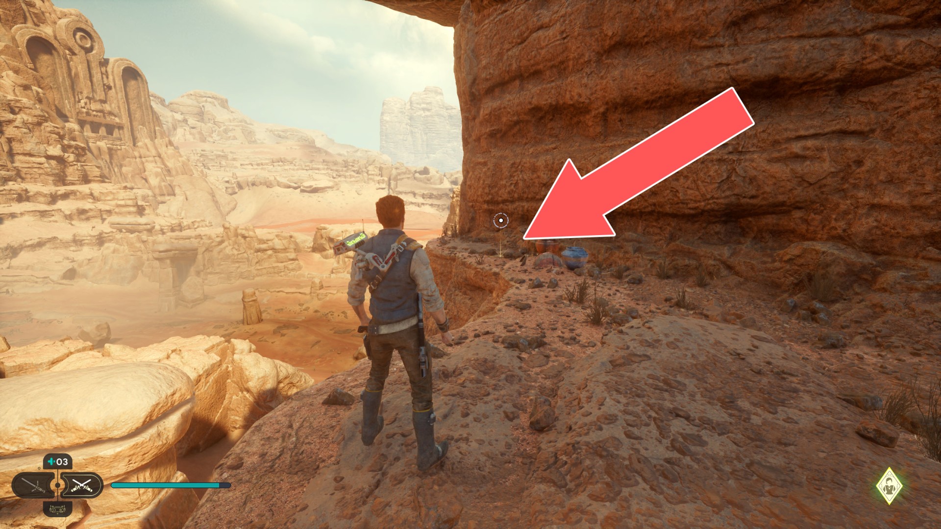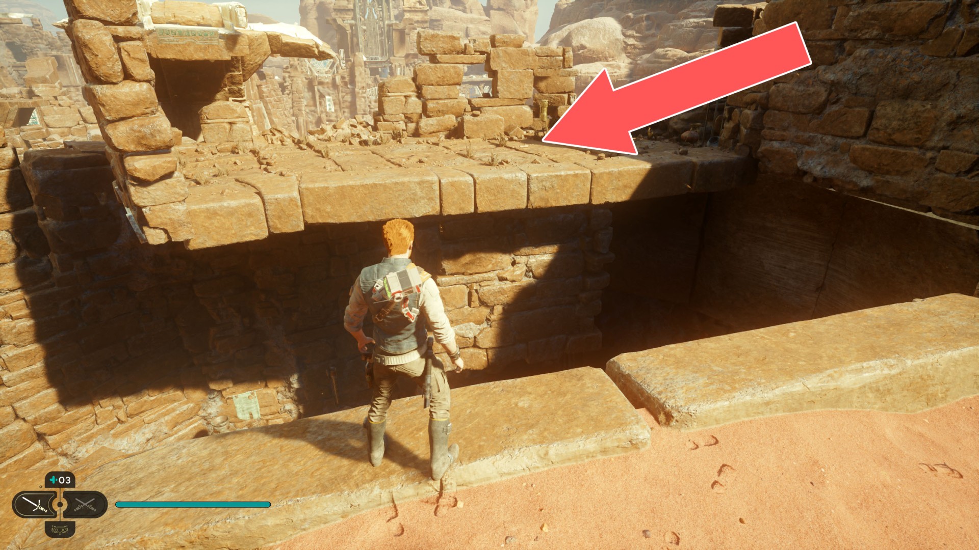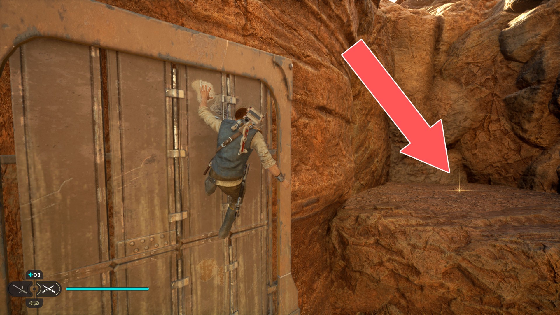 Jedha Scroll. You can get here by just using a double jump and hugging the wall, but this was probably not intended. And maybe it will be changed someday. Normally, you can get here at a later stage of the storyline. Kill a scavenger droid and it will drop a scroll.