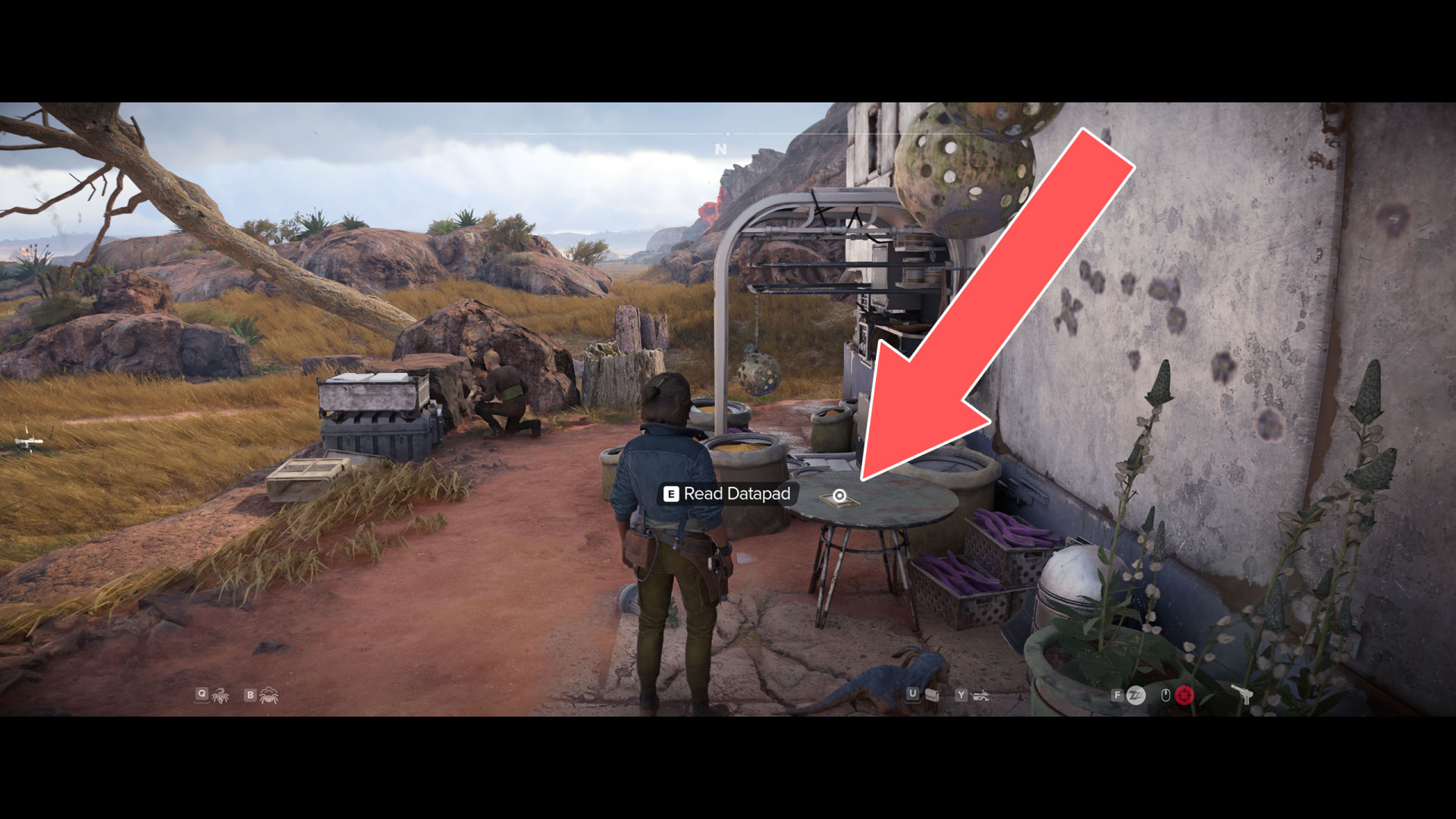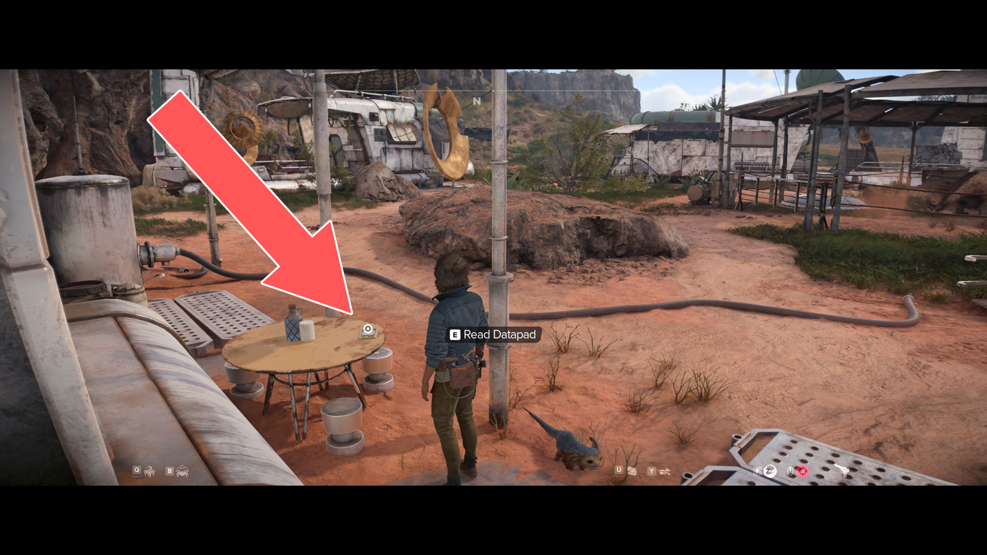 This datapad sits on a round table standing outside, next to one of the buildings in Kadùa Village.