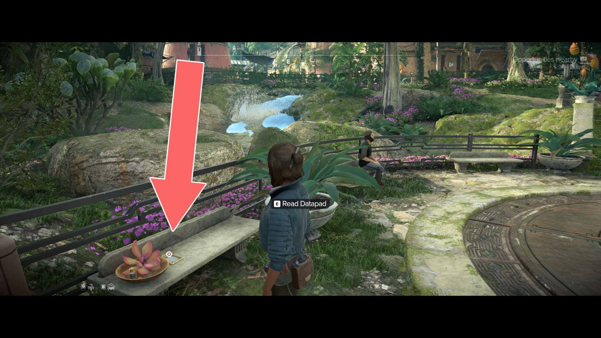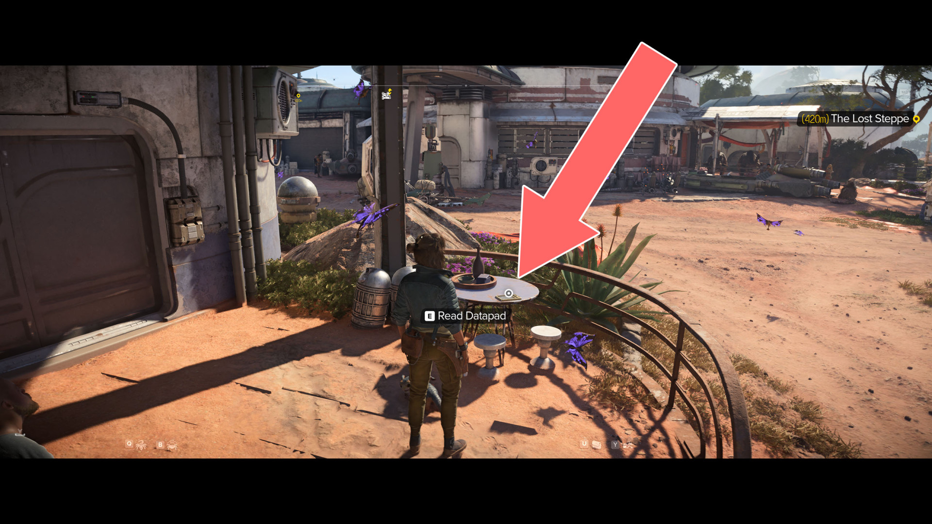 This datapad is on a table standing by the railing, on the upper level of Mirogana Market.