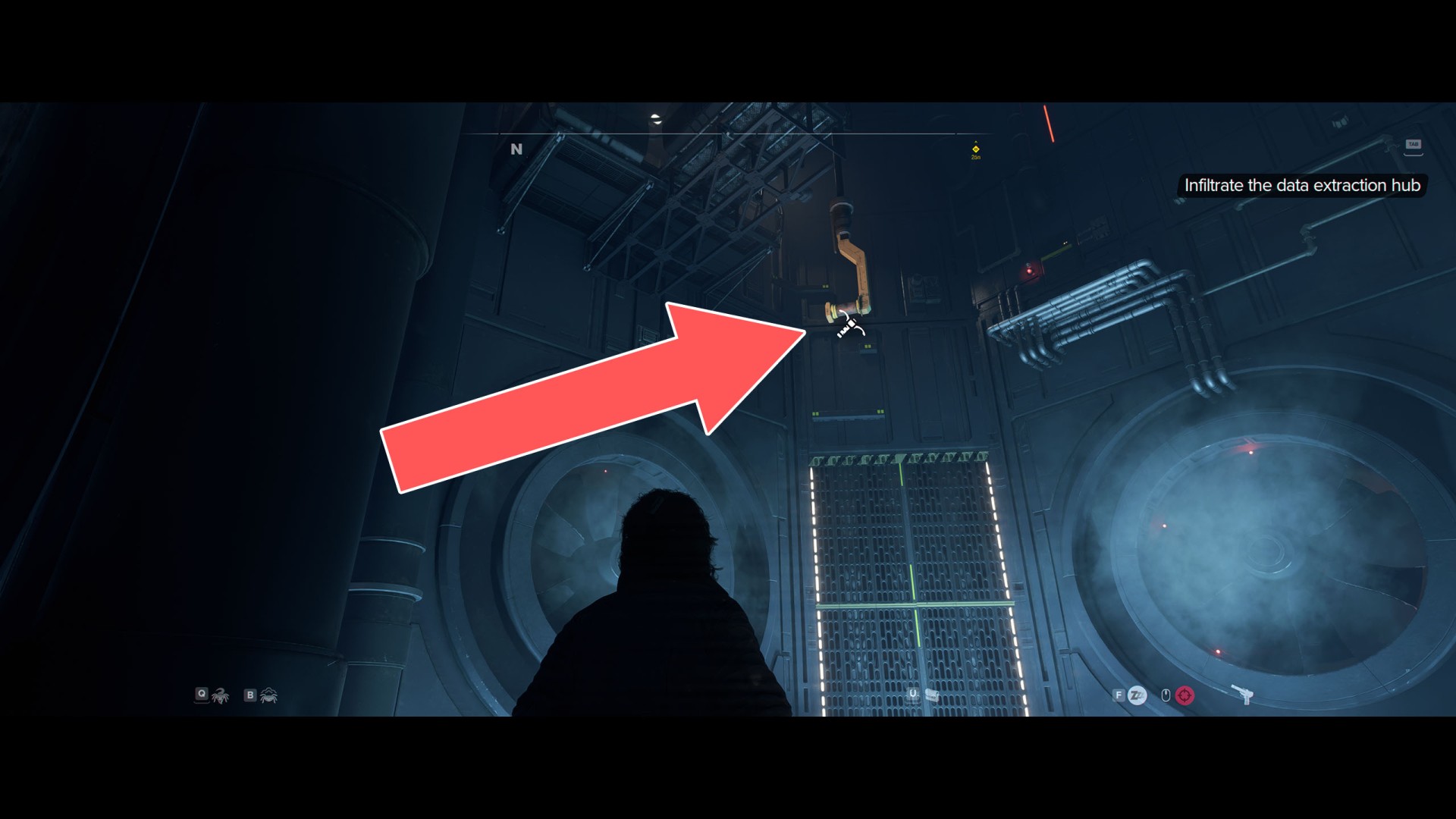 Pass under the broken fan and jump down onto the platform below. Then use the grappling hook to jump onto the wall on the other side and climb up it and the handles to the platform above.