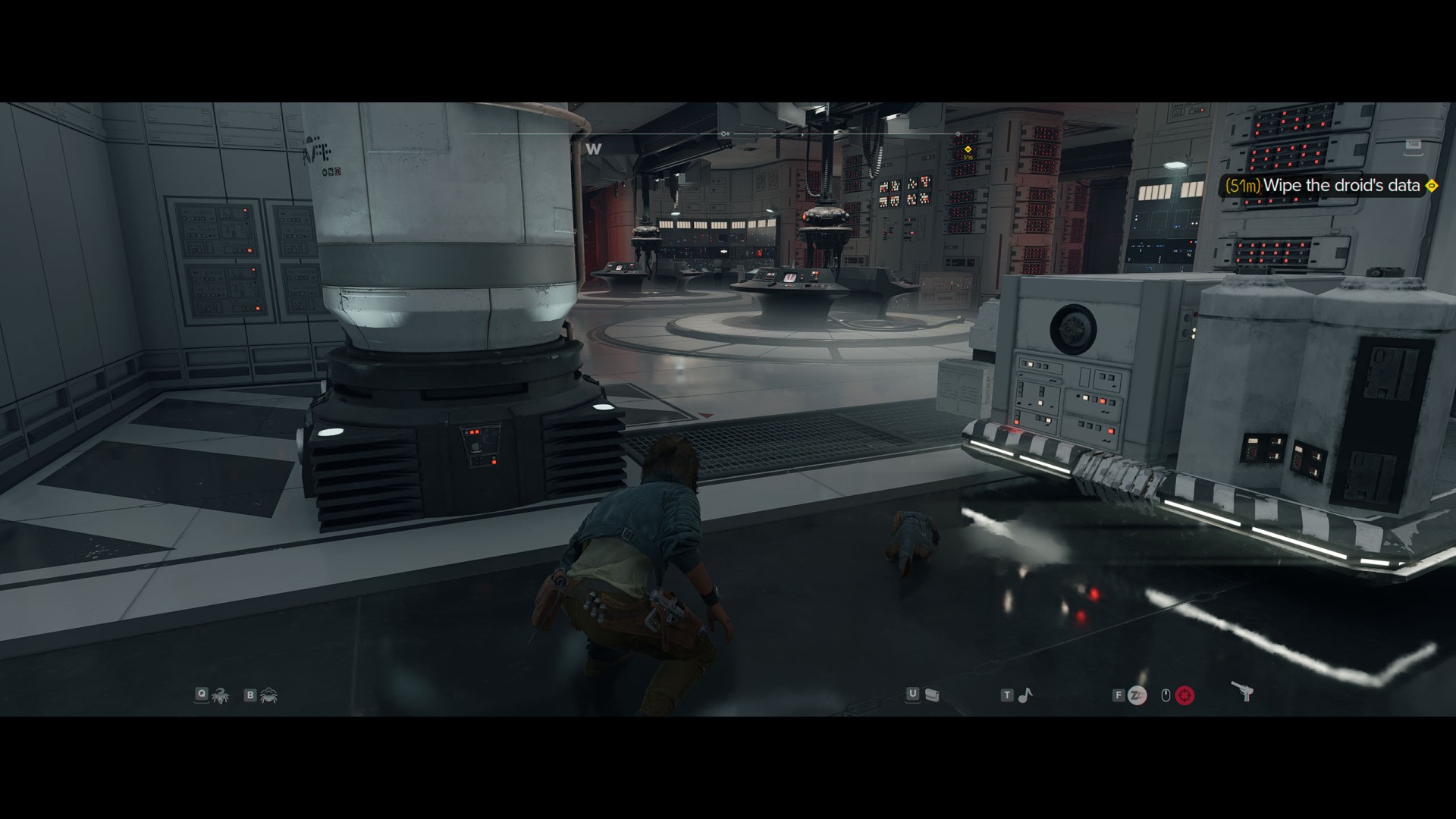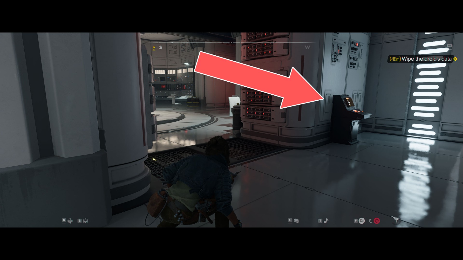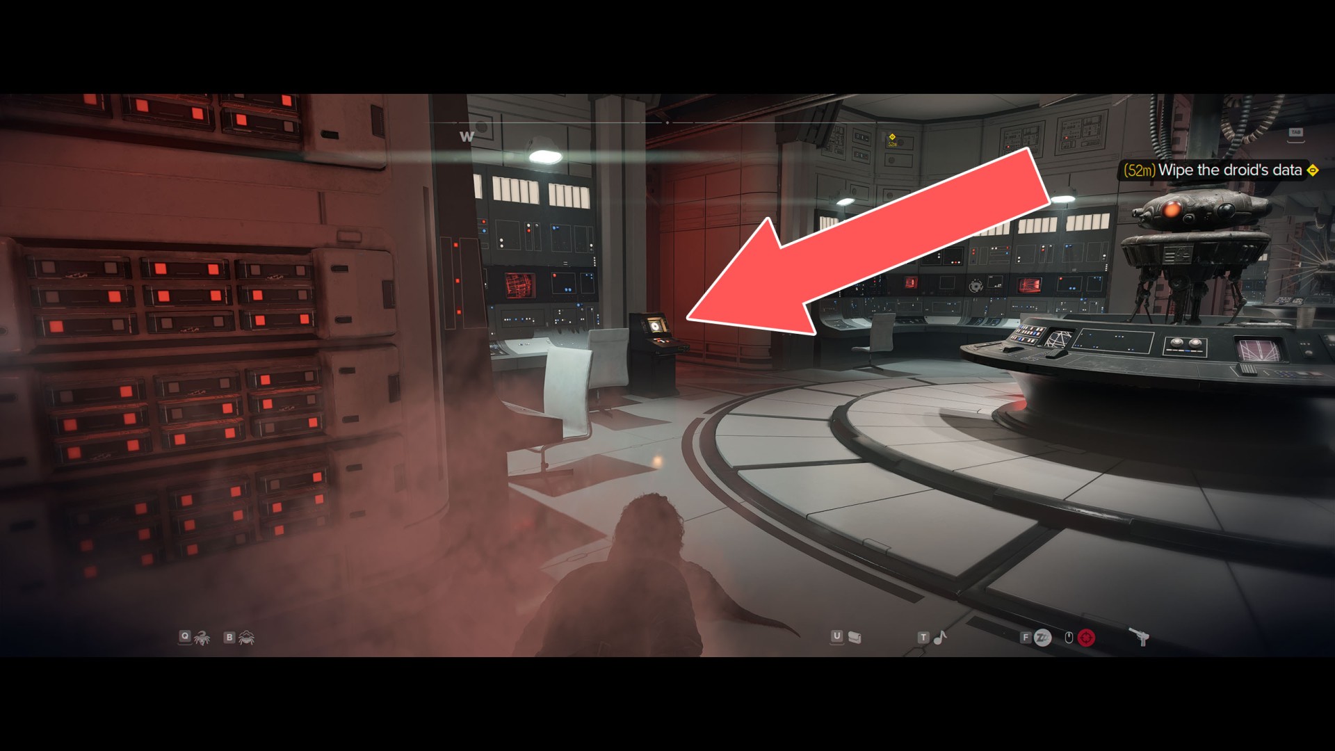 Go through the next door to the main hall. Apart from numerous Imperials patrolling the area, it is also scanned by several stationary probe droids. The terminal you are looking for is located on the east wall, but the best way to get to it is to go around the entire area clockwise. So start by going west.