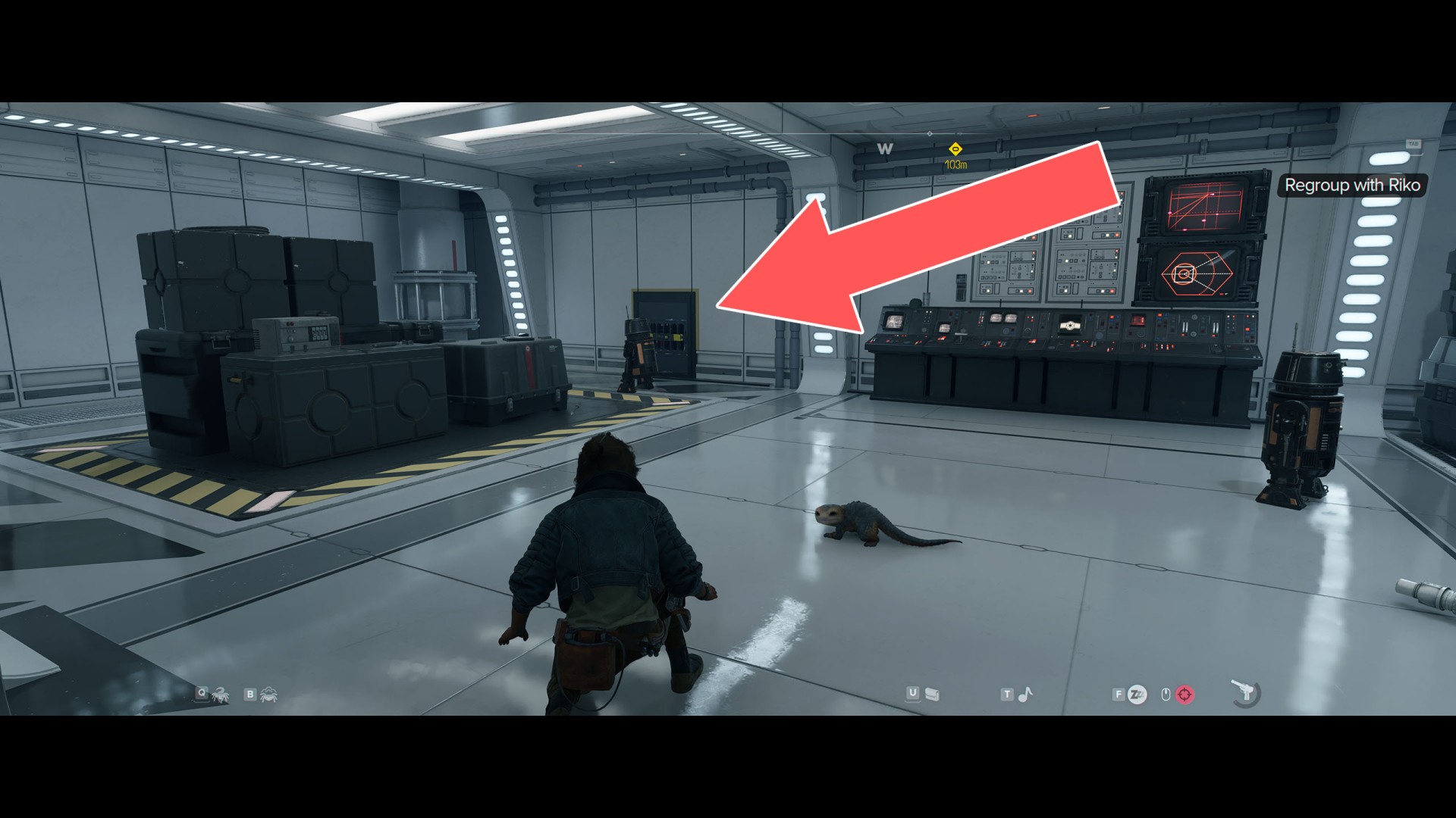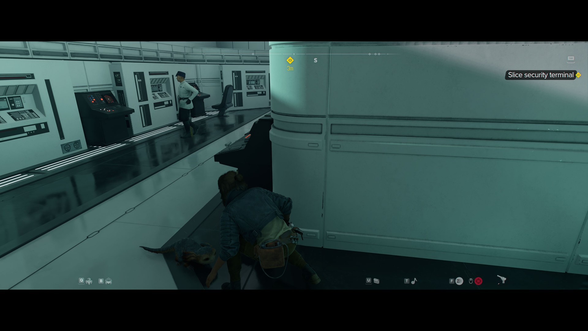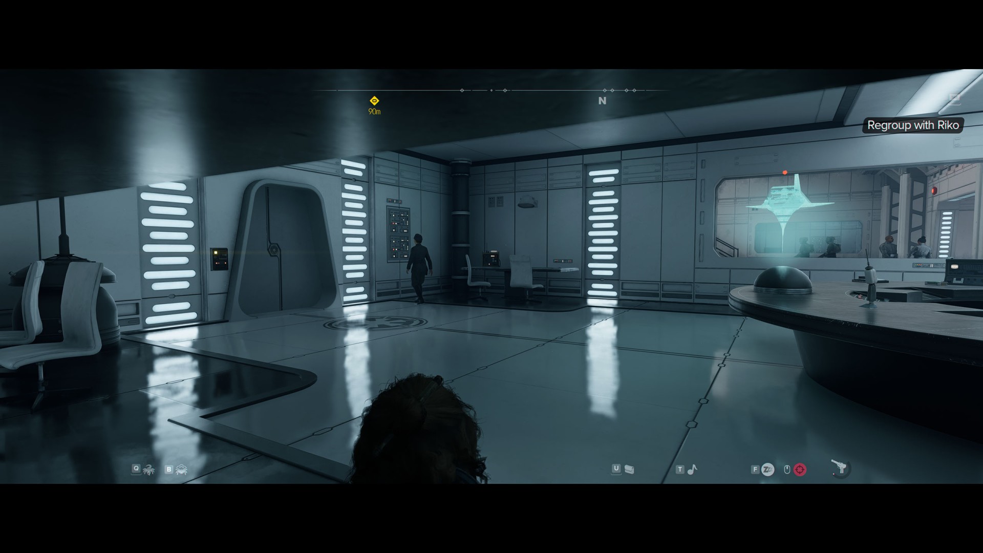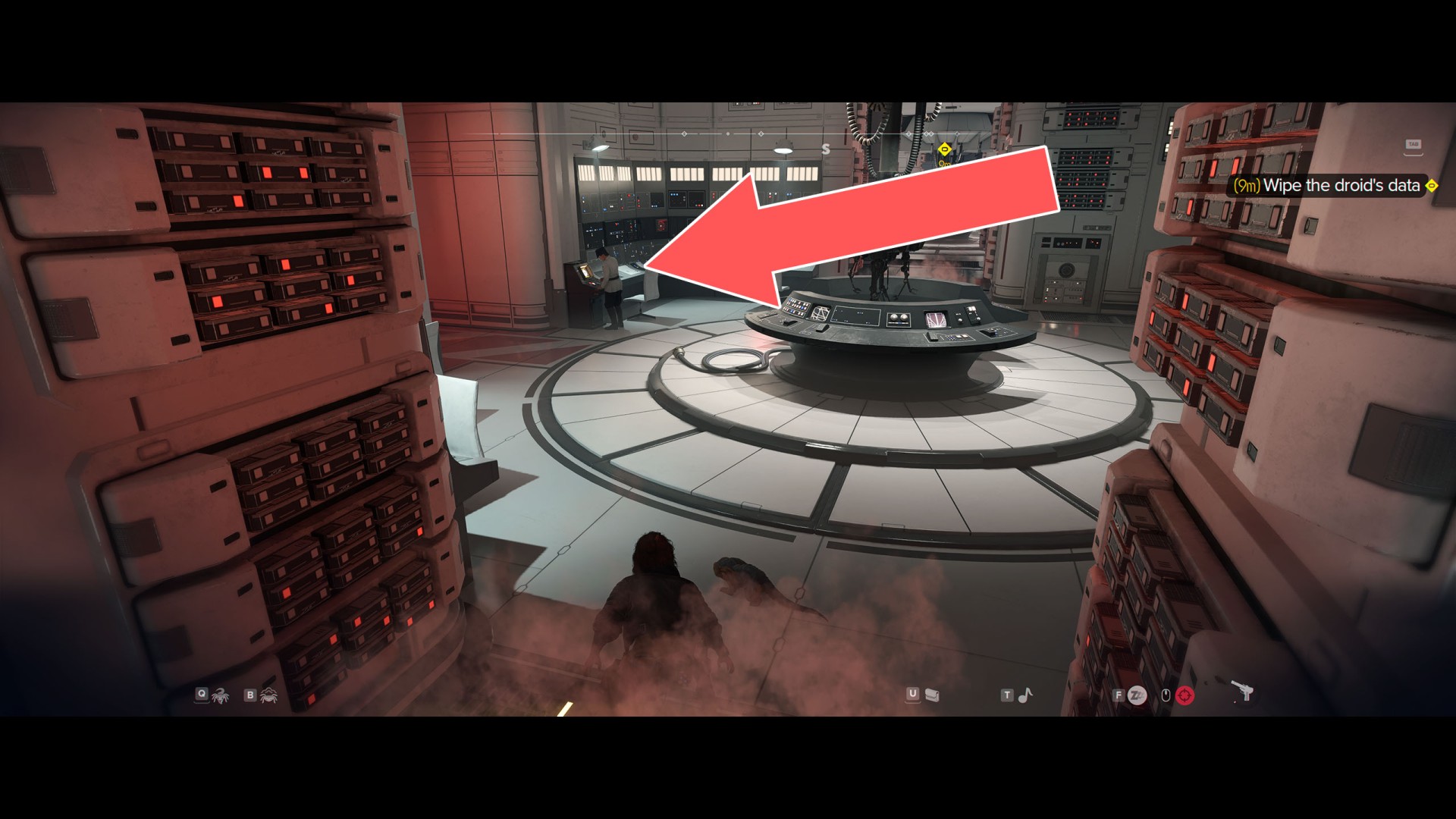 Go through the next door to the main hall. Apart from numerous Imperials patrolling the area, it is also scanned by several stationary probe droids. The terminal you are looking for is located on the east wall, but the best way to get to it is to go around the entire area clockwise. So start by going west.