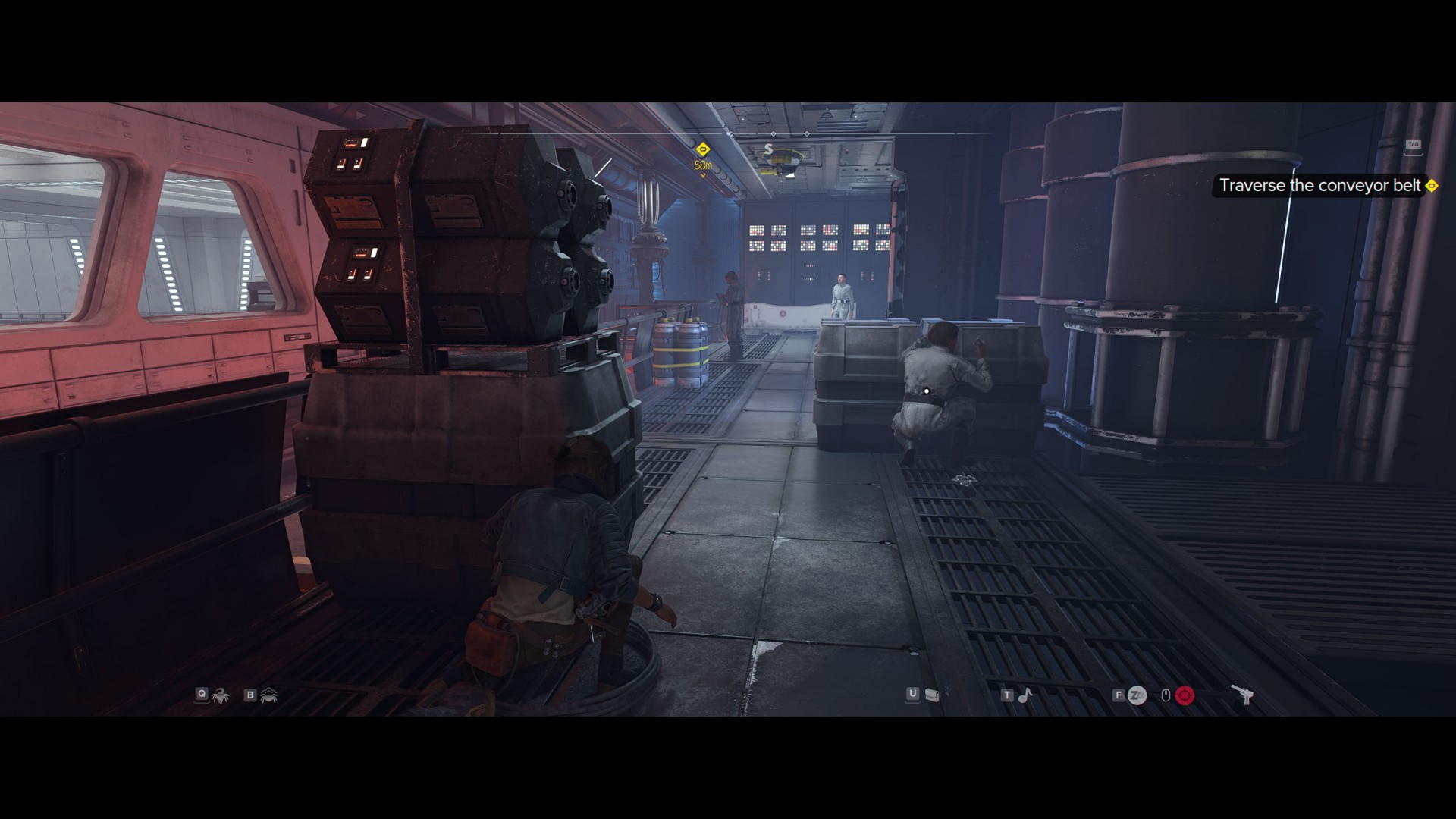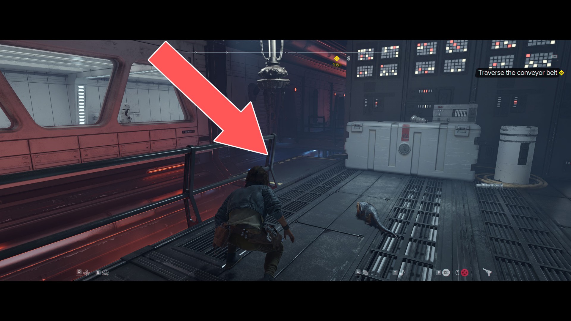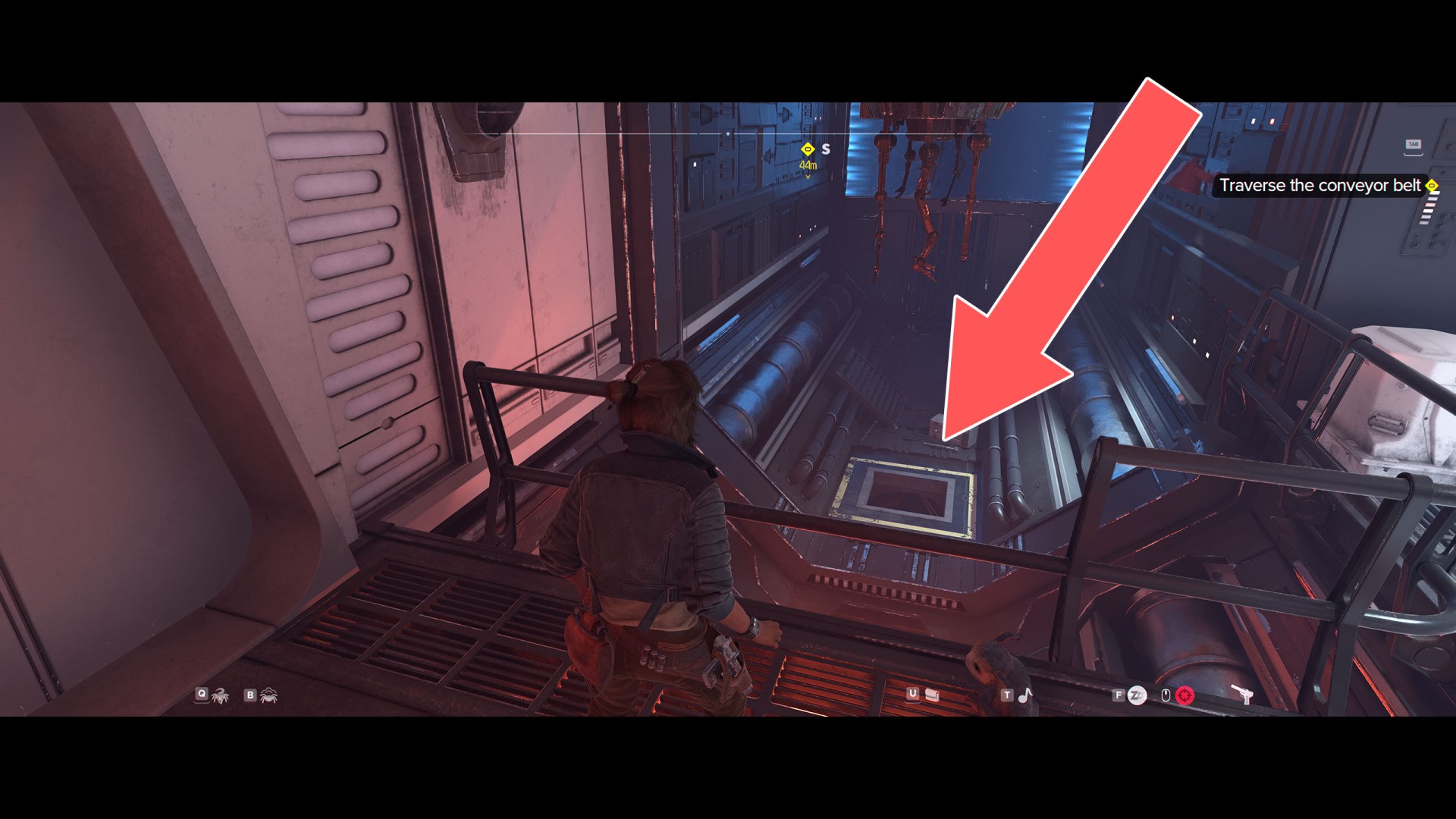 Continue along the conveyor belt to the south. At some point, you will have to jump down.