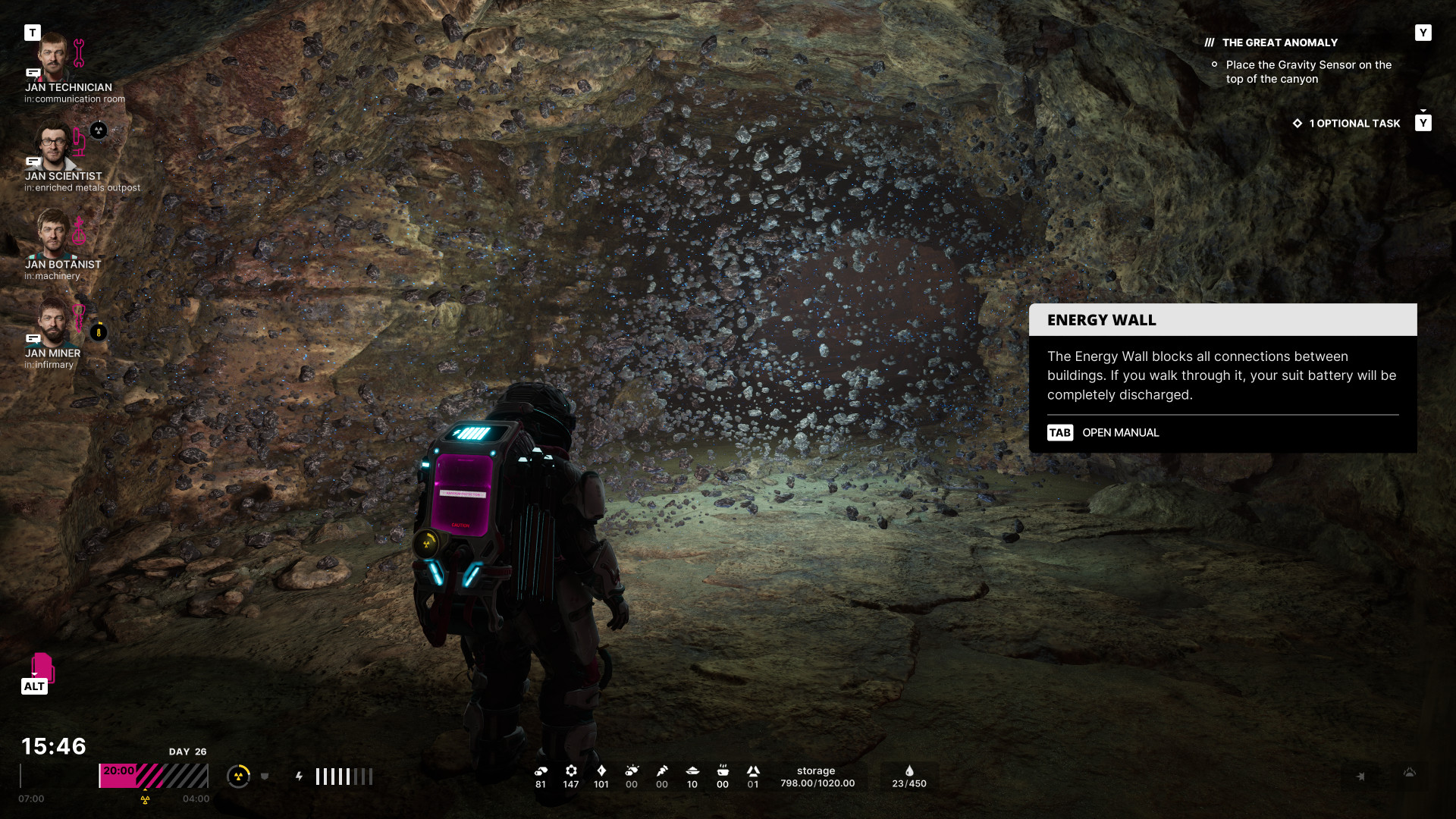 In The Alters, Energy Walls, a.k.a. Energy Gates or Energy Barriers, are significant environmental obstacles encountered during exploration, particularly from Act 2 onward. They are large, anomalous structures marked by clusters of small levitating stones. They completely drain your suit's battery when you pass through them in either direction, but they do not cause radiation damage. These barriers also block pylon connections, preventing pylons on opposite sides from detecting each other, which complicates resource network setups. Passing through a barrier won't affect the Suit Battery items.