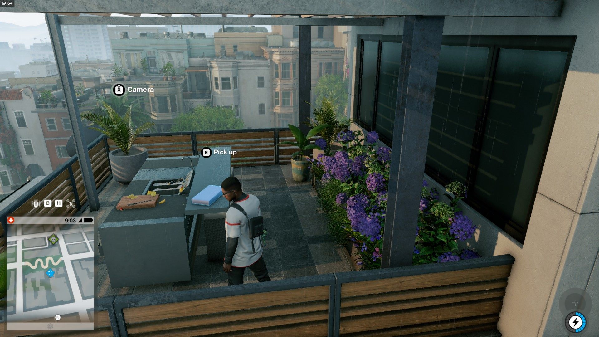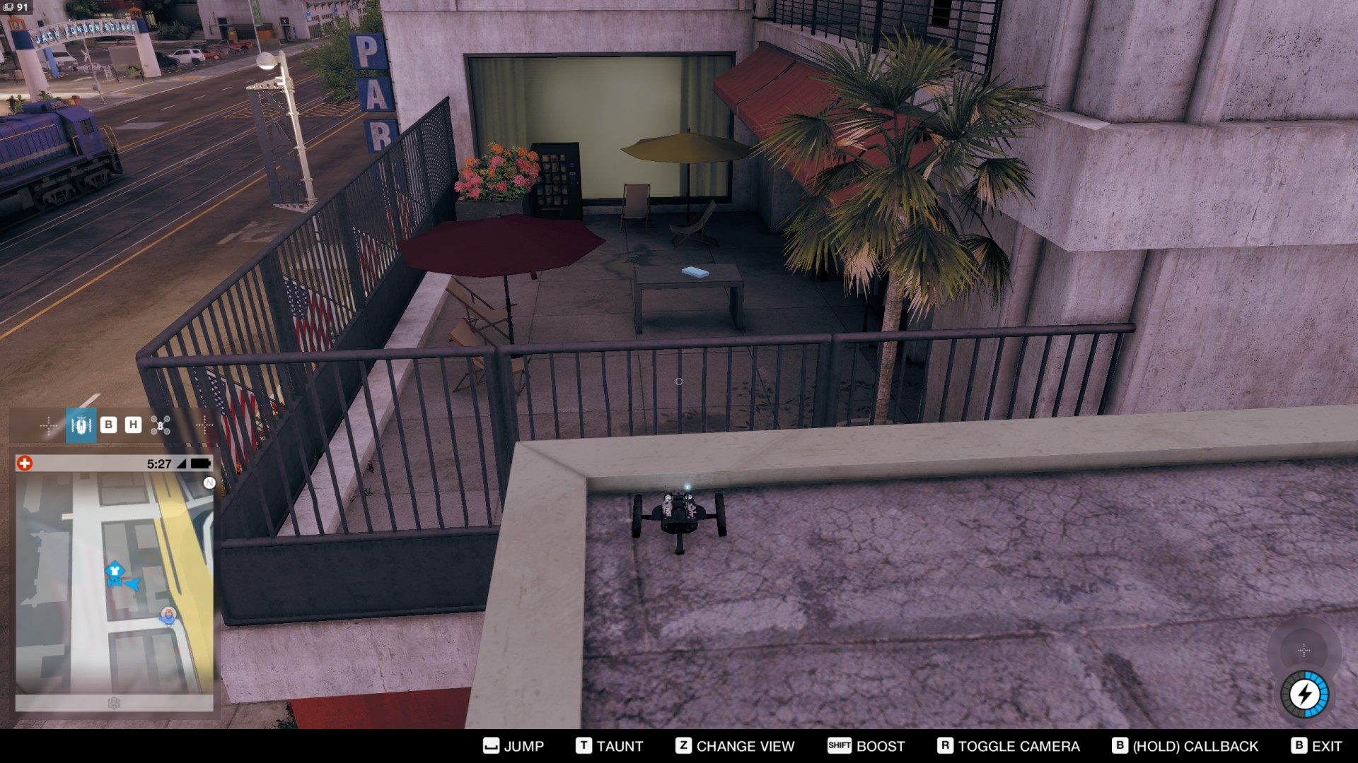 The package containing Cable Car Mask is on the terrace located on the roof of the building.