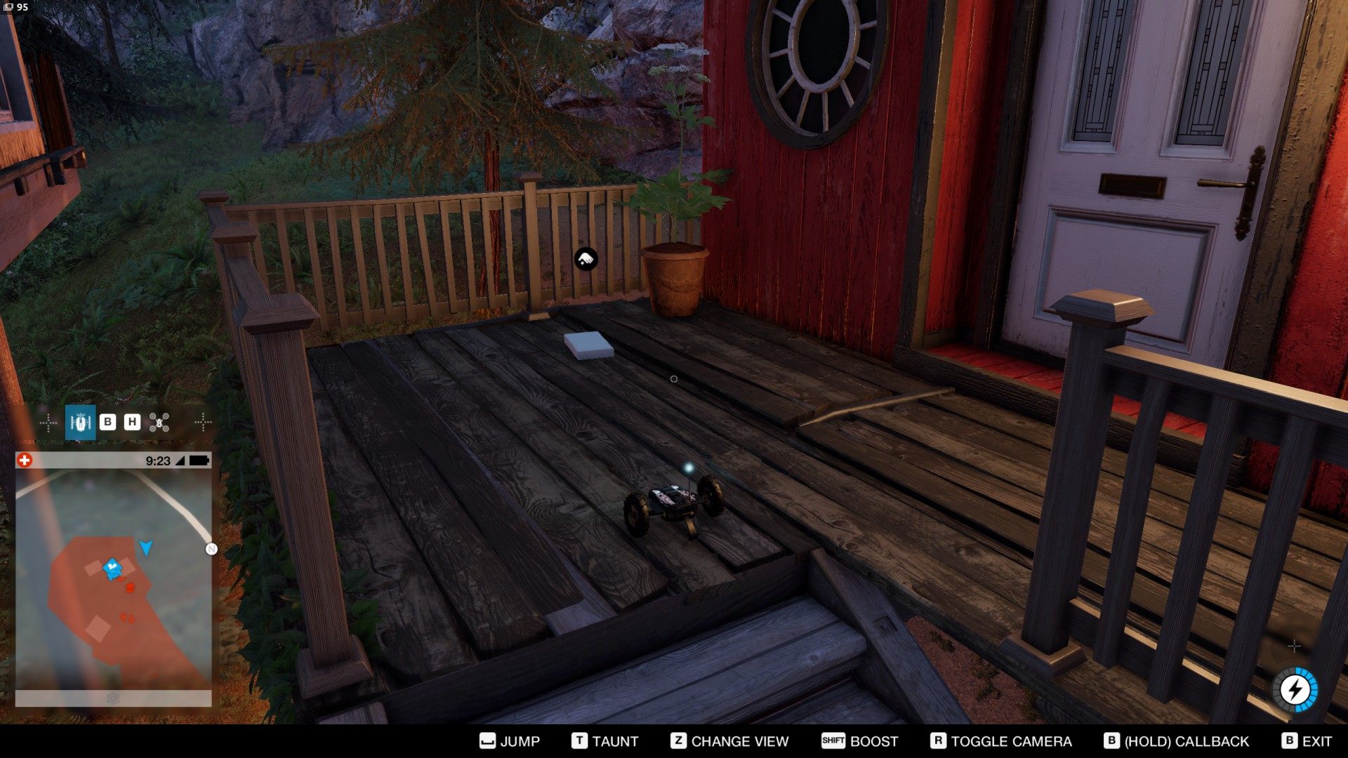 You can start outside the restricted area, in the position shown in the picture below. Activate the jumper, jump onto the roof then jump down to the porch and quickly pick up the item.
