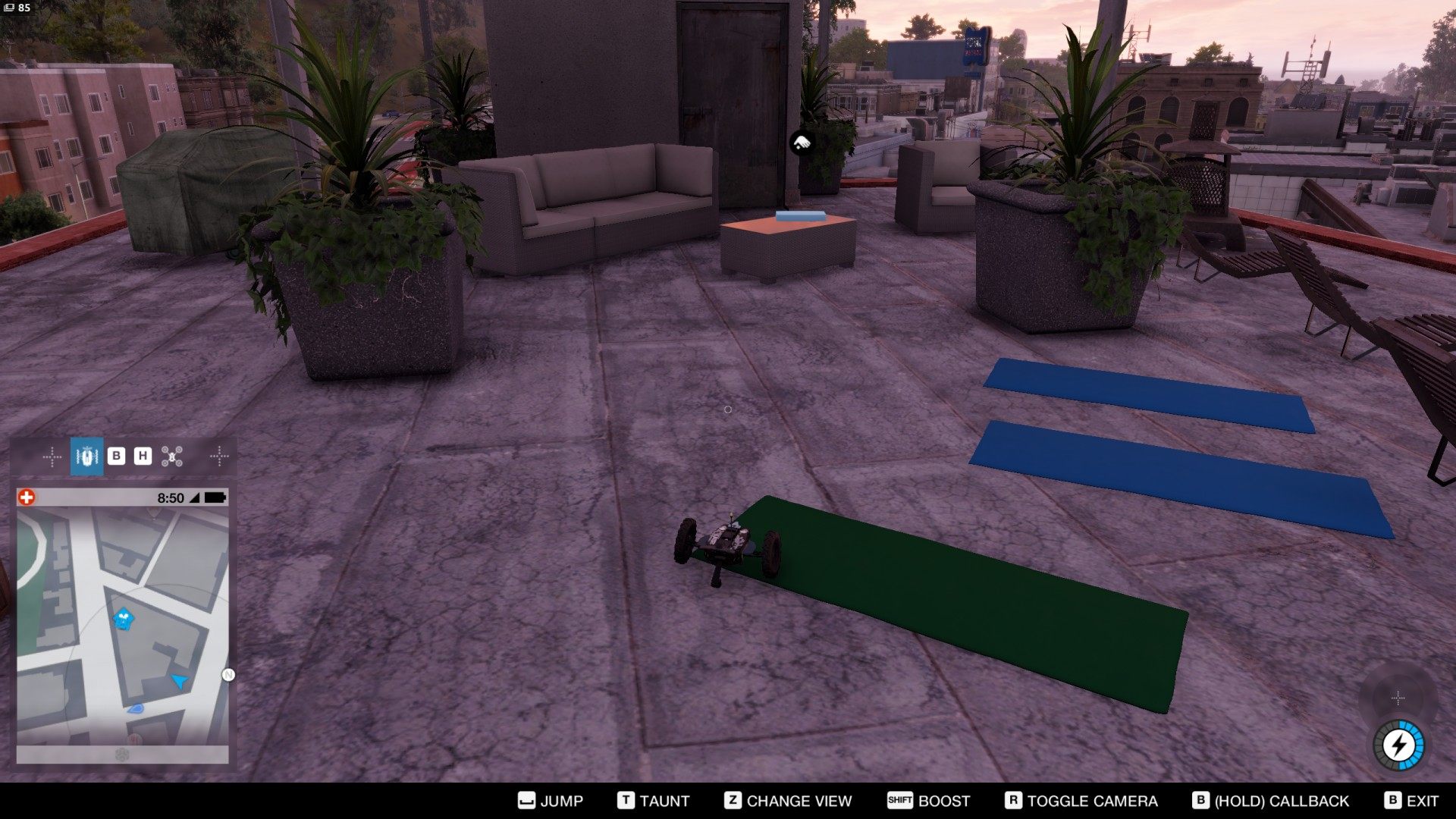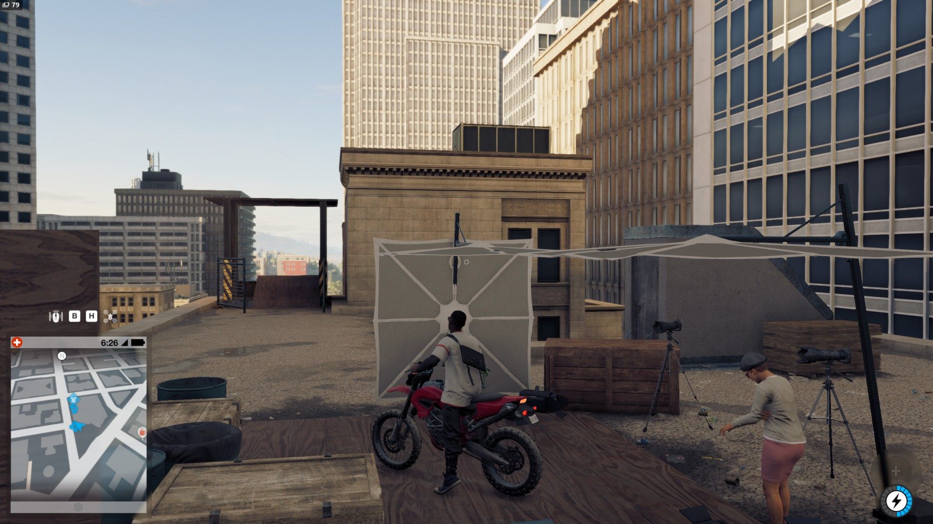 There is a motorcycle on the roof. Use it, and the ramp, to make a stunt jump to the second, lower part of the roof on which the terrace is located.