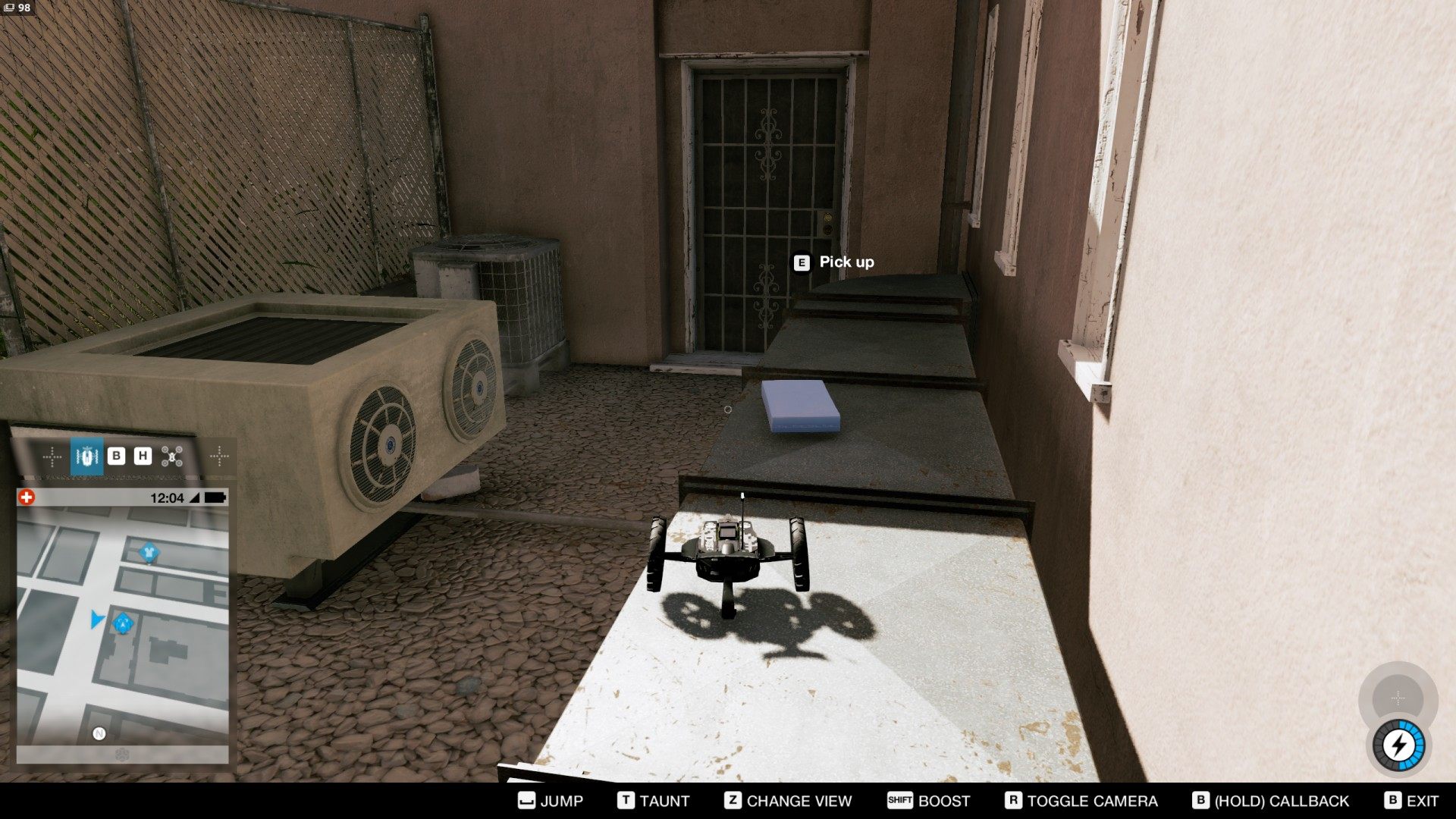 To take this item you need the jumper with improved jump height (Remote Ctrl: Enhanced Spring). Get on the roof of adjoining building and then jump onto the balcony where the item is located.