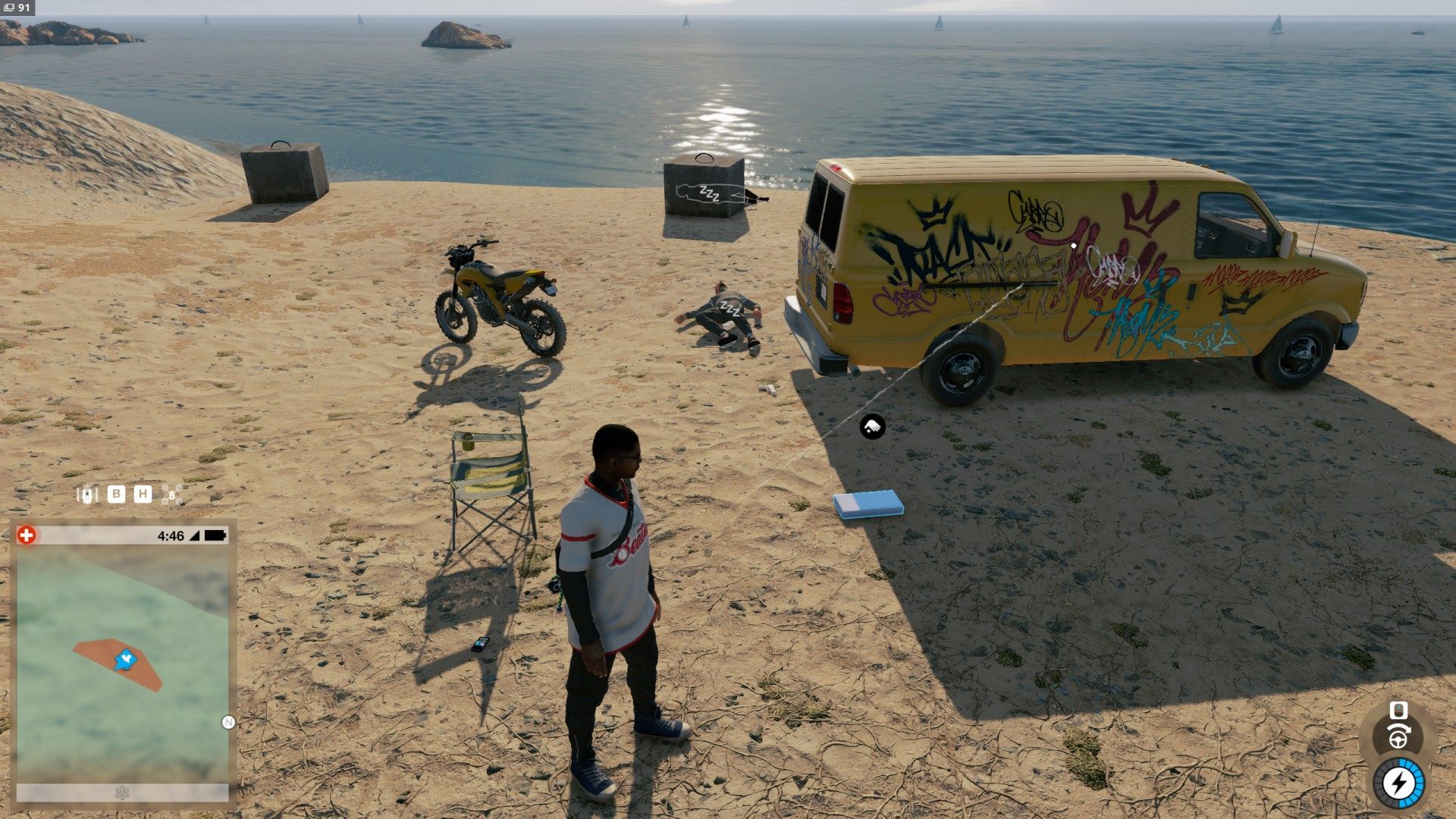 Show the mapThe package containing T-Shirt Skyline lies on the ground next to a van parked on the beach. It is a small restricted area guarded by a few guys.