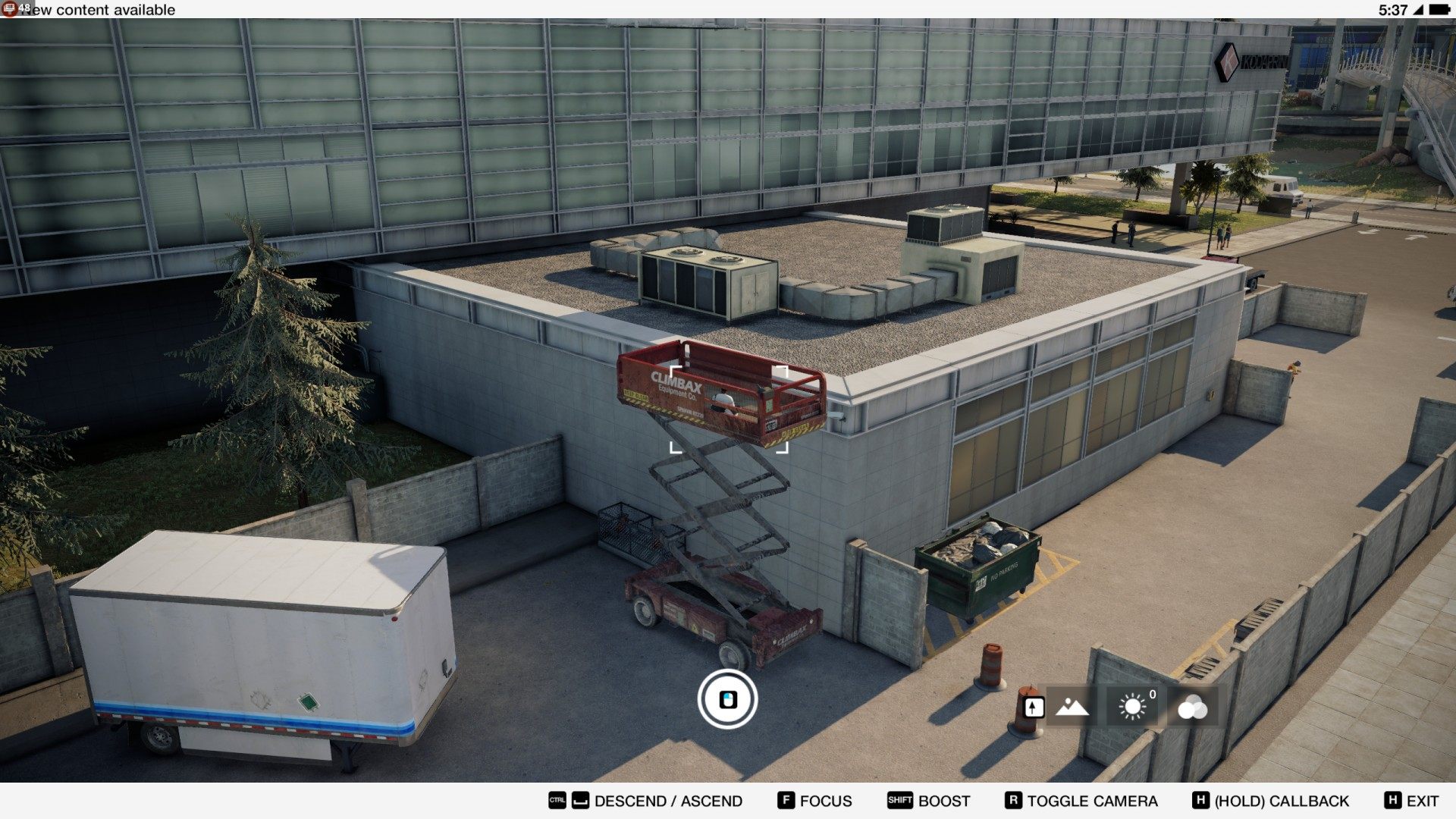 Activate RC Quadcopter and use it to take control of scissor lift located on the top level of the parking lot. Drop it to the street level.