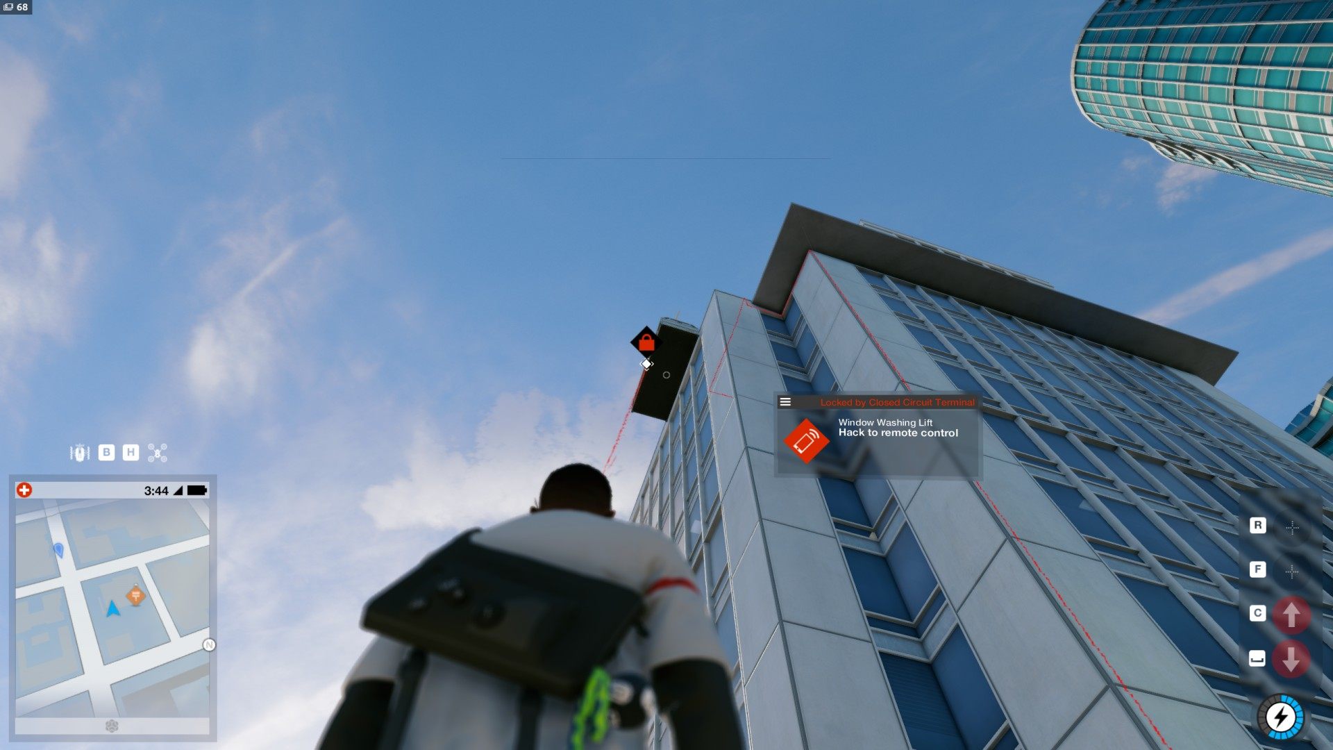 The gate is locked. To unlock it, you have to hack the closed circuit terminal located on the roof. Activate RC Jumper, drive through a hole, jump onto the roof and hack the terminal.