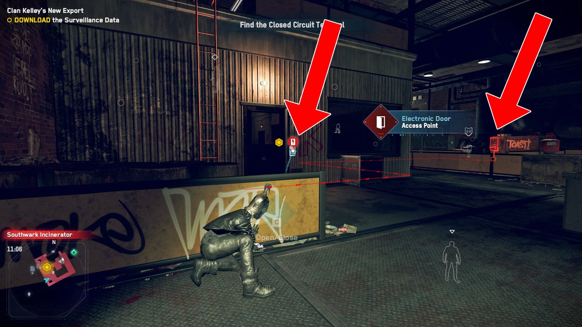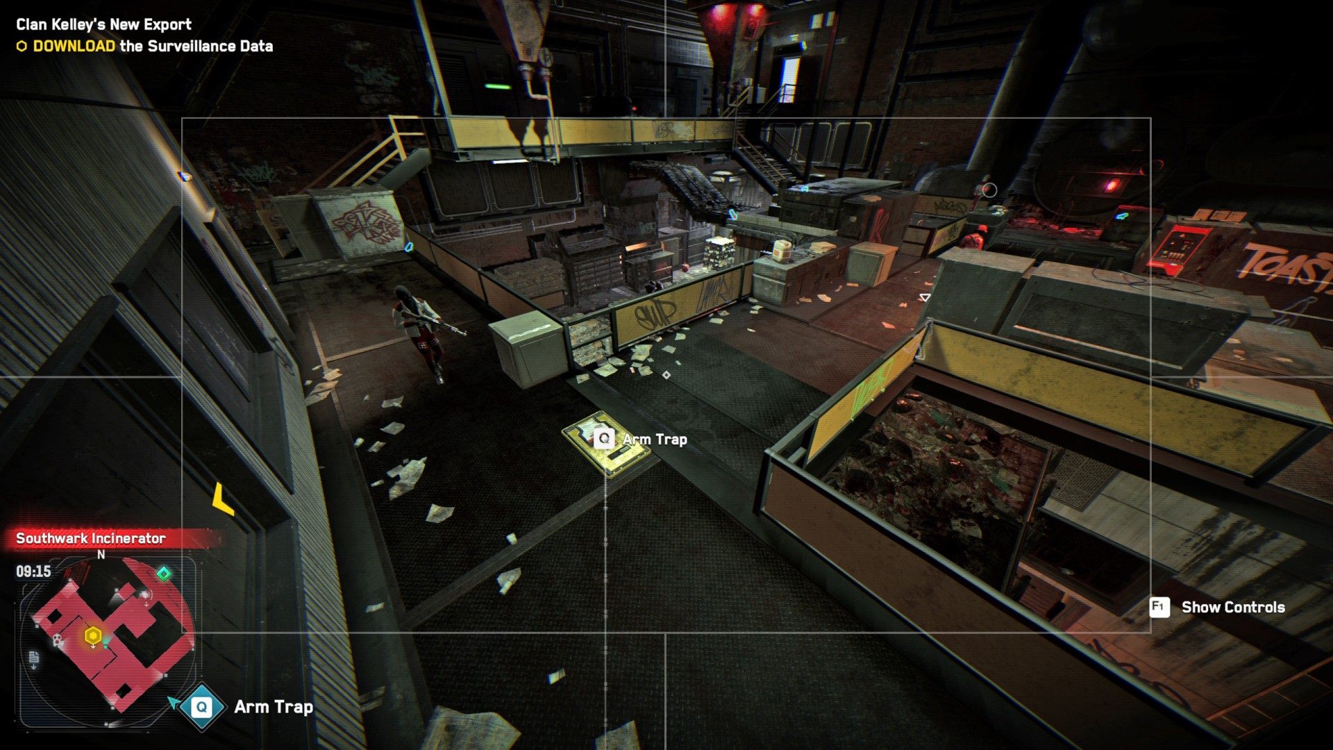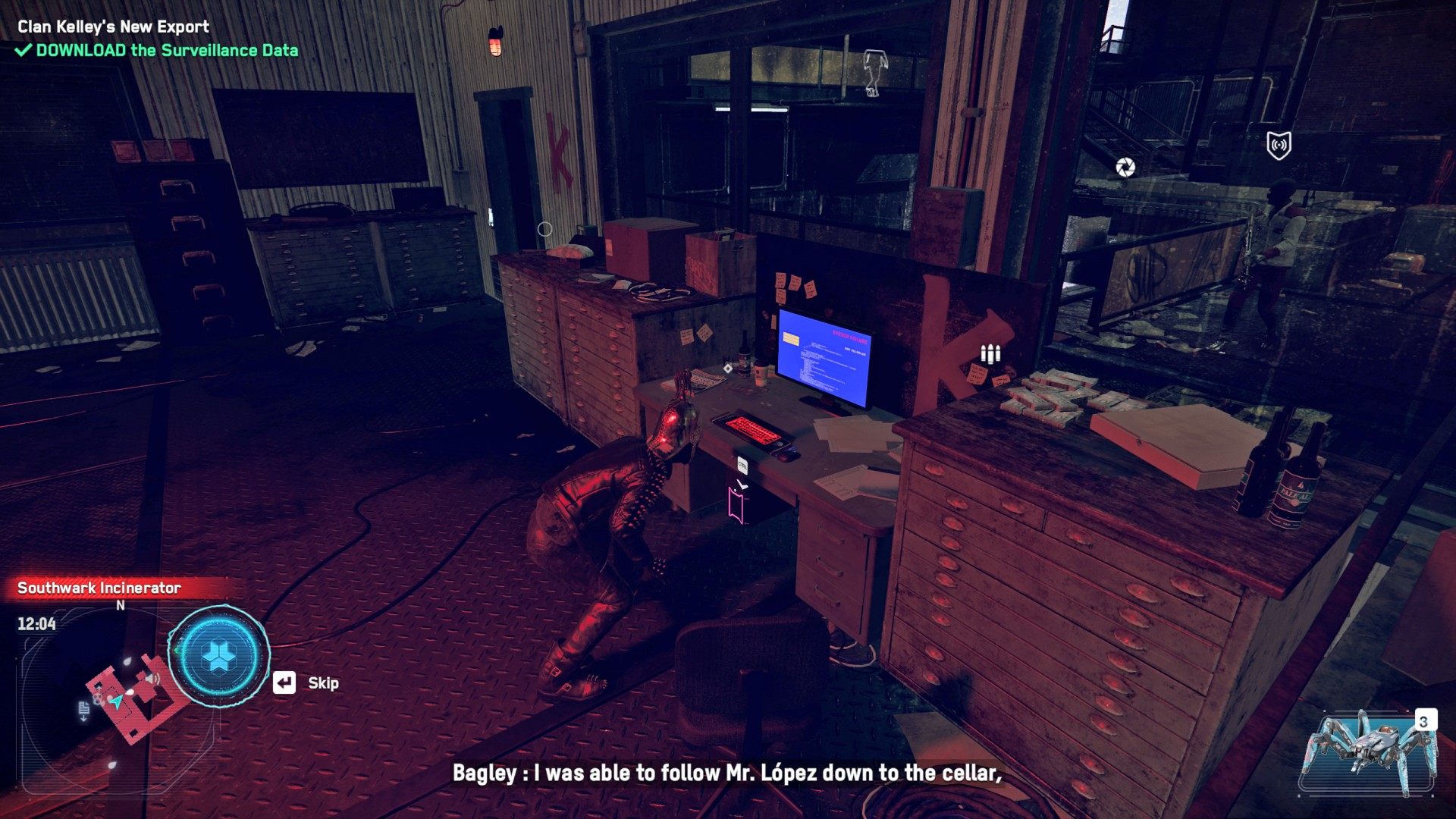 Head to the Southwark Incinerator. This is a restricted area controlled by Clan Kelley. When you arrive Bagley will suggest that you hack into the local security camera system. Do this to get an idea of what the inside of the building looks like. You can also arm a few traps and get rid of some enemies this way.