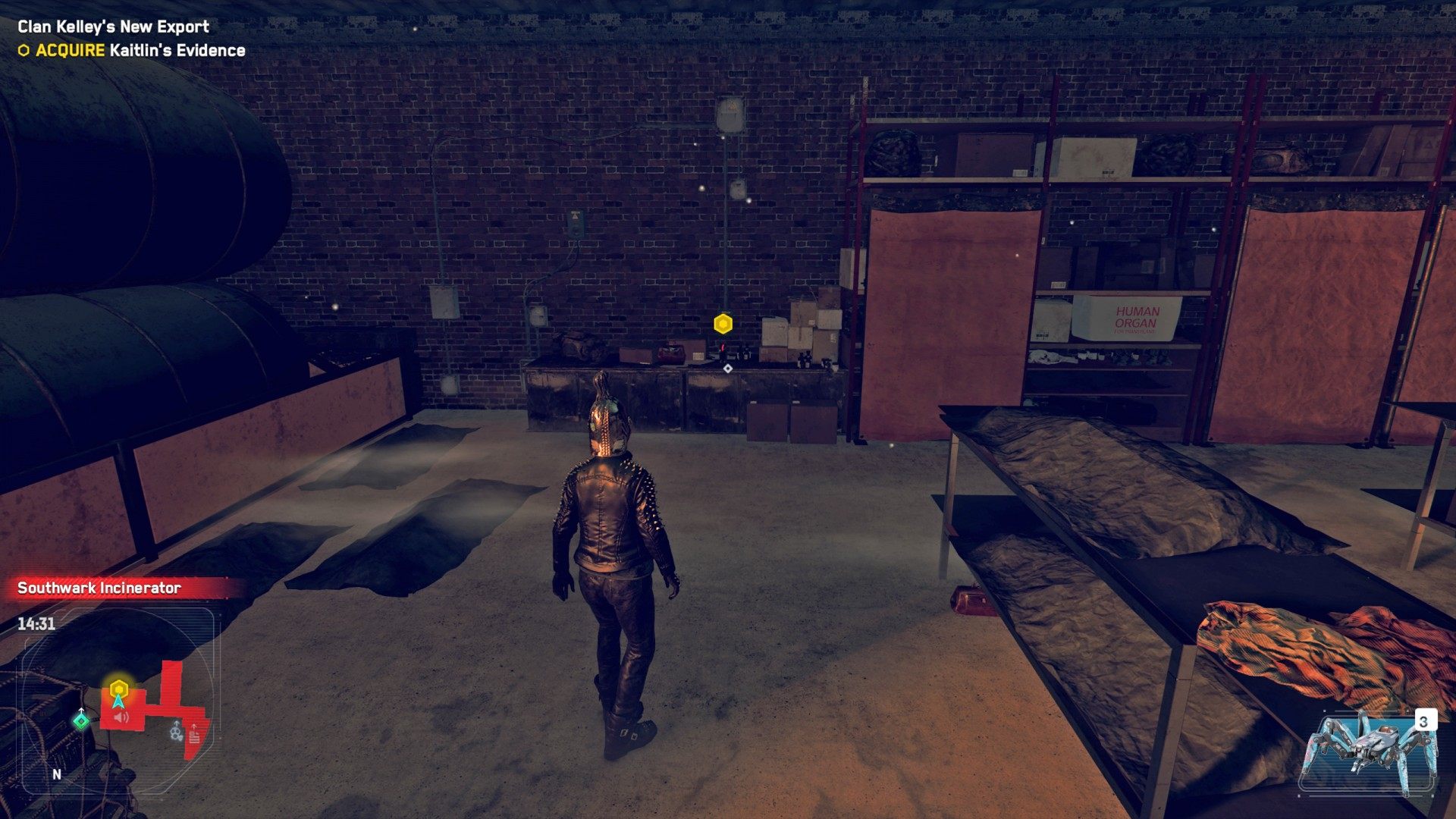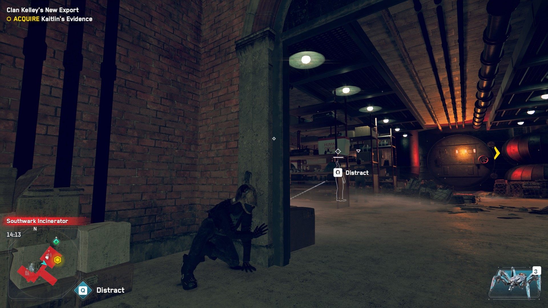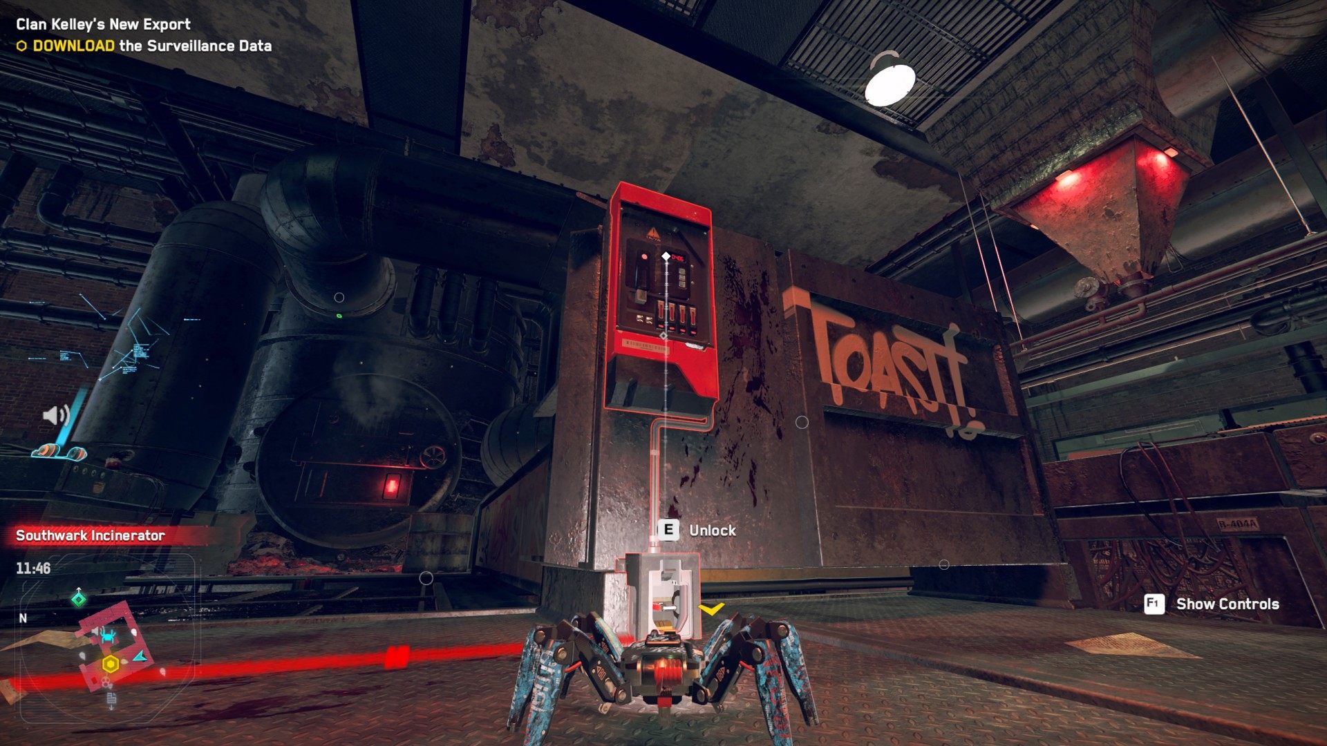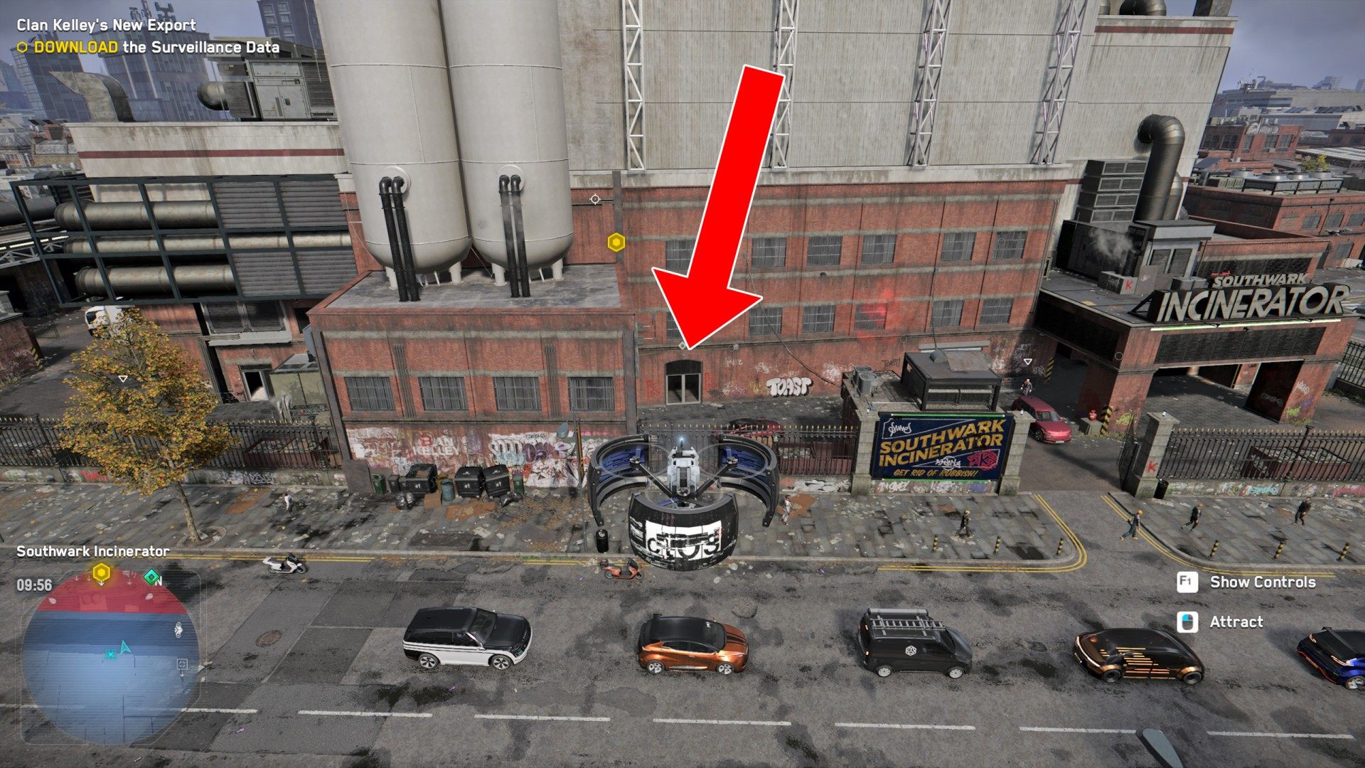 Head to the Southwark Incinerator. This is a restricted area controlled by Clan Kelley. When you arrive Bagley will suggest that you hack into the local security camera system. Do this to get an idea of what the inside of the building looks like. You can also arm a few traps and get rid of some enemies this way.