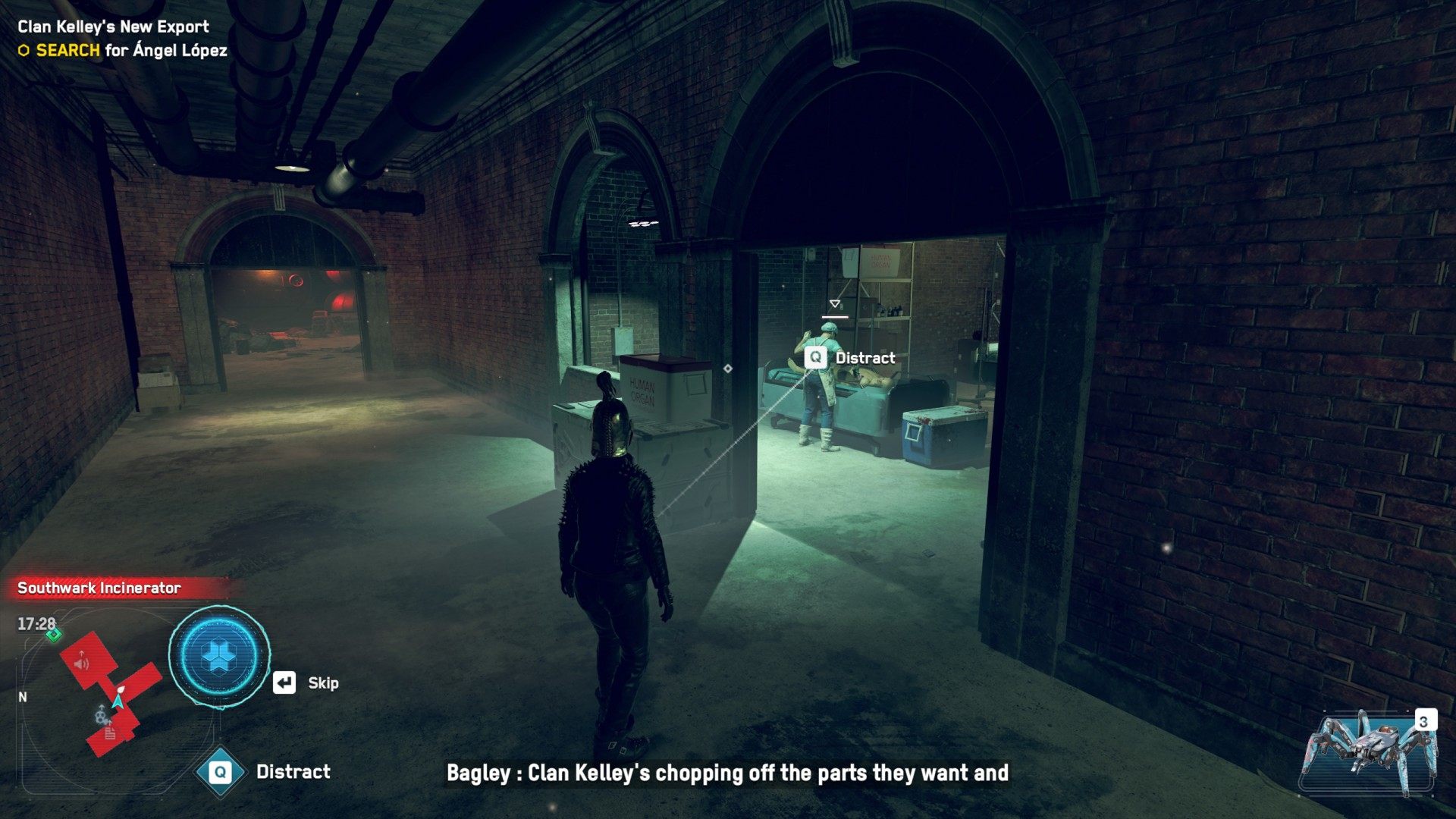 DedSec tracked Ángel López in the EPC hoping to discover a link between Clan Kelley and Zero-Day. Bagley reconstructed a scene in AR where the former operative attempted to escape, but suddenly fell unconscious after being implanted with an unknown device. He was taken to the Southwark Incinerator by Clan Kelley.