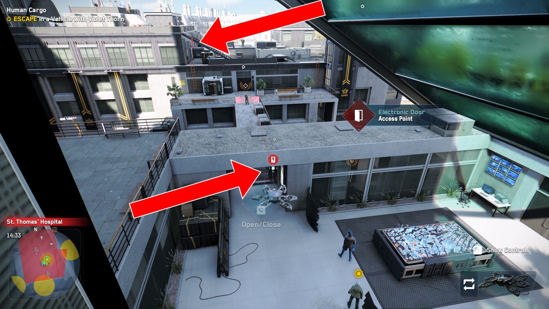 To open the gate you must deactivate the closed circuit terminal. It is located on the roof of the next building and you can use the multidrone to do this. Be careful that a soldier patrolling the area doesn't notice you.