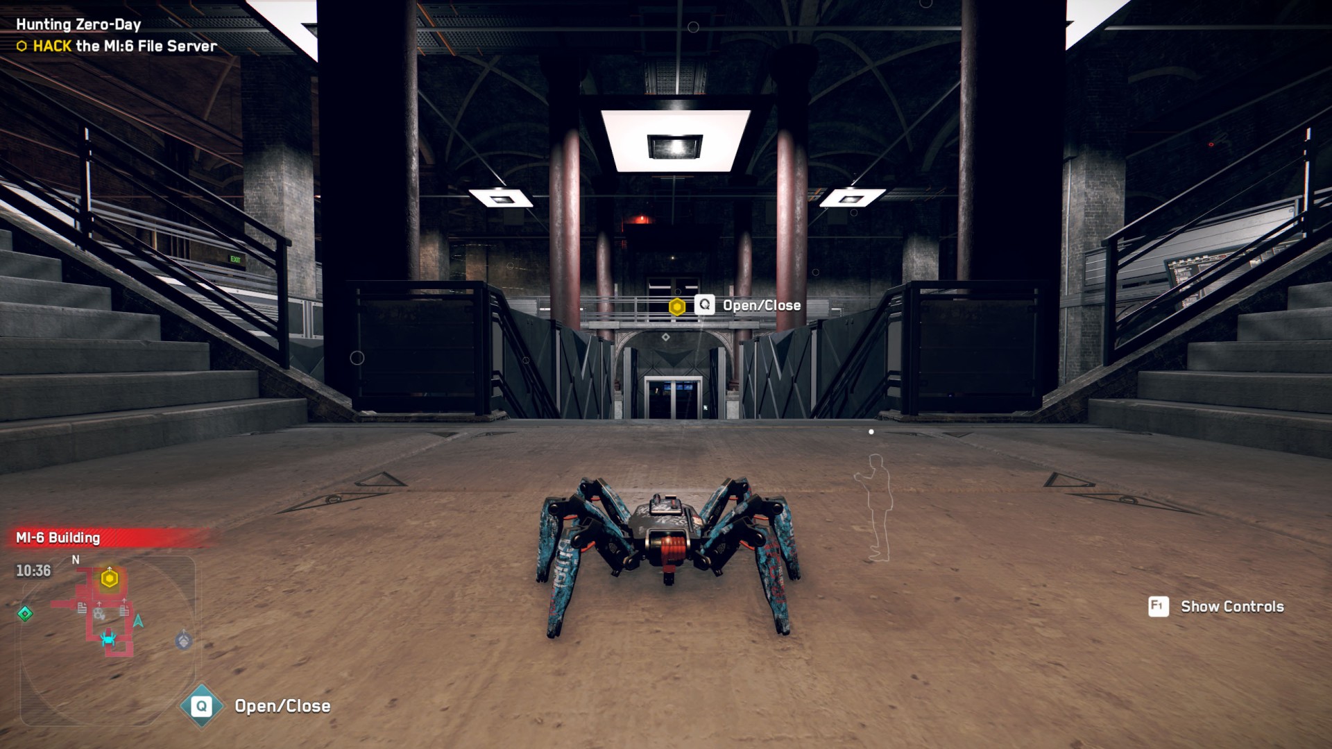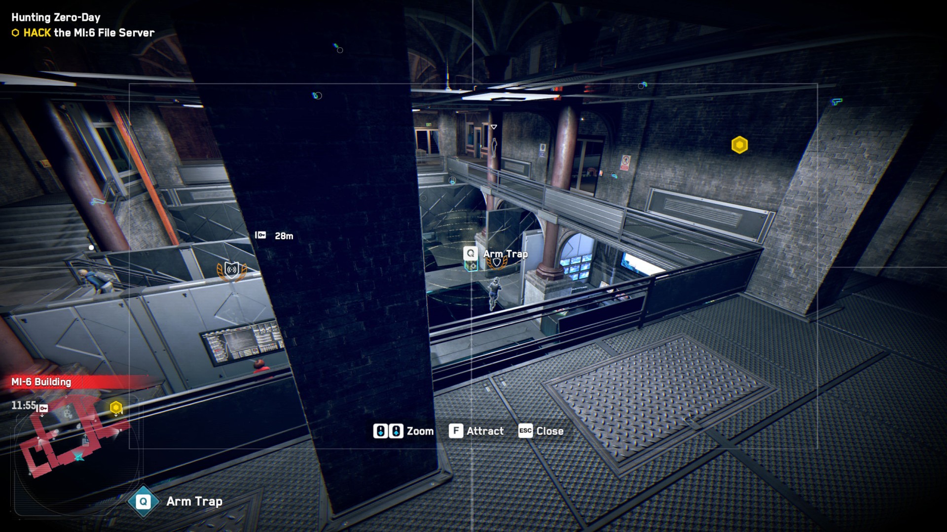 Using spiderbot, I took the staircase on the left downstairs and made my way to the server undetected, activating traps along the way that I couldn't activate using the security cameras.