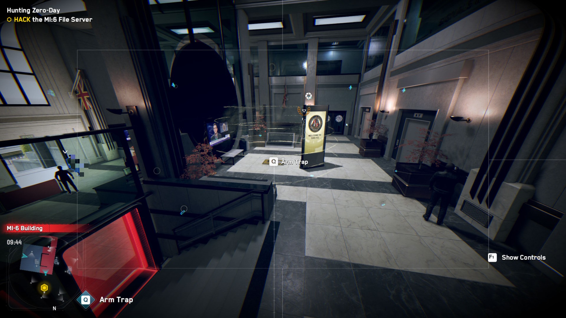 You can access the building from both the river side and the main entrance. This time I chose the second option. Using the security camera, I activated the trap and thus got rid of the guard located in the main hall.