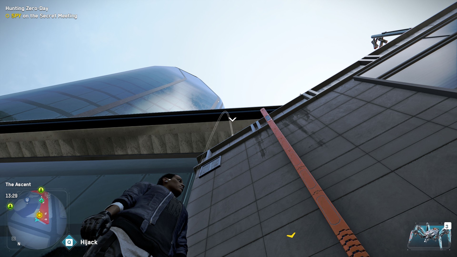 Before he abandoned the operation, Richard Malik begged DedSec to find smoking gun evidence that his former mentor, Emma Child, really is the leader of Zero-Day, who he believes are a faction of rogue spies trying to take control of the government. DedSec has maneuvered her into a meeting with her top lieutenants at The Ascent. Observe the meeting and find the smoking gun.