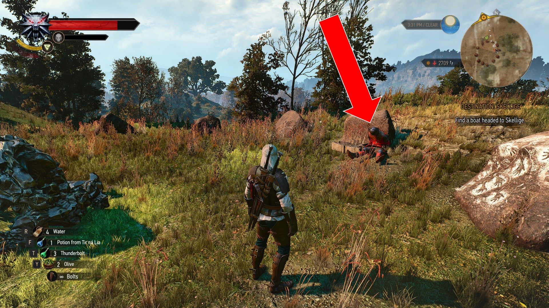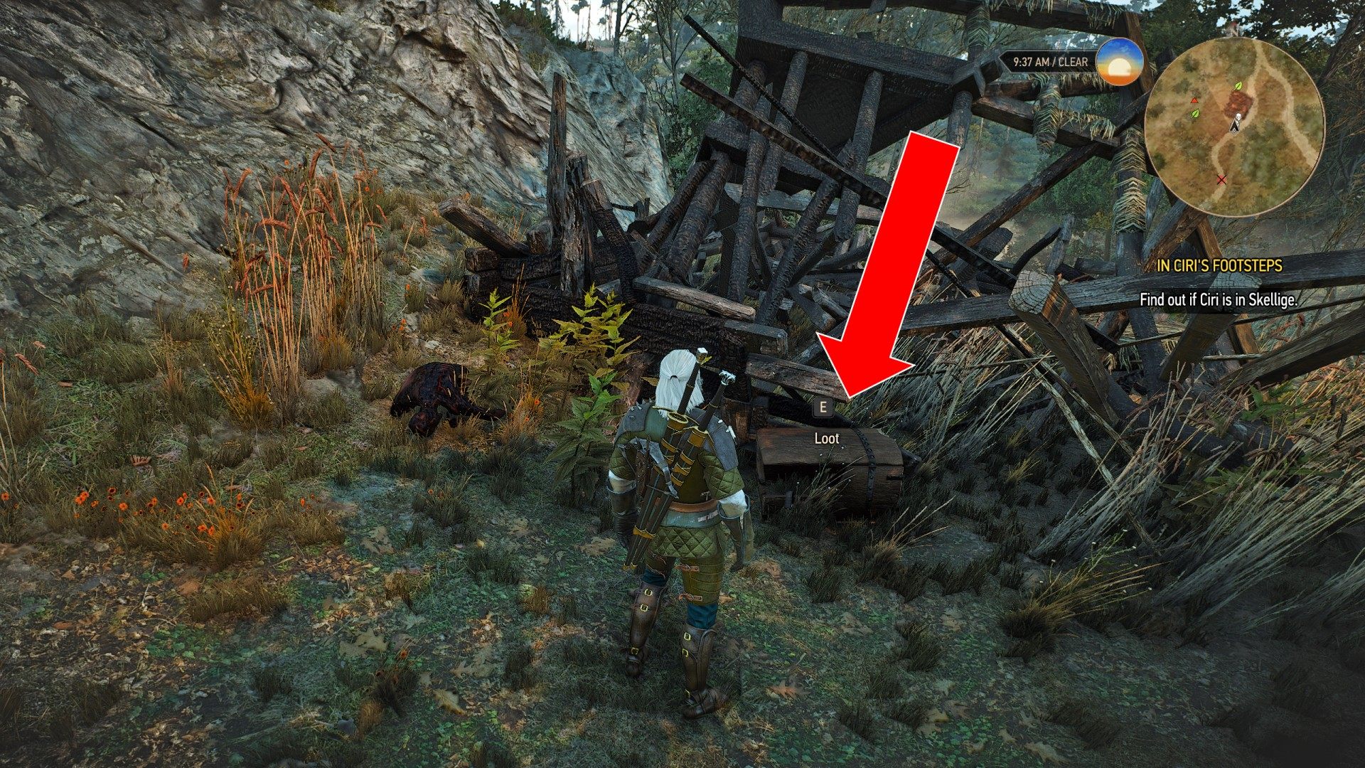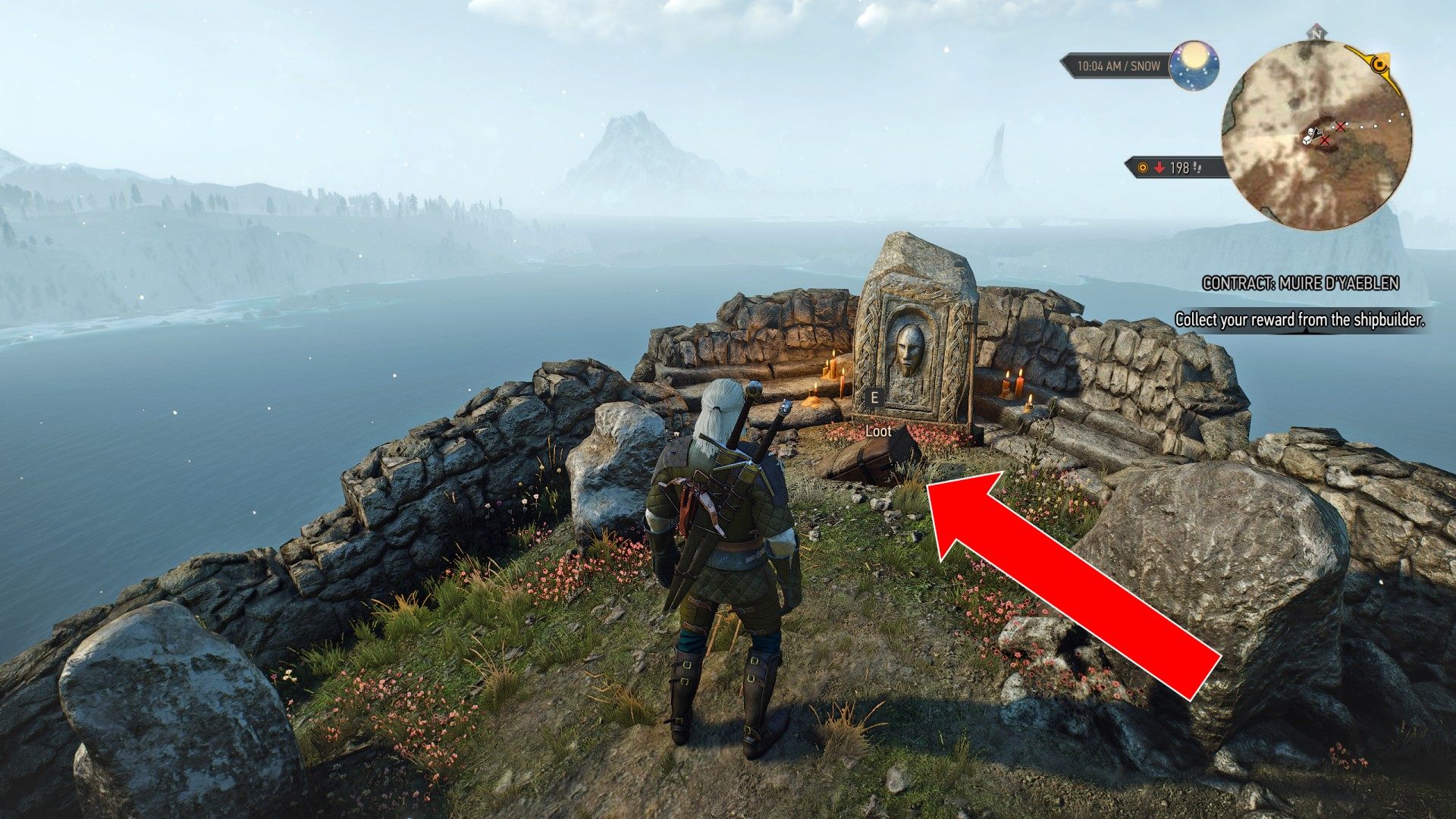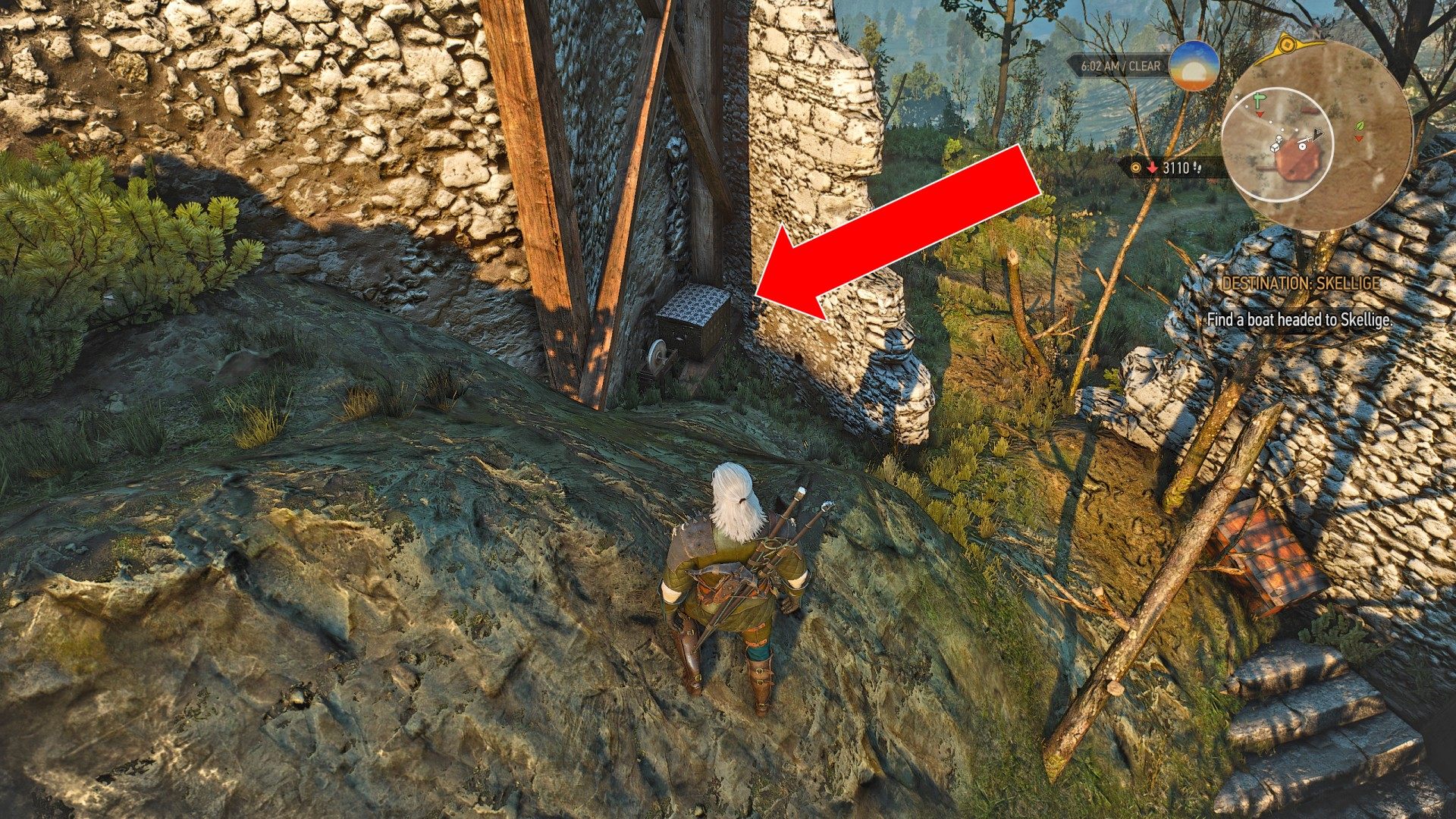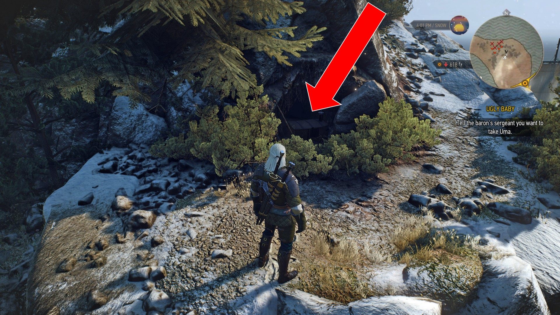 Guarded by 3 x Wraith (16) + Noonwraith (18). Mastercrafted saddle (+35 stamina), Relic. Use the aard sign to break the rocks blocking the entrance to the cave.