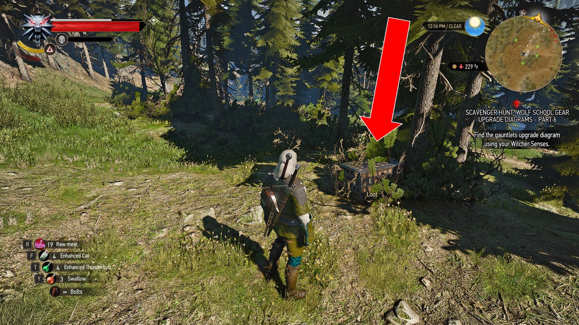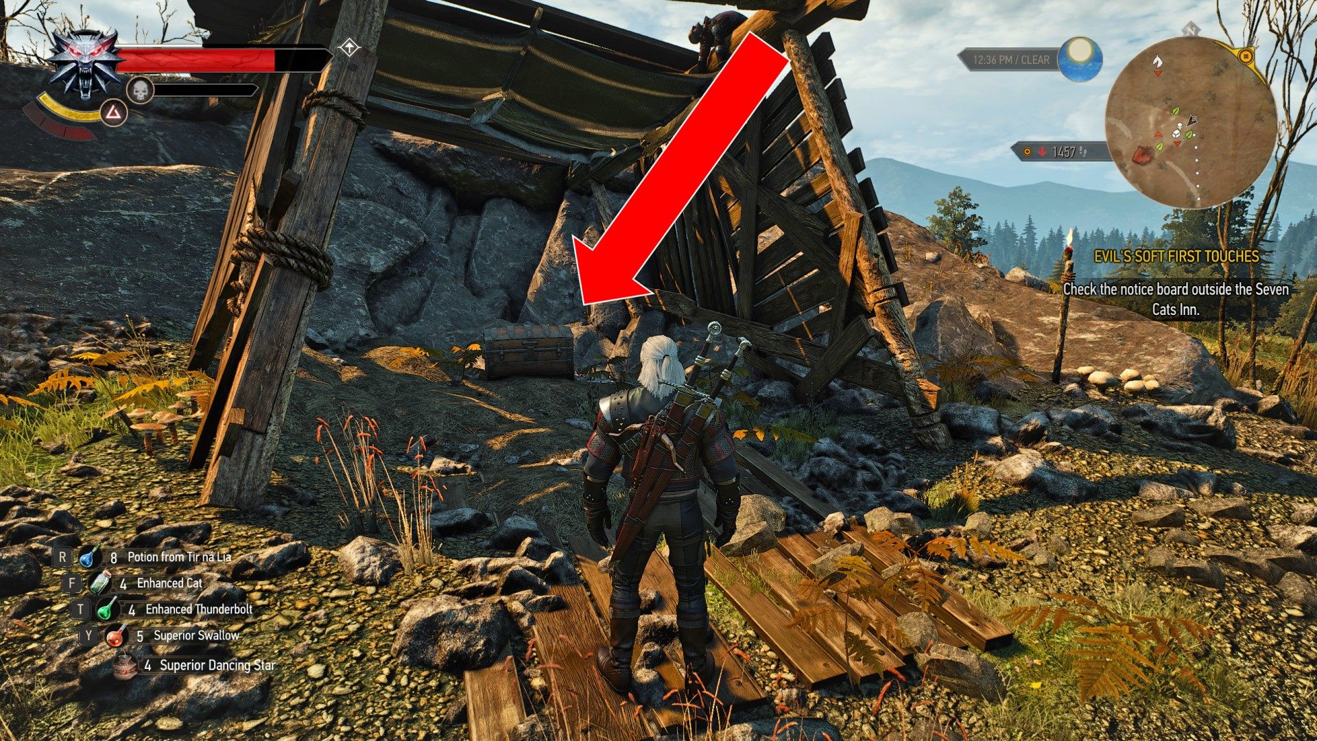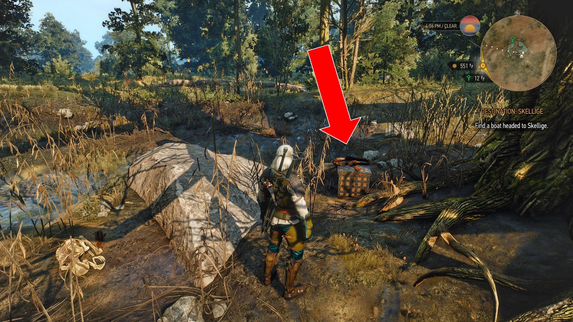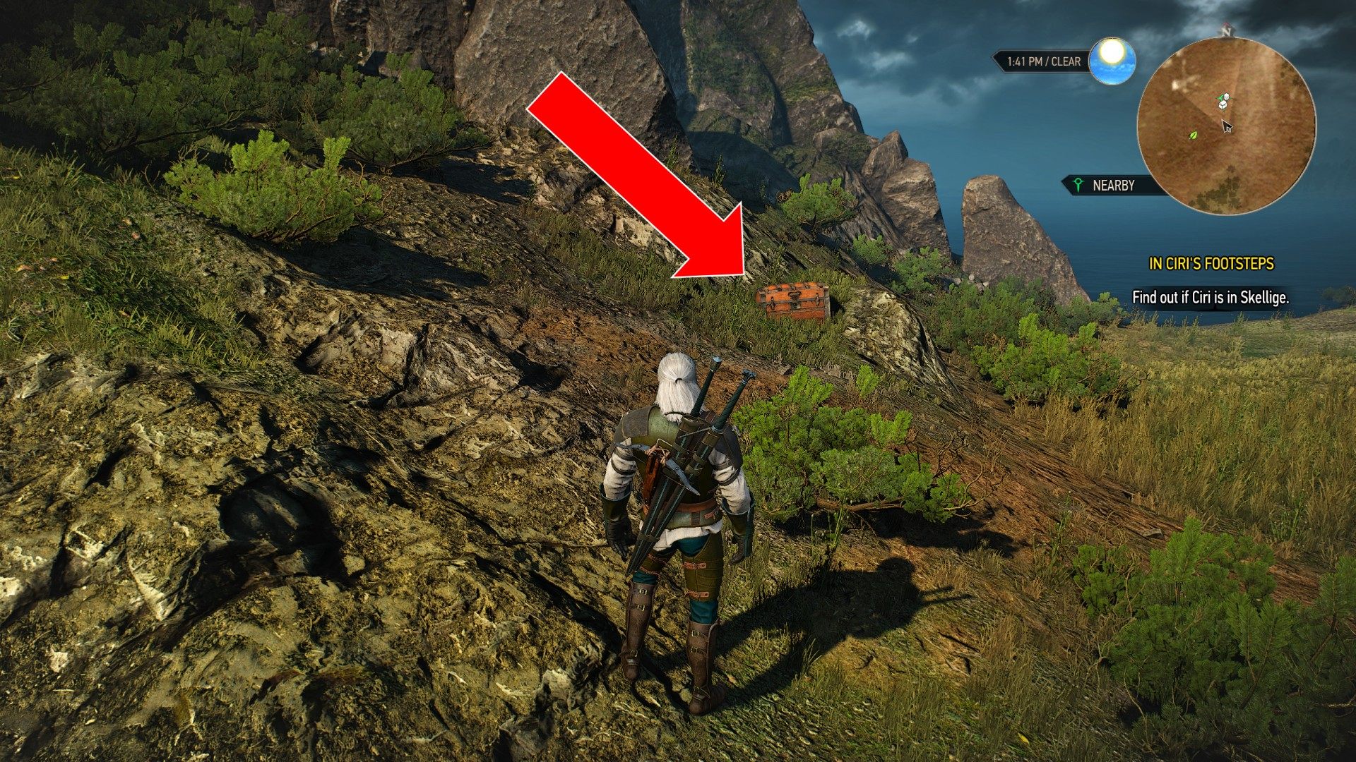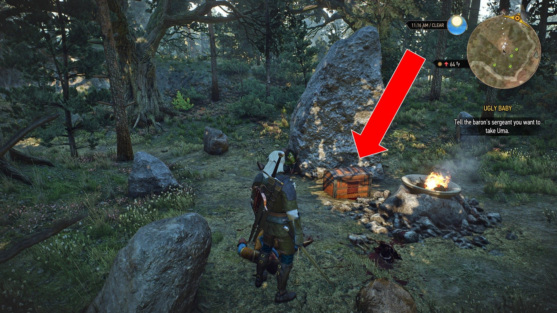 Guarded by 3 x Wraith (16) + Noonwraith (18). Mastercrafted saddle (+35 stamina), Relic. Use the aard sign to break the rocks blocking the entrance to the cave.