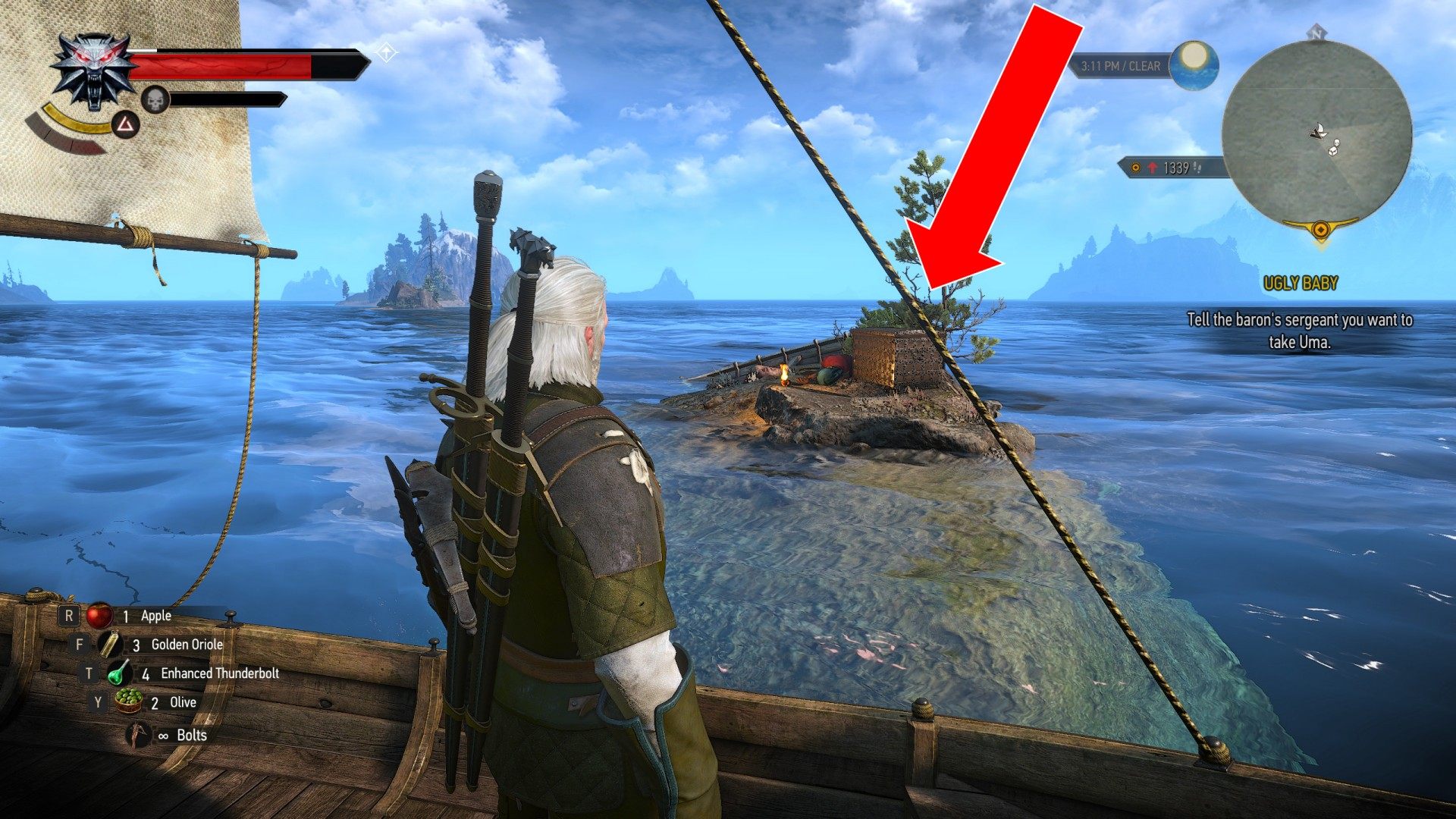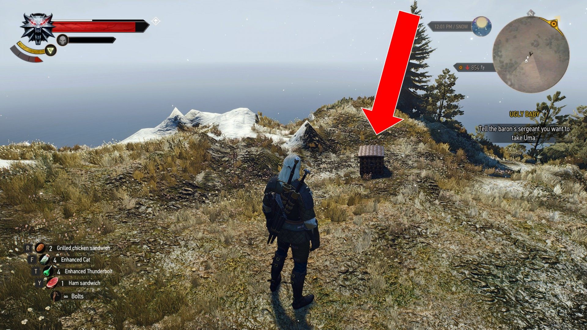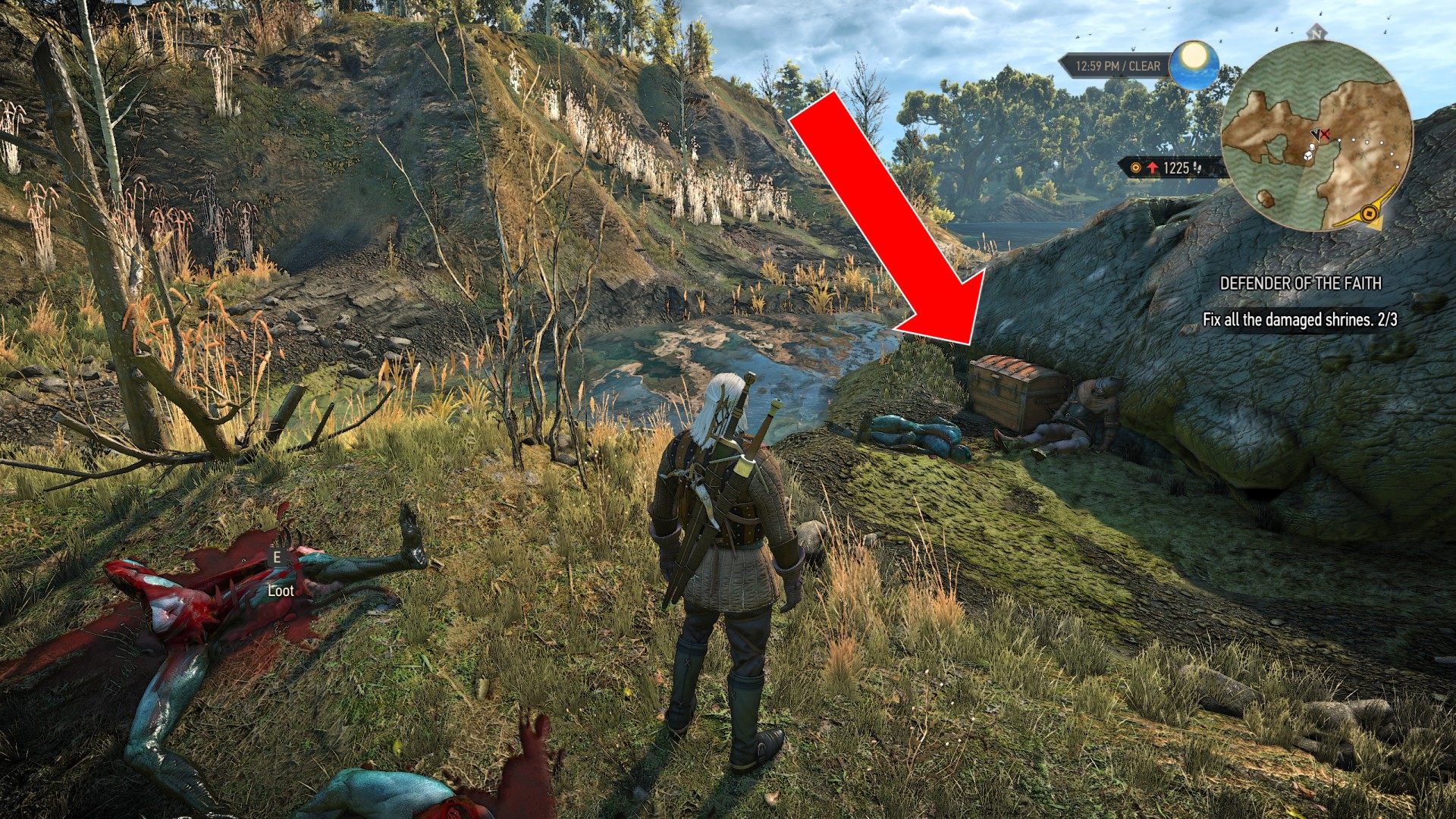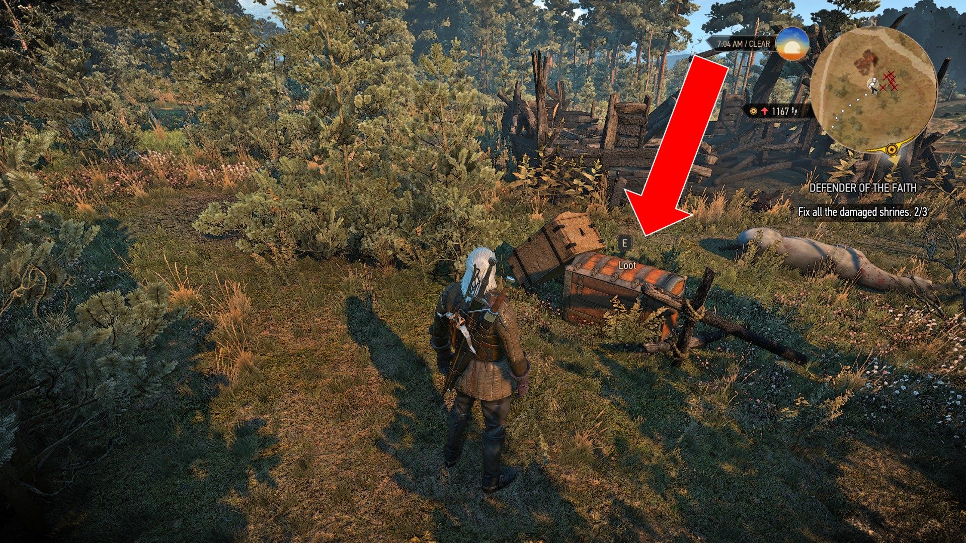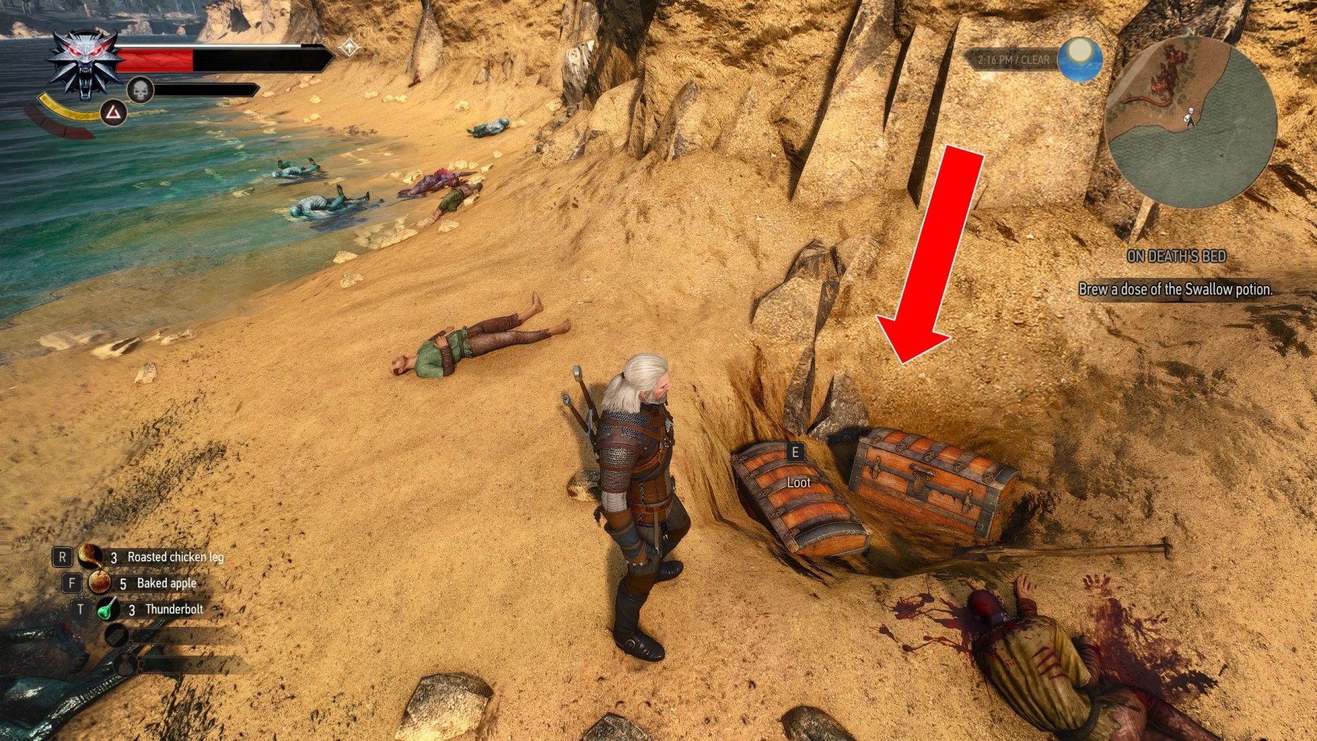 Guarded by 3 x Wraith (16) + Noonwraith (18). Mastercrafted saddle (+35 stamina), Relic. Use the aard sign to break the rocks blocking the entrance to the cave.
