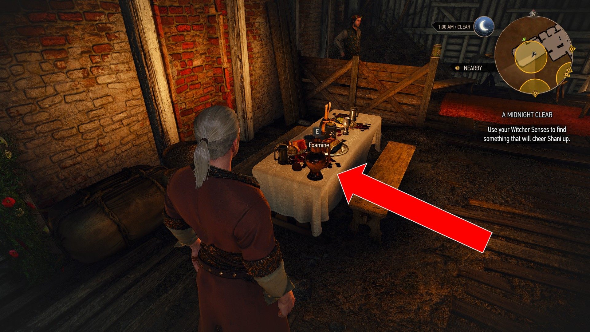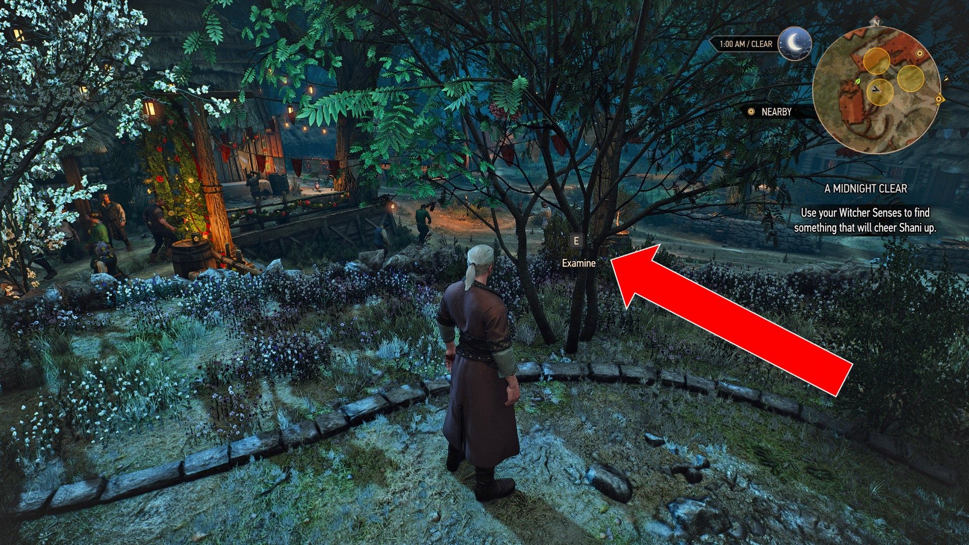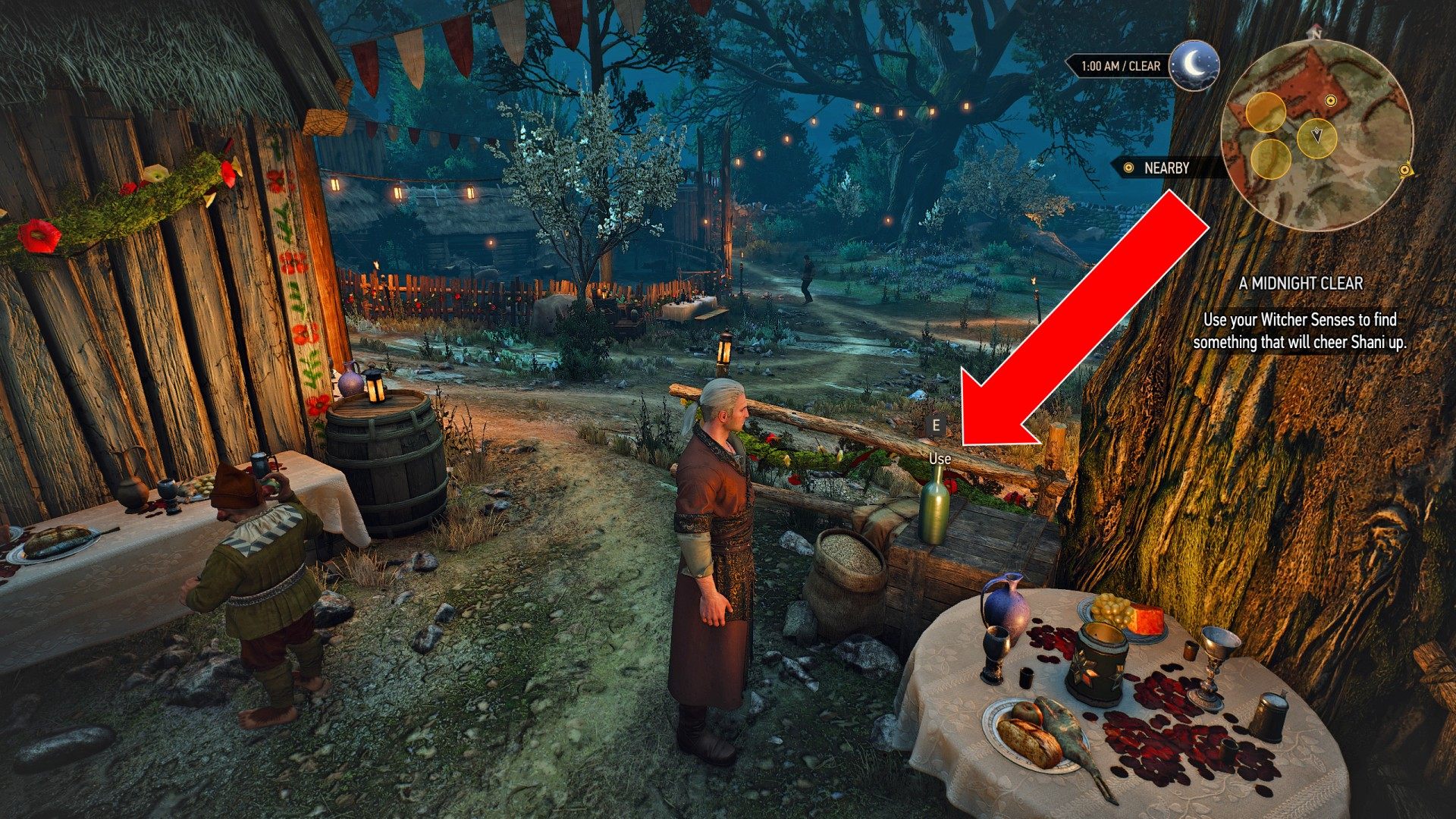 Though Vlodimir had returned to the nether realms, the night was still young and the wedding not yet over. Shani, dejected at the thought that Geralt would soon return to his many pressing concerns, was sitting alone at one of the tables, staring glumly at the crowd of merrymakers. Master Mirror advised Geralt that a bouquet of flowers or some tasty liqueur might cheer her up.