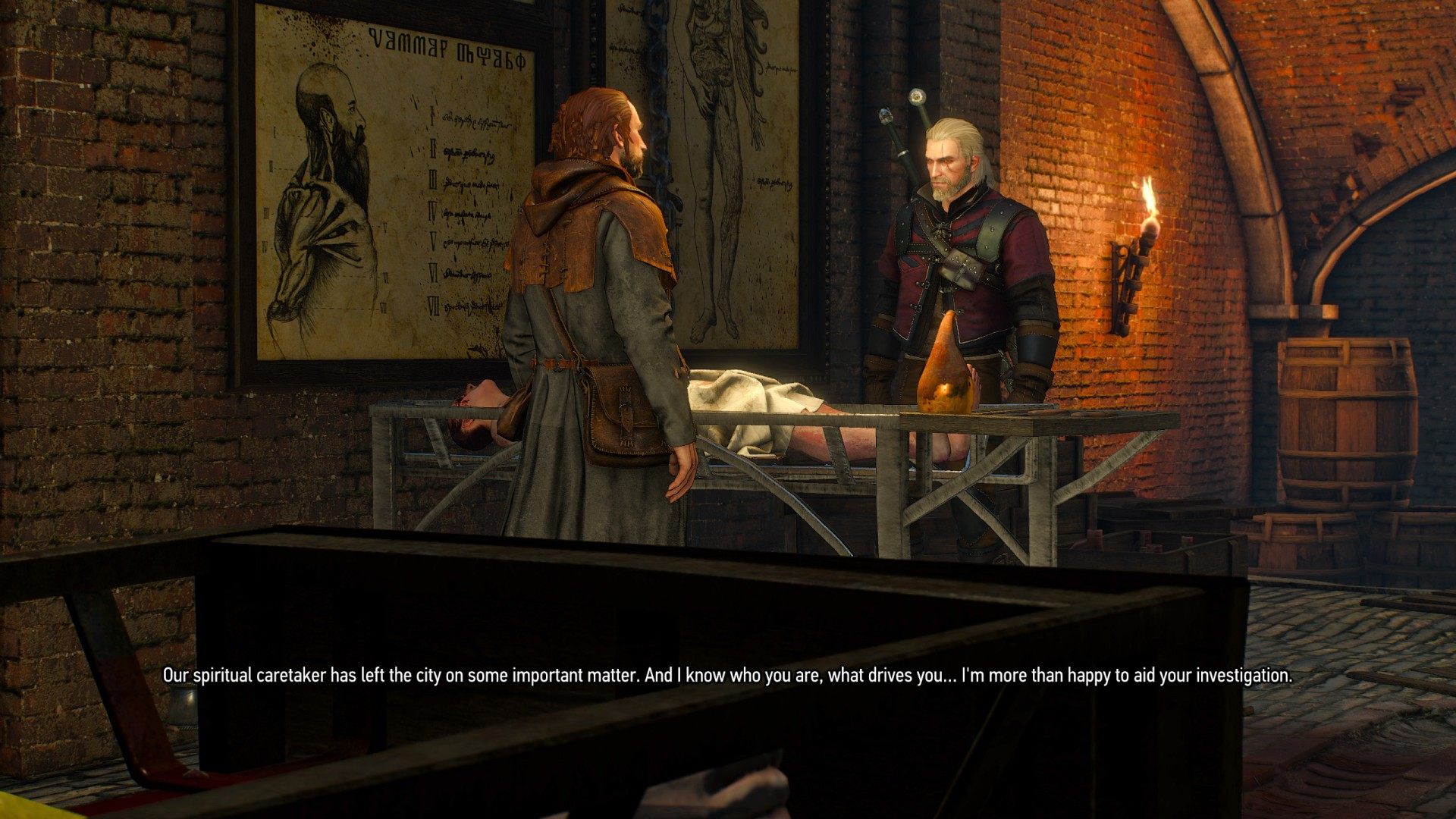 Dandelion will ask you to go to the hospital together, and you will go there immediately. Priscilla has been seriously injured and is unconscious. Dr. Joachim von Gratz, who is taking care of her, will tell you what the situation is. According to him, Priscilla was attacked by some psychopath. He'll also tell you about a previous victim who had similar injuries but did not survive the attack. You'll decide to conduct an unofficial investigation to find the perpetrator. You will start your search by getting through the sewers to the morgue to examine the body of the victim mentioned by the doctor.