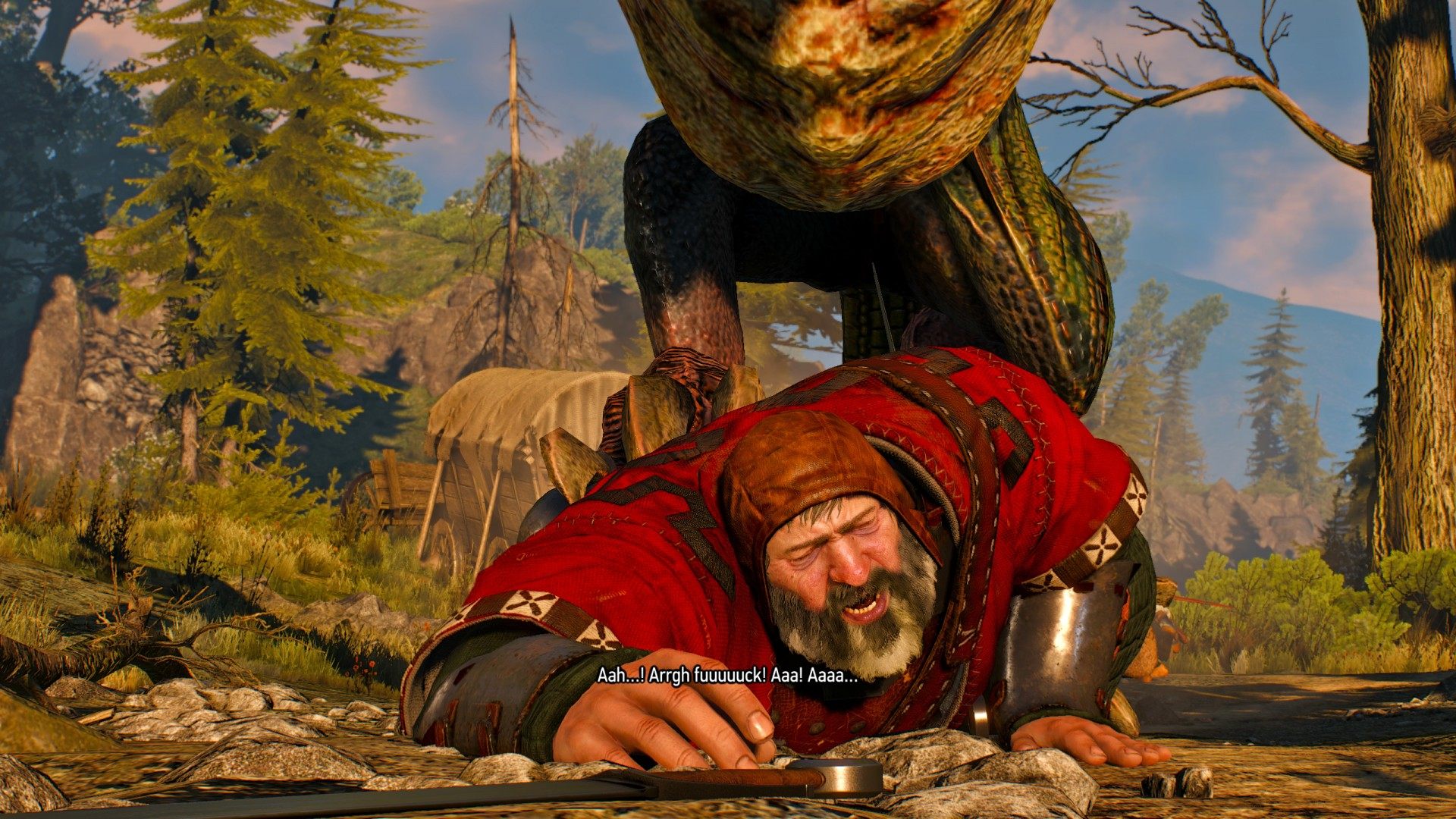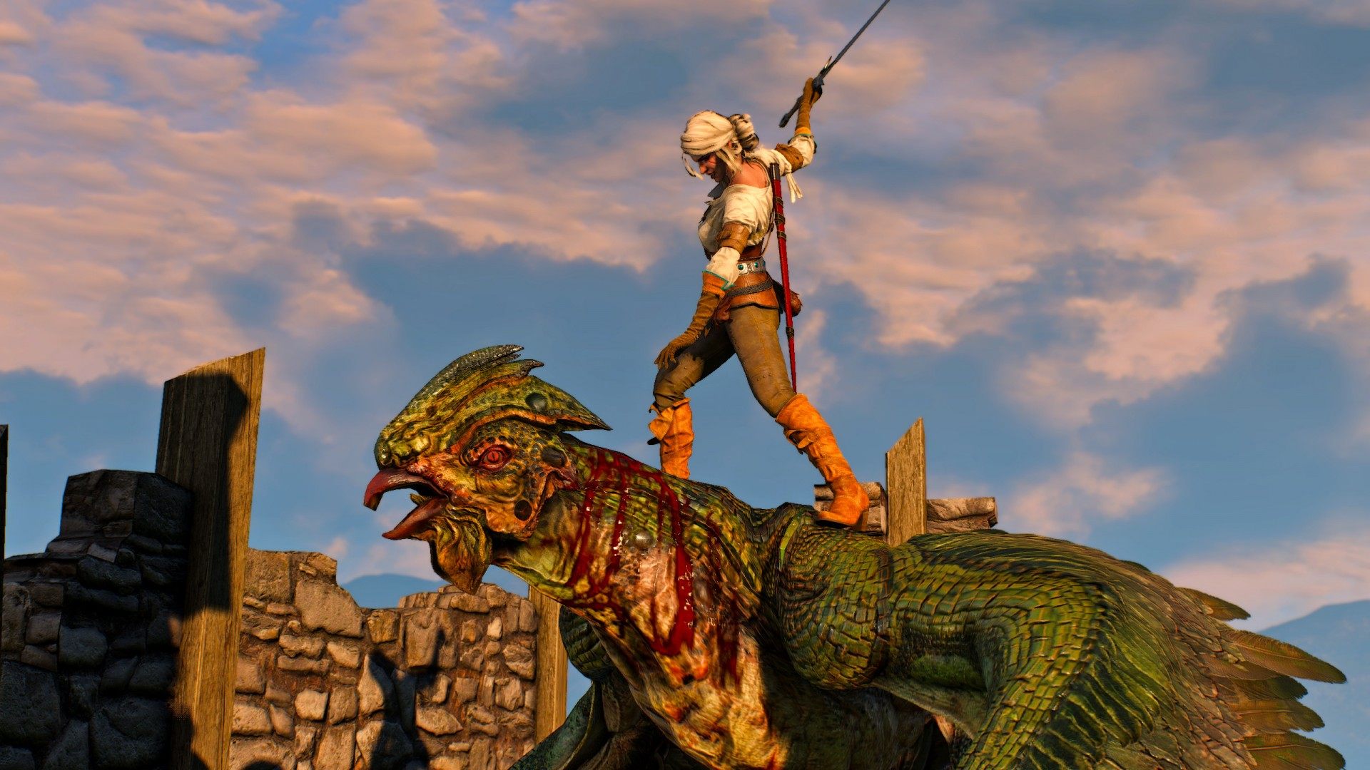 Ciri and the baron were testing their mettle in a horse race when a basilisk swooped down and put an end to the competition. The beast snatched the baron up and carried him off to its nest. Ciri, sparing no time for second thoughts, ran to his rescue.
