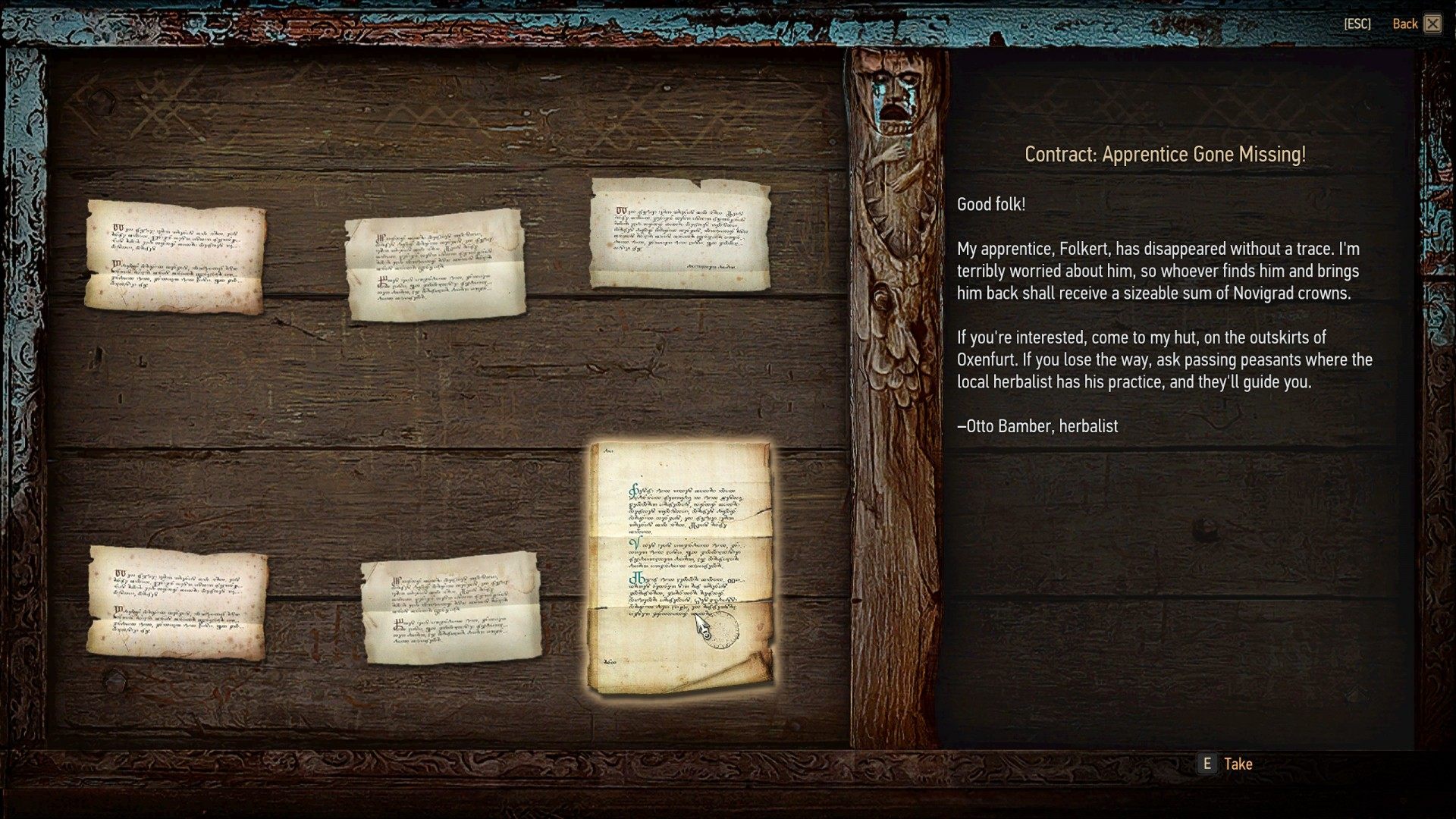 "Witcher" has become a synonym for "monster slayer" in many minds. While accurate as far as it goes, this does not encompass the whole truth, for witchers take on a broad variety of other tasks besides the slaying of monsters. For example, they sometimes use their superhuman senses to find missing persons. Such a lost individual was the subject of the notice hung by a certain Otto Bamber, an herbalist residing near Oxenfurt.